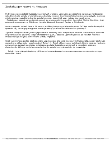 Zaskakujący raport nt. tłuszczu Podwyższona zawartość tłuszczów nasyconych w diecie, uznawana powszechnie za jedną z najbardziej szkodliwych dla układu krwionośnego cech diety typowej dla mieszkańców krajów rozwiniętych, może nie mieć związku z ryzykiem chorób układu krążenia, takimi jak udar mózgu czy zawał serca. Zaskakujący raport na ten temat pojawił się w czasopiśmie American Journal of Clinical Nutrition. Jego autorami są naukowcy z Children's Hospital Oakland Research Center w Oklahomie Autorzy raportu zebrali dane z 21 innych publikacji dotyczących łącznie ponad 347 tys. osób dorosłych i upewnili się, że uwzględniają one inne czynniki ryzyka chorób sercowo-naczyniowych. Zgodnie z dotychczasową wiedzą spożywanie znacznej ilości nasyconych kwasów tłuszczowych prowadzi do podwyższenia poziomu "złego cholesterolu" (LDL). Badania ujawniły jednak, że fakt ten nie musi mieść ścisłego związku z chorobami układu krążenia. Choć wyniki mogą zostać odebrane jako uspokajające dla osób stosujących tłustą dietę, należy zachować rozsądek w odżywianiu - przekonuje dr Robert H. Eckel, główny autor publikacji. Liczne badania naukowe potwierdzają związek pomiędzy zwiększoną podażą tłuszczów nasyconych a wzrostem poziomu cholesterolu, którego udział w rozwoju chorób układu krążenia wydaje się oczywisty. . Źródło: http://kopalniawiedzy.pl/tluszcz-tluszcze-kwasy-tluszczowe-zawal-serca-udar-udar-mozgudieta-9661.html http://solafide.dei.pl - SolaFide - Jedna Wiara | przykazania Boże, prawdziwy Powered kościół by Mambo Jezusa, powrót Jezusa, Boża łaska, sens życia Generated: 8 March, 2017, 17:07