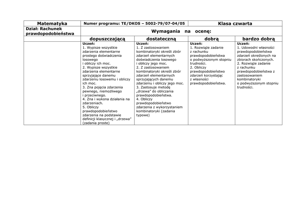 Matematyka Klasa czwarta Numer programu: TE/DKOS – 5002-79/07-04/05 Dział: Rachunek prawdopodobieństwa Wymagania dopuszczającą Uczeń: 1. Wypisze wszystkie zdarzenia elementarne prostego doświadczenia losowego i obliczy ich moc. 2. Wypisze wszystkie zdarzenia elementarne sprzyjające danemu zdarzeniu losowemu i obliczy ich moc. 3. Zna pojęcia zdarzenia pewnego, niemożliwego i przeciwnego. 4. Zna i wykona działania na zdarzeniach. 5. Obliczy prawdopodobieństwo zdarzenia na podstawie definicji klasycznej i „drzewa” (zadania proste) dostateczną Uczeń: 1. Z zastosowaniem kombinatoryki określi zbiór zdarzeń elementarnych doświadczenia losowego i obliczy jego moc. 2. Z zastosowaniem kombinatoryki określi zbiór zdarzeń elementarnych sprzyjających danemu zdarzeniu i obliczy jego moc. 3. Zastosuje metodę „drzewa” do obliczania prawdopodobieństwa. 4. Obliczy prawdopodobieństwo zdarzenia z wykorzystaniem kombinatoryki (zadania typowe) na ocenę: dobrą bardzo dobrą Uczeń: 1. Rozwiąże zadanie z rachunku prawdopodobieństwa o podwyższonym stopniu trudności. 2. Obliczy prawdopodobieństwo zdarzeń korzystając z własności prawdopodobieństwa. Uczeń: 1. Udowodni własności prawdopodobieństwa zdarzeń określonych na zbiorach skończonych. 2. Rozwiąże zadanie z rachunku prawdopodobieństwa z zastosowaniem kombinatoryki o podwyższonym stopniu trudności. Matematyka Dział: Statystyka Klasa czwarta Numer programu: TE/DKOS – 4015-99/02-04/05 dopuszczającą Uczeń: 1. Wykona podstawowe obliczenia procentowe. 2. Odczyta, zinterpretuje i przetworzy dane z diagramu słupkowego i wykresu liniowego. 3. Sporządzi diagram słupkowy. 4. Odczyta i zinterpretuje dane z diagramu procentowego. 5. Obliczy średnią arytmetyczną. 6. Wyznaczy medianę i dominantę. Wymagania dostateczną Uczeń: 1. Oceni zmianę wielkości, jaka nastąpiła, porówna wielkości i wyrazi zależności w procentach. 2. Uporządkuje i przedstawi dane w postaci dowolnego wykresu lub diagramu. 3. Odczyta diagram lub wykres dowolnego typu i zinterpretuje wyniki. 4. Odczyta i zinterpretuje lub przetworzy informacje z tabeli, tekstu. 5. Obliczy wariancję. 6. Obliczy odchylenie standardowe. na ocenę: dobrą Uczeń: 1. Wykona obliczenia procentowe o dużym stopniu złożoności w rozwiązywaniu zadań realistycznych. 2. Zbierze, uporządkuje i przedstawi graficznie dane własnego badania statystycznego. 3. Przedstawi analizę ilościową i jakościową przedstawionych danych. 4. Rozwiąże zadanie tekstowe, w którym występują obliczenia procentowe i ilościowe. 5. Zinterpretuje i porówna zależności podane w mediach. bardzo dobrą Uczeń: 1. Wykorzysta arkusz kalkulacyjny do sporządzania różnego rodzaju wykresów. 2. Rozwiąże zadanie problemowe(realistyczne) z zastosowaniem procentów. 3. Zbuduje model sytuacji z życia codziennego i przedstawi w postaci funkcji. 4. Uzasadnia wnioski wypływające z analizy statystycznej. Matematyka Dział: Powtórzenia do egzaminu maturalnego Treści programowe 1. Liczby rzeczywiste 2. Własności funkcji, 3. Funkcja liniowa 4. Funkcja kwadratowa 5. Wielomiany . 6. Funkcja wymierna 7. Funkcja wykładnicza i logarytmy. 8. Ciągi liczbowe– 9. Planimetria i trygonometria 10. Geometria analityczna 11. Geometria przestrzenna Testy sprawdzające: 1. Liczby rzeczywiste 2. Własności funkcji, funkcja liniowa i funkcja kwadratowa 3. Wielomiany i funkcje wymierne ,wykładnicze i ciągi liczbowe 4. Funkcje trygonometryczne, planimetria, geometria analityczna geometria przestrzenna – Numer programu: TE/DKOS – 5002-79/07-04/05 Wymagania na ocenę: dopuszczającą dostateczną Według standardów i opisu wymagań egzaminacyjnych z Informatora maturalnego. Poziomy wymagań edukacyjnych dostosowane są do obowiązującej skali ocen.