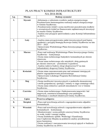 PLAN PRACY KOMISJI INFRASTRUKTURY NA 2016 ROK Lp. Miesiąc Rodzaj czynności 1. Styczeń -Informacja o wdrożeniu wyników audytu energetycznego. Przedstawienie harmonogramu realizacji audytu energetycznego w Gminie Szydłowiec. -Przedstawienie źródeł i ocena możliwości pozyskiwania środków z zewnętrznych źródeł na finansowanie zaplanowanych inwestycji na terenie Gminy Szydłowiec. -Analiza oraz przyjęcie sprawozdania z prac Komisji Infrastruktury za 2015 r. 2. Luty -Analiza stanu przygotowania zadań inwestycyjnych pod kątem zgodności z przyjętą Strategią Rozwoju Gminy Szydłowiec na lata 2015 – 2025. -Opracowanie Wieloletniego Planu Inwestycyjnego Gminy Szydłowiec. 3. Marzec -Prace nad realizacją Wieloletniego Planu Inwestycyjnego Gminy Szydłowiec – kontynuacja. -Ocena stanu technicznego budynków komunalnych po okresie zimowym. -Ocena stanu technicznego ulic miejskich i dróg gminnych po okresie zimowym – posiedzenie wyjazdowe. -Analiza wpływu budowy drogi ekspresowej S7 na stan infrastruktury drogowej Gminy Szydłowiec. 4. Kwiecień 5. Maj 6. Czerwiec 7. Lipiec 8. Sierpień -Praca nad nowelizacją uchwał o zagospodarowaniu odpadów komunalnych. 9. Wrzesień -Praca nad nowelizacją uchwał o zagospodarowaniu odpadów komunalnych – kontynuacja. -Monitorowanie i ocena polityki cenowej Gminy Szydłowiec za wodę, ścieki i energię cieplną. -Ocena działalności spółek: Wodociągi i Kanalizacja oraz Ciepłownia Miejska na podstawie analizy przedłożonej przez burmistrza. -Ocena realizacji i zaawansowania inwestycji ujętych w budżecie Gminy Szydłowiec na 2016 r. -Ocena stanu zaawansowania prac nad zmianami istniejących planów zagospodarowania przestrzennego. -Opracowanie Lokalnego Programu Rewitalizacji Gminy Szydłowiec. -Ocena możliwości inwestycyjnych w podstrefie ekonomicznej i strefie gospodarczej (postępy i zmiany w ciągu ostatniego roku). -Ocena stanu rolnictwa i potrzeb mieszkańców wsi w Gminie Szydłowiec. -Ocena stanu technicznego i funkcjonowania targowisk i hal targowych, cmentarza komunalnego oraz parkingów. -Informacja o zasobach lokalowych Gminy Szydłowiec. Przerwa urlopowa 10. Październik -Ocena wykonania remontów dróg – posiedzenie wyjazdowe. -Przedstawienie i opiniowanie wniosków budżetowych na 2017 r. 11. Listopad -Prace nad ustaleniem wysokości składek podatkowych na 2017 r. -Prace nad projektem budżetu na 2017 r. 12. Grudzień -Prace nad projektem budżetu na 2017 r. - kontynuacja. -Opracowanie planu pracy Komisji Infrastruktury na 2017 r. 13. Na bieżąco -Opiniowanie projektów uchwał i wniosków wymagających stanowiska Komisji Infrastruktury. Przewodniczący Komisji Arkadiusz Sokołowski
