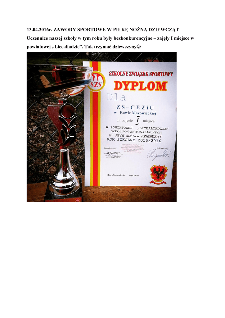 13.04.2016r. ZAWODY SPORTOWE W PIŁKĘ NOŻNĄ DZIEWCZĄT Uczennice naszej szkoły w tym roku były bezkonkurencyjne – zajęły I miejsce w powiatowej „Licealiadzie”. Tak trzymać dziewczyny