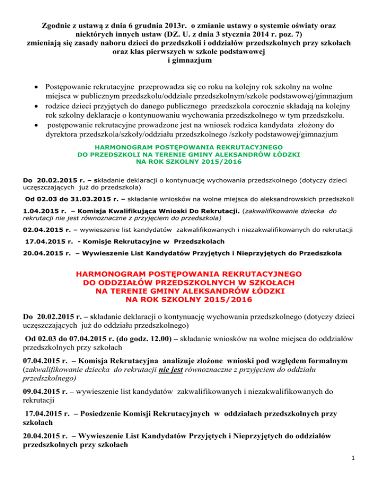 Zgodnie z ustawą z dnia 6 grudnia 2013r. o zmianie ustawy o systemie oświaty oraz niektórych innych ustaw (DZ. U. z dnia 3 stycznia 2014 r. poz. 7) zmieniają się zasady naboru dzieci do przedszkoli i oddziałów przedszkolnych przy szkołach oraz klas pierwszych w szkole podstawowej i gimnazjum Postępowanie rekrutacyjne przeprowadza się co roku na kolejny rok szkolny na wolne miejsca w publicznym przedszkolu/oddziale przedszkolnym/szkole podstawowej/gimnazjum rodzice dzieci przyjętych do danego publicznego przedszkola corocznie składają na kolejny rok szkolny deklaracje o kontynuowaniu wychowania przedszkolnego w tym przedszkolu. postępowanie rekrutacyjne prowadzone jest na wniosek rodzica kandydata złożony do dyrektora przedszkola/szkoły/oddziału przedszkolnego /szkoły podstawowej/gimnazjum HARMONOGRAM POSTĘPOWANIA REKRUTACYJNEGO DO PRZEDSZKOLI NA TERENIE GMINY ALEKSANDRÓW ŁÓDZKI NA ROK SZKOLNY 2015/2016 Do 20.02.2015 r. – składanie deklaracji o kontynuację wychowania przedszkolnego (dotyczy dzieci uczęszczających już do przedszkola) Od 02.03 do 31.03.2015 r. – składanie wniosków na wolne miejsca do aleksandrowskich przedszkoli 1.04.2015 r. – Komisja Kwalifikująca Wnioski Do Rekrutacji. (zakwalifikowanie dziecka do rekrutacji nie jest równoznaczne z przyjęciem do przedszkola) 02.04.2015 r. – wywieszenie list kandydatów zakwalifikowanych i niezakwalifikowanych do rekrutacji 17.04.2015 r. - Komisje Rekrutacyjne w Przedszkolach 20.04.2015 r. – Wywieszenie List Kandydatów Przyjętych i Nieprzyjętych do Przedszkola HARMONOGRAM POSTĘPOWANIA REKRUTACYJNEGO DO ODDZIAŁÓW PRZEDSZKOLNYCH W SZKOŁACH NA TERENIE GMINY ALEKSANDRÓW ŁÓDZKI NA ROK SZKOLNY 2015/2016 Do 20.02.2015 r. – składanie deklaracji o kontynuację wychowania przedszkolnego (dotyczy dzieci uczęszczających już do oddziału przedszkolnego) Od 02.03 do 07.04.2015 r. (do godz. 12.00) – składanie wniosków na wolne miejsca do oddziałów przedszkolnych przy szkołach 07.04.2015 r. – Komisja Rekrutacyjna analizuje złożone wnioski pod względem formalnym (zakwalifikowanie dziecka do rekrutacji nie jest równoznaczne z przyjęciem do oddziału przedszkolnego) 09.04.2015 r. – wywieszenie list kandydatów zakwalifikowanych i niezakwalifikowanych do rekrutacji 17.04.2015 r. – Posiedzenie Komisji Rekrutacyjnych w oddziałach przedszkolnych przy szkołach 20.04.2015 r. – Wywieszenie List Kandydatów Przyjętych i Nieprzyjętych do oddziałów przedszkolnych przy szkołach 1 KRYTERIA REKRUTACYJNE W pierwszym etapie rekrutacji do przedszkoli/oddziałów przedszkolnych przyjmujemy w pierwszej kolejności: Kryteria ustawowe zgodnie z art. 20c ust. 2i 3 ustawy z dnia 6 grudnia 2013 roku o systemie oświaty i zmianie niektórych innych ustaw (DZ.U. z 2014, poz.7) - dzieci zamieszkałe na terenie gminy Aleksandrów Łódzki - dzieci 6 i 5 letnie - wielodzietność rodziny kandydata - niepełnosprawność kandydata - niepełnosprawność jednego z rodziców kandydata - niepełnosprawność obojga rodziców kandydata - niepełnosprawność rodzeństwa kandydata - samotne wychowywanie kandydata w rodzinie - objęcie kandydata pieczą zastępczą (kryteria ustawowe są równorzędne i muszą być potwierdzone wymaganymi w w/w ustawie dokumentami) Kryteria określone przez organ prowadzący: Ustala się następujące kryteria drugiego etapu postępowania rekrutacyjnego, na wolne miejsca w publicznych przedszkolach i oddziałach przedszkolnych przy szkołach, dla których Gmina Aleksandrów Łódzki jest organem prowadzącym wraz z liczbą punktów : 1) Dziecko obojga rodziców pracujących ( w tym wykonujących pracę na podstawie umowy cywilnoprawnej)/studiujących w systemie stacjonarnym z udokumentowanym zatrudnieniem/studiowaniem – 4 pkt., 2) Dziecko zgłaszane na pobyt dłuższy niż 5 godzin dziennie – 2 pkt. 3) Dziecko, którego rodzice/ rodzic samotnie wychowujący dziecko rozliczają podatek dochodowy od osób fizycznych jako mieszkaniec Gminy Aleksandrów Łódzki – 3 pkt. 4) Rodzeństwo dziecka kontynuującego w przedszkolu pierwszego wyboru - 1 pkt. wychowanie przedszkolne 5) Dzieci posiadające orzeczenia o potrzebie kształcenia specjalnego –4 pkt. (kryterium dotyczy Miejskiego Przedszkola Nr 2 im. Juliana Tuwima w Aleksandrowie Łódzkim) 2 Do deklaracji o kontynuowaniu wychowania przedszkolnego oraz do wniosku dołącza się: 1) Dokumenty potwierdzające spełnianie przez kandydata kryteriów, o których mowa w art. 7b ust. 1b, art. 20c ust.2, art. 20f ust.4, art. 20g ust.2, art. 20h ust.3 i 7, art. 20i ust.3, art. 20j ust.3, art. 20k ust.2, art. 20n ust.5, art. 20o ust.3, art. 20p ust. 1 pkt 1 i 2, art. 20q ust.1 i art. 20r ust.3, odpowiednio: a) oświadczenie o wielodzietności rodziny kandydata, b) orzeczenie o potrzebie kształcenia specjalnego wydane ze względu na niepełnosprawność, orzeczenie o niepełnosprawności lub o stopniu niepełnosprawności lub orzeczenie równoważne w rozumieniu przepisów ustawy z dnia 27 sierpnia 1997 r. o rehabilitacji zawodowej i społecznej oraz zatrudnianiu osób niepełnosprawnych, c) prawomocny wyrok sądu rodzinnego orzekający rozwód lub separację lub akt zgonu oraz oświadczenie o samotnym wychowywaniu dziecka oraz niewychowywaniu żadnego dziecka wspólnie z jego rodzicem, d) dokument poświadczający objęcie dziecka pieczą zastępczą zgodnie z ustawą z dnia 9 czerwca 2011 r. o wspieraniu rodziny i systemie pieczy zastępczej; 2) dokumenty potwierdzające spełnianie przez kandydata kryteriów określonych przez organ prowadzący, o których mowa w art. 20c ust.4, art. 20e ust.3, art. 20o ust.4 i art.20p ust.1 pkt 3; 3) opinie wydaną przez publiczną poradnię psychologiczno-pedagogiczną, w tym publiczną poradnię specjalistyczną w sprawie pierwszeństwa o przyjęciu kandydata z problemami zdrowotnymi. 4) akt urodzenia dziecka (do wglądu) Dokumenty, o których mowa w pkt 1 a), b), c), d) składane są w ory