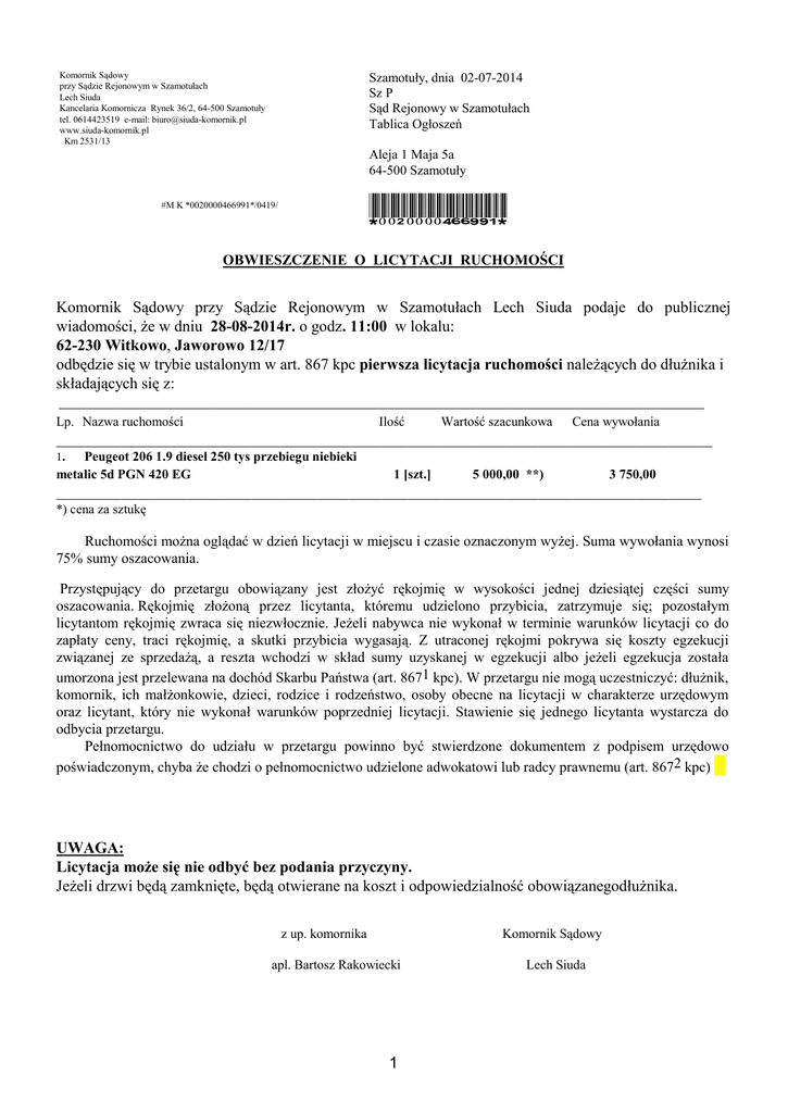 Komornik Sądowy przy Sądzie Rejonowym w Szamotułach Lech Siuda Kancelaria Komornicza Rynek 36/2, 64-500 Szamotuły tel. 0614423519 e-mail: [email protected] www.siuda-komornik.pl Km 2531/13 Szamotuły, dnia 02-07-2014 Sz P Sąd Rejonowy w Szamotułach Tablica Ogłoszeń Aleja 1 Maja 5a 64-500 Szamotuły *0020000466991* #M K *0020000466991*/0419/ OBWIESZCZENIE O LICYTACJI RUCHOMOŚCI Komornik Sądowy przy Sądzie Rejonowym w Szamotułach Lech Siuda podaje do publicznej wiadomości, że w dniu 28-08-2014r. o godz. 11:00 w lokalu: 62-230 Witkowo, Jaworowo 12/17 odbędzie się w trybie ustalonym w art. 867 kpc pierwsza licytacja ruchomości należących do dłużnika i składających się z: _______________________________________________________________________________________________________________________ Lp. Nazwa ruchomości Ilość Wartość szacunkowa Cena wywołania _________________________________________________________________________________________________________________________ 1. Peugeot 206 1.9 diesel 250 tys przebiegu niebieki metalic 5d PGN 420 EG 1 [szt.] 5 000,00 **) 3 750,00 _______________________________________________________________________________________________________________________ *) cena za sztukę Ruchomości można oglądać w dzień licytacji w miejscu i czasie oznaczonym wyżej. Suma wywołania wynosi 75% sumy oszacowania. Przystępujący do przetargu obowiązany jest złożyć rękojmię w wysokości jednej dziesiątej części sumy oszacowania. Rękojmię złożoną przez licytanta, któremu udzielono przybicia, zatrzymuje się; pozostałym licytantom rękojmię zwraca się niezwłocznie. Jeżeli nabywca nie wykonał w terminie warunków licytacji co do zapłaty ceny, traci rękojmię, a skutki przybicia wygasają. Z utraconej rękojmi pokrywa się koszty egzekucji związanej ze sprzedażą, a reszta wchodzi w skład sumy uzyskanej w egzekucji albo jeżeli egzekucja została umorzona jest przelewana na dochód Skarbu Państwa (art. 8671 kpc). W przetargu nie mogą uczestniczyć: dłużnik, komornik, ich małżonkowie, dzieci, rodzice i rodzeństwo, osoby obecne na licytacji w charakterze urzędowym oraz licytant, który nie wykonał warunków poprzedniej licytacji. Stawienie się jednego licytanta wystarcza do odbycia przetargu. Pełnomocnictwo do udziału w przetargu powinno być stwierdzone dokumentem z podpisem urzędowo poświadczonym, chyba że chodzi o pełnomocnictwo udzielone adwokatowi lub radcy prawnemu (art. 8672 kpc) UWAGA: Licytacja może się nie odbyć bez podania przyczyny. Jeżeli drzwi będą zamknięte, będą otwierane na koszt i odpowiedzialność obowiązanegodłużnika. z up. komornika Komornik Sądowy apl. Bartosz Rakowiecki 1 Lech Siuda Adresat oryginału: Sąd Rejonowy w Szamotułach Tablica Ogłoszeń 2