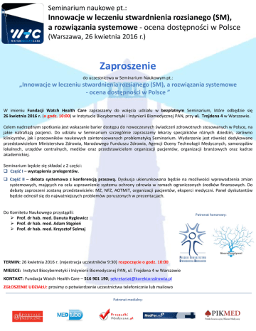 Seminarium naukowe pt.: Innowacje w leczeniu stwardnienia rozsianego (SM), a rozwiązania systemowe - ocena dostępności w Polsce (Warszawa, 26 kwietnia 2016 r.) Zaproszenie do uczestnictwa w Seminarium Naukowym pt.: „Innowacje w leczeniu stwardnienia rozsianego (SM), a rozwiązania systemowe - ocena dostępności w Polsce ” W imieniu Fundacji Watch Health Care zapraszamy do wzięcia udziału w bezpłatnym Seminarium, które odbędzie się 26 kwietnia 2016 r. (o godz. 10:00) w Instytucie Biocybernetyki i Inżynierii Biomedycznej PAN, przy ul. Trojdena 4 w Warszawie. Celem nadrzędnym spotkania jest wskazanie barier dostępu do nowoczesnych świadczeń zdrowotnych stosowanych w Polsce, na jakie natrafiają pacjenci. Do udziału w Seminarium szczególnie zapraszamy lekarzy specjalistów różnych dziedzin, zarówno klinicystów, jak i pracowników naukowych zainteresowanych problematyką Seminarium. Wydarzenie jest również dedykowane przedstawicielom Ministerstwa Zdrowia, Narodowego Funduszu Zdrowia, Agencji Oceny Technologii Medycznych, samorządów lokalnych, urzędów centralnych, mediów oraz przedstawicielom organizacji pacjentów, organizacji branżowych oraz kadrze akademickiej. Seminarium będzie się składać z 2 części: Część I – wystąpienia prelegentów. Część II – debata systemowa z konferencją prasową. Dyskusja ukierunkowana będzie na możliwości wprowadzenia zmian systemowych, mających na celu usprawnienie systemu ochrony zdrowia w ramach ograniczonych środków finansowych. Do debaty zaproszeni zostaną przedstawiciele: MZ, NFZ, AOTMiT, organizacji pacjentów, eksperci medyczni. Panel dyskutantów będzie odnosił się do najważniejszych problemów poruszonych w prezentacjach. Do Komitetu Naukowego przystąpili: Prof. dr hab. med. Danuta Ryglewicz Prof. dr hab. med. Adam Stępień Prof. dr hab. med. Krzysztof Selmaj Patronat honorowy: TERMIN: 26 kwietnia 2016 r. (rejestracja uczestników 9:30) rozpoczęcie o godz. 10:00 MIEJSCE: Instytut Biocybernetyki i Inżynierii Biomedycznej PAN, ul. Trojdena 4 w Warszawie KONTAKT: Fundacja Watch Health Care – 516 901 190; [email protected] ZGŁOSZENIE UDZIAŁU: prosimy o potwierdzenie uczestnictwa telefonicznie lub mailowo Patronat medialny: Seminarium naukowe pt.: Innowacje w leczeniu stwardnienia rozsianego (SM), a rozwiązania systemowe - ocena dostępności w Polsce (Warszawa, 26 kwietnia 2016 r.) PROGRAM SEMINARIUM 9:30-10:00 Rejestracja uczestników 10:00-10:05 Otwarcie: przedstawienie Komitetu Naukowego oraz uczestników debaty, powitanie gości 10:05-10:20 Wystąpienie Pani Maliny Wieczorek – organizatora Kampanii „SM-Walcz o siebie” 10:20-10:30 Wystąpienie przedstawiciela Ministerstwa Zdrowia*, Narodowego Funduszu Zdrowia* (w oczekiwaniu na potwierdzenie) 10:30-10:45 Prof. dr hab. n. med. Danuta Ryglewicz – Diagnostyka i leczenie SM w Polsce 10:45-11:00 Dr n med. Waldemar Brola – Ogólnopolski rejestr pacjentów chorych na SM 11:00-11:20 Prof. dr hab. n. med. Adam Stępień – Strategia postępowania terapeutycznego. Rola czasu włączenia do terapii i jego wpływ na wyniki leczenia* 11:20-11:40 Prof. dr hab. n. med. Krzysztof Selmaj – Skuteczne leczenie to brak objawów aktywności choroby - innowacje w leczeniu SM 11:40-11:55 Prof. dr hab. n. med. Sławomira Kyrcz-Krzemień – Skuteczność i bezpieczeństwo przeszczepiania autologicznych macierzystych komórek krwiotwórczych, w postaci rzutowo remitującej stwardnienia rozsianego 11:55-12:15 Przerwa kawowa 12:15-12:35 Anthony Barron – Leczenie SM w Polsce na tle Europy – najnowsze wyniki badania Charles River Associates Consulting (tłumaczenie konsekutywne) 12:35-12:55 Dr n. med. Jerzy Gryglewicz – SM – Zarządzanie chorobą – propozycje rozwiązań systemowych dla poprawy opieki nad pacjentem z SM 12:55-13:15 Magdalena Fac-Skhirtladze – CZAS MA ZNACZENIE – propozycje poprawy opieki nad pacjentem z SM 13:15-14:15 Dyskusja z konferencją prasową z udziałem zaproszonych prelegentów, dotycząca możliwości poprawy dostępu do leczenia stwardnienia rozsianego w Polsce. W dyskusji oprócz zaproszonych prelegentów udział wezmą: Posłanka Anna Kwiecień (Przewodnicząca Parlamentarnego Zespołu ds. SM), prof. dr hab. n. med. Halina BartosikPsujek, Tomasz Połeć (Przewodniczący PTSR). Dyskusję poprowadzi red. Renata Furman 14:15-14:30 Poczęstunek i dyskusje nieformalne w foyer * W oczekiwaniu na potwierdzenie wystąpienia/tytułu wystąpienia Patronat honorowy: TERMIN: 26 kwietnia 2016 r. (rejestracja uczestników 9:30) rozpoczęcie o godz. 10:00 MIEJSCE: Instytut Biocybernetyki i Inżynierii Biomedycznej PAN, ul. Trojdena 4 w Warszawie KONTAKT: Fundacja Watch Health Care – 516 901 190; [email protected] ZGŁOSZENIE UDZIAŁU: prosimy o potwierdzenie uczestnictwa telefonicznie lub mailowo Patronat medialny: