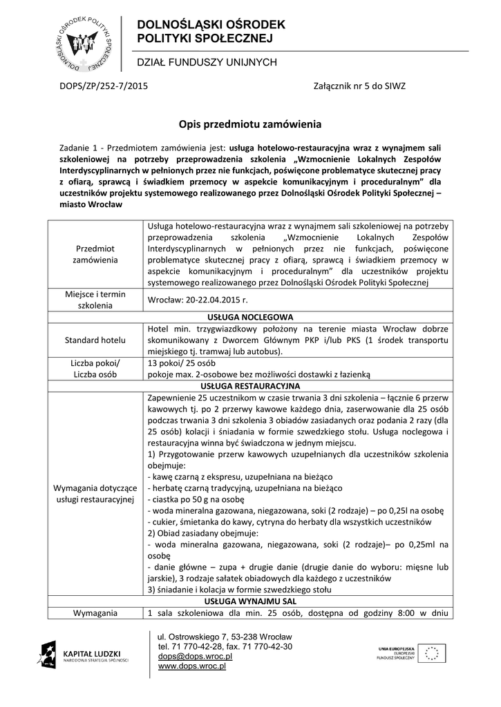 DOLNOŚLĄSKI OŚRODEK POLITYKI SPOŁECZNEJ DZIAŁ FUNDUSZY UNIJNYCH DOPS/ZP/252-7/2015 Załącznik nr 5 do SIWZ Opis przedmiotu zamówienia Zadanie 1 - Przedmiotem zamówienia jest: usługa hotelowo-restauracyjna wraz z wynajmem sali szkoleniowej na potrzeby przeprowadzenia szkolenia „Wzmocnienie Lokalnych Zespołów Interdyscyplinarnych w pełnionych przez nie funkcjach, poświęcone problematyce skutecznej pracy z ofiarą, sprawcą i świadkiem przemocy w aspekcie komunikacyjnym i proceduralnym” dla uczestników projektu systemowego realizowanego przez Dolnośląski Ośrodek Polityki Społecznej – miasto Wrocław Przedmiot zamówienia Miejsce i termin szkolenia Standard hotelu Liczba pokoi/ Liczba osób Wymagania dotyczące usługi restauracyjnej Wymagania Usługa hotelowo-restauracyjna wraz z wynajmem sali szkoleniowej na potrzeby przeprowadzenia szkolenia „Wzmocnienie Lokalnych Zespołów Interdyscyplinarnych w pełnionych przez nie funkcjach, poświęcone problematyce skutecznej pracy z ofiarą, sprawcą i świadkiem przemocy w aspekcie komunikacyjnym i proceduralnym” dla uczestników projektu systemowego realizowanego przez Dolnośląski Ośrodek Polityki Społecznej Wrocław: 20-22.04.2015 r. USŁUGA NOCLEGOWA Hotel min. trzygwiazdkowy położony na terenie miasta Wrocław dobrze skomunikowany z Dworcem Głównym PKP i/lub PKS (1 środek transportu miejskiego tj. tramwaj lub autobus). 13 pokoi/ 25 osób pokoje max. 2-osobowe bez możliwości dostawki z łazienką USŁUGA RESTAURACYJNA Zapewnienie 25 uczestnikom w czasie trwania 3 dni szkolenia – łącznie 6 przerw kawowych tj. po 2 przerwy kawowe każdego dnia, zaserwowanie dla 25 osób podczas trwania 3 dni szkolenia 3 obiadów zasiadanych oraz podania 2 razy (dla 25 osób) kolacji i śniadania w formie szwedzkiego stołu. Usługa noclegowa i restauracyjna winna być świadczona w jednym miejscu. 1) Przygotowanie przerw kawowych uzupełnianych dla uczestników szkolenia obejmuje: - kawę czarną z ekspresu, uzupełniana na bieżąco - herbatę czarną tradycyjną, uzupełniana na bieżąco - ciastka po 50 g na osobę - woda mineralna gazowana, niegazowana, soki (2 rodzaje) – po 0,25l na osobę - cukier, śmietanka do kawy, cytryna do herbaty dla wszystkich uczestników 2) Obiad zasiadany obejmuje: - woda mineralna gazowana, niegazowana, soki (2 rodzaje)– po 0,25ml na osobę - danie główne – zupa + drugie danie (drugie danie do wyboru: mięsne lub jarskie), 3 rodzaje sałatek obiadowych dla każdego z uczestników 3) śniadanie i kolacja w formie szwedzkiego stołu USŁUGA WYNAJMU SAL 1 sala szkoleniowa dla min. 25 osób, dostępna od godziny 8:00 w dniu ul. Ostrowskiego 7, 53-238 Wrocław tel. 71 770-42-28, fax. 71 770-42-30 [email protected] www.dops.wroc.pl DOLNOŚLĄSKI OŚRODEK POLITYKI SPOŁECZNEJ DZIAŁ FUNDUSZY UNIJNYCH dotyczące sali Obowiązki Wykonawcy rozpoczęcia zjazdu do godziny 17:00 w dniu zakończenia szkolenia podczas każdego z 3 dni szkoleniowych. Rezerwacja 1 sali na 3 dni szkolenia. Sale muszą być wyposażone w sprzęt multimedialny (laptop, rzutnik, nagłośnienie) oraz tablice z artykułami piśmienniczymi (kreda/pisaki) jak również wyposażona w adekwatną do liczby uczestników szkolenia liczbę miejsc siedzących oraz stolików. Stoliki i krzesła winny być ustawione w podkowę. Zamawiający wymaga aby zaproponowane sale wyposażone były w odpowiednio, spełniające wymogi bhp oświetlenie oraz okna umożliwiające wietrzenie pomieszczeń lub sprawną klimatyzację. Zamawiający nie uzna za pomieszczenia wykładowe zaadaptowanych pomieszczeń jadalnych, korytarzy, wnęk, pomieszczeń piwnicznych. WYMAGANIA DODATKOWE W TRAKCIE REALIZACJI ZADANIA 1. Zakwaterowanie w hotelu uczestników szkolenia do godziny 14:00 w dniu przyjazdu oraz wymeldowania uczestników do godziny 12:00 w dniu wyjazdu 2. Realizacja poszczególnych usług (noclegowych, restauracyjnych, sala) w jednym miejscu 3. Utrzymanie czystości w salach przez wszystkie dni szkolenia i bieżące uzupełnianie środków higieny (mydło, papier toaletowy) w toaletach przy salach ćwiczeniowych w trakcie wszystkich dni szkolenia 4. Złożenie Zamawiającemu sprawozdania merytorycznego w terminie 5 dni roboczych od zakończenia szkolenia 5. Oznakowanie miejsca szkolenia oraz sal wykładowych (flagi, plakaty i banery) podczas trwania szkolenia Zadanie 2 - Przedmiotem zamówienia jest: usługa hotelowo-restauracyjna wraz z wynajmem sali szkoleniowej na potrzeby przeprowadzenia szkolenia „Wzmocnienie Lokalnych Zespołów Interdyscyplinarnych w pełnionych przez nie funkcjach, poświęcone problematyce skutecznej pracy z ofiarą, sprawcą i świadkiem przemocy w aspekcie komunikacyjnym i proceduralnym” dla uczestników projektu systemowego realizowanego przez Dolnośląski Ośrodek Polityki Społecznej – miasto Jelenia Góra Przedmiot zamówienia Miejsce i termin szkolenia Standard hotelu Liczba pokoi/ Liczba osób Wymagania dotyczące usługi restauracyjnej Usługa hotelowo-restauracyjna wraz z wynajmem sali szkoleniowej na potrzeby przeprowadzenia szkolenia „Wzmocnienie Lokalnych Zespołów Interdyscyplinarnych w pełnionych przez nie funkcjach, poświęcone problematyce skutecznej pracy z ofiarą, sprawcą i świadkiem przemocy w aspekcie komunikacyjnym i proceduralnym” dla uczestników projektu systemowego realizowanego przez Dolnośląski Ośrodek Polityki Społecznej Jelenia Góra: 7-9.04.2015 r. USŁUGA NOCLEGOWA Hotel min. trzygwiazdkowy położony na terenie miasta Jelenia Góra dobrze skomunikowany z Dworcem Głównym PKP i/lub PKS (1 środek transportu miejskiego tj. autobus). 13 pokoi/ 25 osób pokoje max. 2-osobowe bez możliwości dostawki z łazienką USŁUGA RESTAURACYJNA Zapewnienie 25 uczestnikom w czasie trwania 3 dni szkolenia – łącznie 6 przerw kawowych tj. po 2 przerwy kawowe każdego dnia, zaserwowanie dla 25 osób podczas trwania 3 dni szkolenia 3 obiadów zasiadanych oraz podania 2 razy (