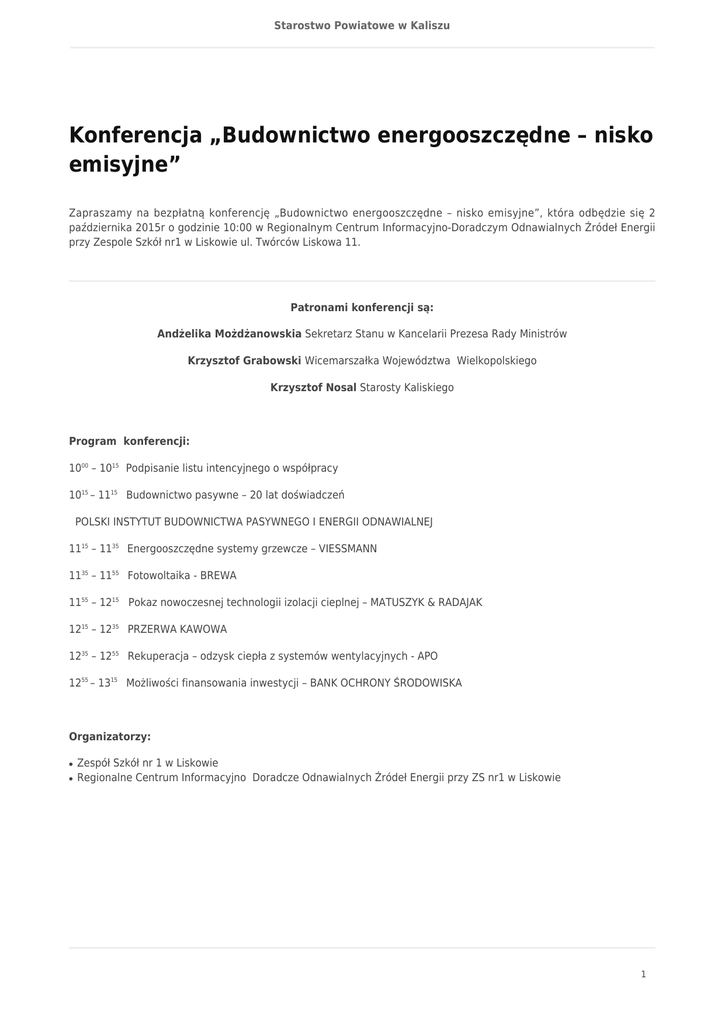 Starostwo Powiatowe w Kaliszu Konferencja „Budownictwo energooszczędne – nisko emisyjne” Zapraszamy na bezpłatną konferencję „Budownictwo energooszczędne – nisko emisyjne”, która odbędzie się 2 października 2015r o godzinie 10:00 w Regionalnym Centrum Informacyjno-Doradczym Odnawialnych Źródeł Energii przy Zespole Szkół nr1 w Liskowie ul. Twórców Liskowa 11. Patronami konferencji są: Andżelika Możdżanowskia Sekretarz Stanu w Kancelarii Prezesa Rady Ministrów Krzysztof Grabowski Wicemarszałka Województwa Wielkopolskiego Krzysztof Nosal Starosty Kaliskiego Program konferencji: 1000 – 1015 Podpisanie listu intencyjnego o współpracy 1015 – 1115 Budownictwo pasywne – 20 lat doświadczeń POLSKI INSTYTUT BUDOWNICTWA PASYWNEGO I ENERGII ODNAWIALNEJ 1115 – 1135 Energooszczędne systemy grzewcze – VIESSMANN 1135 – 1155 Fotowoltaika - BREWA 1155 – 1215 Pokaz nowoczesnej technologii izolacji cieplnej – MATUSZYK & RADAJAK 1215 – 1235 PRZERWA KAWOWA 1235 – 1255 Rekuperacja – odzysk ciepła z systemów wentylacyjnych - APO 1255 – 1315 Możliwości finansowania inwestycji – BANK OCHRONY ŚRODOWISKA Organizatorzy: ● ● Zespół Szkół nr 1 w Liskowie Regionalne Centrum Informacyjno Doradcze Odnawialnych Źródeł Energii przy ZS nr1 w Liskowie 1