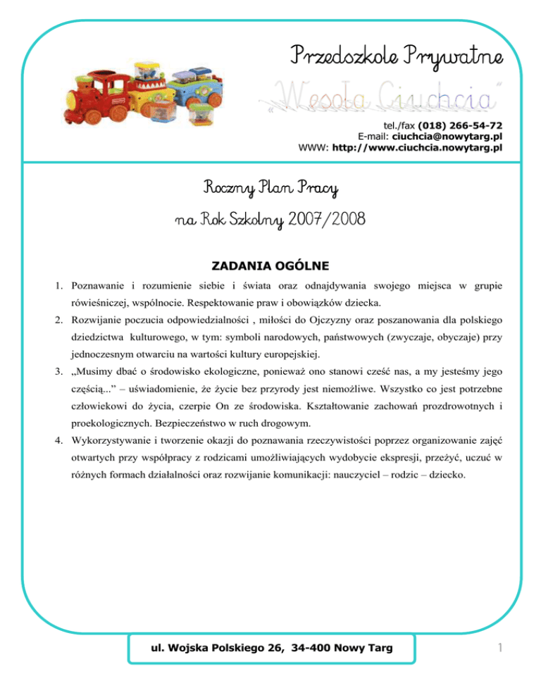 Przedszkole Prywatne tel./fax (018) 266-54-72 E-mail: [email protected] WWW: http://www.ciuchcia.nowytarg.pl Roczny Plan Pracy na Rok Szkolny 2007 2007/2008 /2008 ZADANIA OGÓLNE 1. Poznawanie i rozumienie siebie i świata oraz odnajdywania swojego miejsca w grupie rówieśniczej, wspólnocie. Respektowanie praw i obowiązków dziecka. 2. Rozwijanie poczucia odpowiedzialności , miłości do Ojczyzny oraz poszanowania dla polskiego dziedzictwa kulturowego, w tym: symboli narodowych, państwowych (zwyczaje, obyczaje) przy jednoczesnym otwarciu na wartości kultury europejskiej. 3. „Musimy dbać o środowisko ekologiczne, ponieważ ono stanowi cześć nas, a my jesteśmy jego częścią...” – uświadomienie, że życie bez przyrody jest niemożliwe. Wszystko co jest potrzebne człowiekowi do życia, czerpie On ze środowiska. Kształtowanie zachowań prozdrowotnych i proekologicznych. Bezpieczeństwo w ruch drogowym. 4. Wykorzystywanie i tworzenie okazji do poznawania rzeczywistości poprzez organizowanie zajęć otwartych przy współpracy z rodzicami umożliwiających wydobycie ekspresji, przeżyć, uczuć w różnych formach działalności oraz rozwijanie komunikacji: nauczyciel – rodzic – dziecko. ul. Wojska Polskiego 26, 34-400 Nowy Targ 1 Przedszkole Prywatne tel./fax (018) 266-54-72 E-mail: [email protected] WWW: http://www.ciuchcia.nowytarg.pl 1. Poznawanie i rozumienie siebie i świata oraz odnajdywania swojego miejsca w grupie rówieśniczej, wspólnocie. Respektowanie praw i obowiązków dziecka. A. Doskonalenie nauczycieli: 1. Zapoznanie z literaturą: - Deklaracja Praw Dziecka - Konwencja o prawach dziecka - E. Fundowicz „Prawa dziecka, czy prawa człowieka?” - aktualne artykuły z czasopism: „Bliżej Przedszkola”, „Wychowanie w Przedszkolu” - Program profilaktyczny przedszkola - Program wychowawczy przedszkola - E. Czyż „Dziecko i jego prawa”, „Moje prawa” B. Doskonalenie warsztatu pracy: 1. Gromadzenie literatury dla dzieci, artykułów, obrazów, na temat umiejętności poprawnego i kulturowego zachowania się. 2. Gromadzenie artykułów, literatury o Konwencji Praw Dziecka. C. Praca z wychowankami i rodzicami: TREŚCI PROGRAMOWE SPOSOBY REALIZACJI Promowanie działań kształtujących szacunek do każdego człowieka oraz pomoc w budowaniu pozytywnego obrazu własnego „Ja” i zaspokojeniu poczucia Wspólne i zgodne zabawy z rówieśnikami (w parach, w małych zespołach, w większych zespołach). Wdrażanie do podporządkowania się ustalonym normom postępowania w grupie ul. Wojska Polskiego 26, 34-400 Nowy Targ 2 Przedszkole Prywatne tel./fax (018) 266-54-72 E-mail: [email protected] WWW: http://www.ciuchcia.nowytarg.pl rówieśniczej. Odnajdywanie swojego miejsca w grupie rówieśniczej. Dostarczenie przykładów i doświadczenie rozwiązywania sytuacji konfliktowych na zasadzie kompromisu i akceptacji potrzeb innych osób. Uczenie nawiązywania bliskiego, serdecznego kontaktu z innymi osobami, a także uczenie sposobów radzenia sobie z własnymi emocjami, właściwego reagowania na przejawy emocji innych oraz kontrolowania zachowań. Wprowadzenie elementów socjoterapii i terapii aktywnej. Tworzenie okazji do wspólnego podejmowania i realizowania różnych zadań, rozwiązywania problemów. Wyrabianie nawyków higienicznych: mycie rąk, mycie zębów, sprzątanie po zakończonej Troska o zdrowie dziecka. pracy, samodzielne ubieranie się oraz samodzielne obsługiwanie się posiłku. Rozumienie i przeżywanie pojęć: dobro, prawda, miłość, piękno, przyjaźń, koleżeństwo na podstawie bajek, baśni. Wprowadzenie dziecka w świat wartości Wzbudzanie emocji poprzez udział w uniwersalnych. przedstawieniach inscenizowanych bezpośrednio przez aktorów. Zorganizowanie kącika bajek, baśni oraz wierszy przy pomocy odpowiednich ilustracji. Prawa dziecka. Rozmowy i działania w oparciu o książkę „Moje prawa”. Wykonanie gazetki z fotografii dzieci pt. „jesteśmy przedszkolakami mamy swoje Uświadomienie dzieciom, że ludzi nie można prawa.” różnicować ze względu na kolor skóry, pleć, Umiejętne wyjaśnianie terminu „prawo” w pochodzenie, wyznanie, język. oparciu o zabawę „Znamy swoje prawa”. Poznanie praw swoich i swoich kolegów. Wspomaganie dzieci wymagających pomocy. Nauka zauważania odmienności drugiego człowieka i jej akceptacji. ul. Wojska Polskiego 26, 34-400 Nowy Targ 3 Przedszkole Prywatne tel./fax (018) 266-54-72 E-mail: [email protected] WWW: http://www.ciuchcia.nowytarg.pl 2. Rozwijanie poczucia odpowiedzialności , miłości do Ojczyzny oraz poszanowania dla polskiego dziedzictwa kulturowego, w tym: symboli narodowych, państwowych (zwyczaje, obyczaje) przy jednoczesnym otwarciu na wartości kultury europejskiej. A. Doskonalenie nauczycieli: 1. Zapoznanie z literaturą: - R. Chyba „Edukacja regionalna” - Album Nowego Targu - L. Michalikowa „Tradycyjne zabawy ludowe”, W-wa 1981 - aktualne artykuły z czasopism: „Bliżej Przedszkola”, „Wychowanie w Przedszkolu” B. Doskonalenie warsztatu pracy: 1. Wzbogacenie kącika regionalnego w zabawki i sprzęty z dawnych lat. 2. Gromadzenie folderów, literatury i czasopism dotyczących miasta Nowy Targ oraz regionu Podhale. C. Praca z wychowankami i rodzicami: TREŚCI PROGRAMOWE Rozwijanie poczucia własnej tożsamości narodowej. Kształtowanie szacunku i SPOSOBY REALIZACJI Zapoznanie zarysem mapy Polski i regionu Podhala oraz symbolami narodowymi: godło, flaga, hymn. Poznanie legendy o Czechu, Lechu i Rusie, legendy Podhala, poznanie gwary góralskiej, nauka podstawowych zwrotów. Słuchanie melodii ludowych z płyt, kaset magnetofonowych. Wyszukiwanie państw na mapie Europy. ul. Wojska Polskiego 26, 34-400 Nowy Targ 4 Przedszkole Prywatne tel./fax (018) 266-54-72 E-mail: [email protected] WWW: http://www.ciuchcia.nowytarg.pl tolerancji dla przedstawicieli innych narodowości. Poznawanie symboli Unii Europejskiej, flagi, hymnu. Poznan