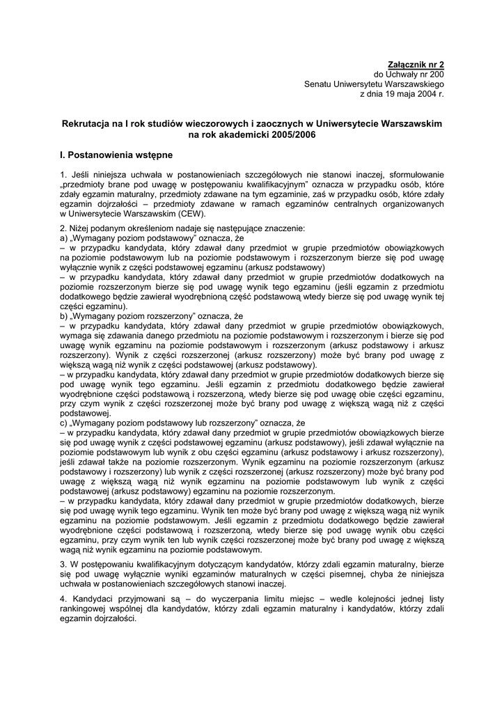 Załącznik nr 2 do Uchwały nr 200 Senatu Uniwersytetu Warszawskiego z dnia 19 maja 2004 r. Rekrutacja na I rok studiów wieczorowych i zaocznych w Uniwersytecie Warszawskim na rok akademicki 2005/2006 I. Postanowienia wstępne 1. Jeśli niniejsza uchwała w postanowieniach szczegółowych nie stanowi inaczej, sformułowanie „przedmioty brane pod uwagę w postępowaniu kwalifikacyjnym” oznacza w przypadku osób, które zdały egzamin maturalny, przedmioty zdawane na tym egzaminie, zaś w przypadku osób, które zdały egzamin dojrzałości – przedmioty zdawane w ramach egzaminów centralnych organizowanych w Uniwersytecie Warszawskim (CEW). 2. Niżej podanym określeniom nadaje się następujące znaczenie: a) „Wymagany poziom podstawowy” oznacza, że – w przypadku kandydata, który zdawał dany przedmiot w grupie przedmiotów obowiązkowych na poziomie podstawowym lub na poziomie podstawowym i rozszerzonym bierze się pod uwagę wyłącznie wynik z części podstawowej egzaminu (arkusz podstawowy) – w przypadku kandydata, który zdawał dany przedmiot w grupie przedmiotów dodatkowych na poziomie rozszerzonym bierze się pod uwagę wynik tego egzaminu (jeśli egzamin z przedmiotu dodatkowego będzie zawierał wyodrębnioną część podstawową wtedy bierze się pod uwagę wynik tej części egzaminu). b) „Wymagany poziom rozszerzony” oznacza, że – w przypadku kandydata, który zdawał dany przedmiot w grupie przedmiotów obowiązkowych, wymaga się zdawania danego przedmiotu na poziomie podstawowym i rozszerzonym i bierze się pod uwagę wynik egzaminu na poziomie podstawowym i rozszerzonym (arkusz podstawowy i arkusz rozszerzony). Wynik z części rozszerzonej (arkusz rozszerzony) może być brany pod uwagę z większą wagą niż wynik z części podstawowej (arkusz podstawowy). – w przypadku kandydata, który zdawał dany przedmiot w grupie przedmiotów dodatkowych bierze się pod uwagę wynik tego egzaminu. Jeśli egzamin z przedmiotu dodatkowego będzie zawierał wyodrębnione części podstawową i rozszerzoną, wtedy bierze się pod uwagę obie części egzaminu, przy czym wynik z części rozszerzonej może być brany pod uwagę z większą wagą niż z części podstawowej. c) „Wymagany poziom podstawowy lub rozszerzony” oznacza, że – w przypadku kandydata, który zdawał dany przedmiot w grupie przedmiotów obowiązkowych bierze się pod uwagę wynik z części podstawowej egzaminu (arkusz podstawowy), jeśli zdawał wyłącznie na poziomie podstawowym lub wynik z obu części egzaminu (arkusz podstawowy i arkusz rozszerzony), jeśli zdawał także na poziomie rozszerzonym. Wynik egzaminu na poziomie rozszerzonym (arkusz podstawowy i rozszerzony) lub wynik z części rozszerzonej (arkusz rozszerzony) może być brany pod uwagę z większą wagą niż wynik egzaminu na poziomie podstawowym lub wynik z części podstawowej (arkusz podstawowy) egzaminu na poziomie rozszerzonym. – w przypadku kandydata, który zdawał dany przedmiot w grupie przedmiotów dodatkowych, bierze się pod uwagę wynik tego egzaminu. Wynik ten może być brany pod uwagę z większą wagą niż wynik egzaminu na poziomie podstawowym. Jeśli egzamin z przedmiotu dodatkowego będzie zawierał wyodrębnione części podstawową i rozszerzoną, wtedy bierze się pod uwagę wynik obu części egzaminu, przy czym wynik ten lub wynik części rozszerzonej może być brany pod uwagę z większą wagą niż wynik egzaminu na poziomie podstawowym. 3. W postępowaniu kwalifikacyjnym dotyczącym kandydatów, którzy zdali egzamin maturalny, bierze się pod uwagę wyłącznie wyniki egzaminów maturalnych w części pisemnej, chyba że niniejsza uchwała w postanowieniach szczegółowych stanowi inaczej. 4. Kandydaci przyjmowani są – do wyczerpania limitu miejsc – wedle kolejności jednej listy rankingowej wspólnej dla kandydatów, którzy zdali egzamin maturalny i kandydatów, którzy zdali egzamin dojrzałości. II. Postanowienia szczegółowe Wydział Biologii Kierunek studiów: biologia Jednostka prowadząca: Wydział Biologii Studia wyższe zawodowe (licencjackie) Studia wieczorowe (limit 20 miejsc) 1. Przedmioty brane pod uwagę w postępowaniu kwalifikacyjnym: Biologia – poziom rozszerzony. Jeden z następujących: chemia, fizyka, matematyka – poziom rozszerzony. 2. Wynik egzaminu z każdego z przedmiotów wyrażony będzie w skali od 0 do 100 pkt. Wynik ostateczny: iloczyn liczby pkt. z obu przedmiotów. 3. Po przyjęciu pierwszych 50 osób na studia dzienne, następnych 20 osób z listy rankingowej przyjętych zostanie na studia wieczorowe. 4. Bez postępowania kwalifikacyjnego przyjmowani są na studia wieczorowe (w ramach podanego limitu miejsc) absolwenci legitymujący się tytułem magistra dowolnego kierunku. Osoby te rejestrują się i dokonują wpłaty opłaty administracyjnej na zasadach obowiązujących wszystkich kandydatów. Kierunek studiów: biotechnologia Jednostka prowadząca: Wydział Biologii Studia wyższe zawodowe (licencjackie) Studia wieczorowe (limit 30 miejsc) 1. Jak pkt. 1 na kierunku biologia. 2. Jak pkt. 2 na kierunku biologia. 3. Po przyjęciu pierwszych 70 osób na studia dzienne, następnych 30 osób z listy rankingowej przyjętych zostanie na studia wieczorowe. 4. Jak pkt. 4 na kierunku biologia. Kierunek studiów: ochrona środowiska Jednostka prowadząca: Wydział Biologii Studia wyższe zawodowe (licencjackie) Studia wieczorowe (limit 10 miejsc) 1. Jak pkt. 1 na kierunku biologia. 2. Jak pkt. 2 na kierunku biologia. 3. Po przyjęciu pierwszych 30 osób na studia dzienne, następnych 10 osób z listy rankingowej przyjętych zostanie na studia wieczorowe. 4. Jak pkt. 4 na kierunku biologia. Wydział Dziennikarstwa i Nauk Politycznych Kierunek studiów: dziennikarstwo i komunikacja społeczna Jednostka prowadząca: Instytut Dziennikarstwa Specjalność: dziennikarstwo Jednolite studia magisterskie Studia wieczorowe (limit 110 miejsc) Ka