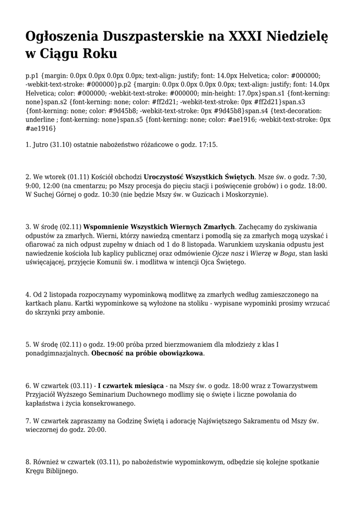 Ogłoszenia Duszpasterskie na XXXI Niedzielę