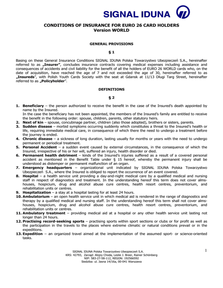 CONDITIONS OF INSURANCE FOR EURO 26 CARD HOLDERS Version WORLD GENERAL PROVISIONS §1 Basing on these General Insurance Conditions SIGNAL IDUNA Polska Towarzystwo Ubezpieczeń S.A., hereinafter referred to as „Insurer”, concludes insurance contracts covering medical expenses including assistance and consequences of accidents and civil liability for the benefit of all the holders of EURO 26 WORLD cards who, on the date of acquisition, have reached the age of 7 and not exceeded the age of 30, hereinafter referred to as „Insureds”, with Polish Youth Cards Society with the seat at Gdansk at 11/13 Długi Targ Street, hereinafter referred to as „Policyholder”. DEFINITIONS §2 1. Beneficiary – the person authorized to receive the benefit in the case of the Insured’s death appointed by name by the Insured. In the case the beneficiary has not been appointed, the members of the Insured’s family are entitled to receive the benefit in the following order: spouse, children, parents, other statutory heirs. 2. Next of kin – spouse, concubinage partner, children (also those adopted), brothers or sisters, parents. 3. Sudden disease – morbid symptoms occurring suddenly which constitutes a threat to the Insured’s health or life, requiring immediate medical care, in consequence of which there the need to undergo a treatment before the journey is ended. 4. Chronic disease – a sickness of long duration, lasting usually for months or years with the need to undergo permanent or periodical treatment. 5. Personal Accident – a sudden event caused by external circumstances, in the consequence of which the Insured, irrespective of his or her will, suffered an injury, health disorder or died. 6. Permanent health detriment – kinds of the Insured’s injuries suffered as a result of a covered personal accident as mentioned in the Benefit Table under § 15 hereof, whereby the permanent injury shall be understood as distemper or permanent malfunction of an organ. 7. Emergency headquarters – organizational unit indicated by SIGNAL IDUNA Polska Towarzystwo Ubezpieczeń S.A., where the Insured is obliged to report the occurrence of an event covered. 8. Hospital – a health service unit providing a day-and-night medical care by a qualified medical and nursing staff in respect of diagnostics and treatment. In the understanding hereof this term does not cover almshouses, hospicium, drug and alcohol abuse cure centres, health resort centres, preventorium, and rehabilitation units or centres. 9. Hospitalization – a stay at a hospital lasting for at least 24 hours. 10. Ambulatorium – an open health service unit in which medical aid is rendered in the range of diagnostics and therapy by a qualified medical and nursing staff. In the understanding hereof this term shall not cover almshouses, hospicium, drug and alcohol abuse cure centres, health resort centres, preventorium, and rehabilitation units or centres. 11. Ambulatory treatment – providing medical aid at a hospital or any other health service unit lasting not longer than 24 hours. 12. Practising record-seeking sports – practising sports within sport sections or clubs or for profit as well as the participation in the travels to the places where extreme climatic or natural conditions prevail or in the expeditions. 13. Expedition – an organized travel aimed at the implementation of the assumed sport- or science-oriented tasks. SIGNAL IDUNA Polska Towarzystwo Ubezpieczeń S.A. KRS: 42793, Zarząd: Alojzy Choda, Leslie J. Breer, Rainer Schönberg NIP: 583-27-58-112, REGON: 192566592 Siedziba: ul. Jasna 14/16a, 00-041 Warszawa 1 14. High-risk sports – rafting or other water sports practised on mountain rivers, diving with the use of oxygen bottle, parachuting, paragliding, gliding and pilotage of any motor aeroplanes, bungee jumping, fight sports, any kind of defense arts, climbing in mountains or on rocks, speleology, hunting, horse-riding, bobsleigh, ski jumping, water-skiing and any sports in which vehicles moving on the snow or ice. 15. Performing a work – activities taken up by the Insured abroad which are customarily paid for and which increase the risk of a loss. 16. Country of residence – the country in which the Insured was granted a residence permit. 17. Insurance document – any valid version of EURO 26 card issued by the Policyholder. 18. Fracture – traumatic break of bone tissue continuity; also the traumatic peel of epiphysis gristles shall be regarded as a fracture. 19. Burn – damage of skin and the tissues situated under the skin, resulting out of the exposure to high temperature, chemical substances, radiation or electric current. 20. Frost-bite – damage of skin and the tissues situated under the skin resulting out of the exposure to low temperature. 21. Brain contusion – a group of clinical symptoms which occur after a head injury characterized by loss of consciousness with the amnesia covering the time just before the injury, followed by the recovery without any defects of neurological character. 22. Brain concussion – local crush or rupture of brain tissue accompanied by intra-parenchymial bleeding or a local swelling. 23. Loss of an organ – amputation or total loss of control over the organ. 24. Material loss – the loss occurring as a damage, destruction or loss of a property. 25. Personal loss – the loss occurring as death, injuryor health detriment. 26. Loss event – an event covered by the insurance contract in the consequence of which civil liability claims are likely to follow. INSURANCE DOCUMENT §3 1. Insurance contract conclusion shall be confirmed by the insurance document. 2. Insurance document shall include at least the following data: 1) first name and surname of the Insured, 2) insurance period (period of the card’s validity). SUM INSURED §4 1. Sum insured shall constitute the upper limit of insurer’s liability for all the claims covered and resulting out of one event, regardl