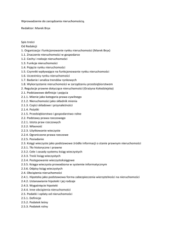 Wprowadzenie do zarządzania nieruchomością. Redaktor: Marek Bryx Spis treści Od Redakcji 1. Organizacja i funkcjonowanie rynku nieruchomości (Marek Bryx) 1.1. Znaczenie nieruchomości w gospodarce 1.2. Cechy i rodzaje nieruchomości 1.3. Funkcje nieruchomości 1.4. Pojęcie rynku nieruchomości 1.5. Czynniki wpływające na funkcjonowanie rynku nieruchomości 1.6. Uczestnicy rynku nieruchomości 1.7. Badanie i analiza trendów rynkowych 1.8. Wykorzystanie nieruchomości w zarządzaniu przedsiębiorstwem 2. Regulacje prawne dotyczące nieruchomości (Grażyna Kołodziejska) 2.1. Podstawowe definicje i pojęcia 2.1.1. Mienie jako kategoria prawa cywilnego 2.1.2. Nieruchomości jako składnik mienia 2.1.3. Części składowe i przynależności 2.1.4. Pożytki 2.1.5. Przedsiębiorstwo i gospodarstwo rolne 2.2. Podstawy prawa rzeczowego 2.2.1. Istota praw rzeczowych 2.2.2. Własność 2.2.3. Użytkowanie wieczyste 2.2.4. Ograniczone prawa rzeczowe 2.2.5. Posiadanie 2.3. Księgi wieczyste jako podstawowe źródło informacji o stanie prawnym nieruchomości 2.3.1. Tło historyczne i prawne 2.3.2. Cele i zasady systemu ksiąg wieczystych 2.3.3. Treść ksiąg wieczystych 2.3.4. Postępowanie wieczystoksięgowe 2.3.5. Księga wieczysta prowadzona w systemie informatycznym 2.3.6. Odpisy ksiąg wieczystych 2.4. Obciążenia nieruchomości 2.4.1. Hipoteka jako podstawowa forma zabezpieczenia wierzytelności na nieruchomości 2.4.2. Ustanawianie hipoteki i jej rodzaje 2.4.3. Wygaśnięcie hipoteki 2.4.4. Inne obciążenia nieruchomości 2.5. Podatki i opłaty od nieruchomości 2.5.1. Definicje 2.5.2. Podatek leśny 2.5.3. Podatek rolny 2.5.4. Podatki i opłaty lokalne 2.5.5. Podatek od spadków i darowizn 2.5.6. Podatek od czynności cywilnoprawnych 2.5.7. Opłata skarbowa 3. Rynkowa wartość nieruchomości (Elżbieta Mączyńska) 3.1. Pojęcie i charakterystyka wartości nieruchomości 3.1.1. Wartość obiektywna i subiektywna 3.1.2. Funkcje i cele wyceny nieruchomości a ich wartość 3.1.3. Informacyjne podstawy wyceny 3.2. Rodzaje wartości 3.2.1. Wartość a cele wyceny 3.2.2. Rynkowa i odtworzeniowa wartość nieruchomości 3.2.3. Wartość katastralna 3.3. Podejścia, metody i techniki ustalania wartości nieruchomości 3.3.1. Podejście stosowane w przypadkach wycen szczególnych 3.4. Bankowo-hipoteczna wartość nieruchomości 3.5. Inwestycyjna (indywidualna) wartość nieruchomości 3.6. Przepływy pieniężne jako podstawa dochodowej i indywidualnej wyceny wartości nieruchomości 3.7. Wycena nieruchomości a wycena przedsiębiorstw 4. Zarządzanie nieruchomością 4.1. Podstawy zarządzania działalnością gospodarczą (Miłosz Olszewski) 4.1.1. Idea zarządzania 4.1.2. Proces zarządzania 4.2. Nieruchomość jako przedmiot zarządzania (Miłosz Olszewski) 4.2.1. Charakterystyka zarządzanie nieruchomością 4.2.2. Istota zarządzania nieruchomością 4.2.3. Analiza uwarunkowań 4.2.4. Cele strategiczne 4.2.5. Zarządzanie nieruchomością - podejście finansowe 4.2.6. Rola zarządzającego nieruchomością 4.3. Bieżące zarządzanie obiektem (Andrzej Foryś) 4.3.1. Ochrona przeciwpożarowa 4.3.2. Zaopatrzenie w wodę, ochrona środowiska i utrzymanie czystości 4.3.3. Gospodarka energią cieplną w budynku 4.3.4. Prace konserwacyjne i remontowe w obiektach budowlanych 4.4. Zarządzanie najmem (Teresa Konowska) 4.4.1. Regulacja prawna, istota i znaczenie najmu dla zagospodarowywania nieruchomości 4.4.2. Pozyskiwanie najemców 4.4.3. Negocjowanie umów najmu 4.4.4. Strona prawna umów najmu 4.4.5. Wykonywanie umów najmu i utrzymanie najemców w nieruchomości 4.5. Narzędzia wspomagające pracę zarządcy (Teresa Konowska) 4.5.1. Plan zarządzania 4.5.2. Biznesplan 4.5.3. Systemy informatyczne 5. Ekonomiczno-finansowe aspekty zarządzania nieruchomością 5.1. Rachunkowość (Ryszard Matkowski) 5.1.1. Zagadnienia ogólne 5.1.2. Księgowość 5.1.3. Rachunek kosztów 5.1.4. Sprawozdanie finansowe 5.2. Amortyzacja (Ryszard Matkowski) 5.3. Analiza ekonomiczno-finansowa (Ryszard Matkowski) 5.4. Budżetowanie i kalkulacja kosztów (Iwona Foryś) 5.4.1. Budżet nieruchomości 5.4.2. Kalkulacja kosztów 5.5. Efektywność inwestycji (Iwona Foryś) 5.5.1. Wskaźniki dynamiczne 5.5.2. Wskaźniki statyczne 5.6. Efektywność zarządzania (Iwona Foryś) 6. Zarządzanie ryzykiem utraty mienia, bezpieczeństwa, awarii, odpowiedzialności cywilnoprawnej (Iwona Foryś) 6.1. Źródła i rodzaje zagrożeń 6.2. Bezpieczeństwo przeciwpożarowe, elektryczne, gazowe 6.3. Woda, substancje chemiczne, wentylacja, promieniowane, hałas 6.4. Oznaczenia i sprzęt zapewniający bezpieczeństwo użytkowania nieruchomości 6.5. Przepisy BHP 6.6. Ochrona mienia 6.6.1. Pożar 6.6.2. Kradzież 6.6.3. Zagrożenia dla środowiska 6.7. Procedury postępowania w sytuacjach kryzysowych 6.8. Ubezpieczenia 7. Sytuacja prawna i zawodowa zarządcy nieruchomości (Marek Bryx, Zbigniew Brzeziński) 7.1. Sytuacja prawna zarządcy 7.1.1. Regulacje prawne dotyczące zawodu 7.1.2. Prawo zarządcy nieruchomości do wykonywania zawodu 7.1.3. Prawo zarządcy do wynagrodzenia 7.1.4. Odpowiedzialność zawodowa i karna zarządcy nieruchomości 7.2. Jak zostać zarządcą - procedura kwalifikacyjna 7.2.1. System nadawania licencji zawodowych 7.2.2. Postępowanie kwalifikacyjne 7.2.3. Praktyki zawodowe 7.3. Organizacje zawodowe zarządców nieruchomości Aneks. Pytania kontrolne i zadania obliczeniowe (Iwona Foryś) Bibliografia