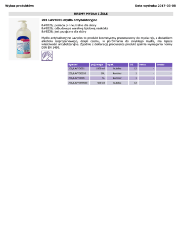 Wykaz produktów: Data wydruku 2017-03-08 KREMY MYDŁA I ŻELE 201 LAVYDES mydło antybakteryjne • posiada pH neutralne dla skóry • odbudowuje warstwę lipidową naskórka • jest przyjazne dla skóry Mydło antybakteryjne Lavydes to produkt kosmetyczny przeznaczony do mycia rąk, z dodatkiem alkoholu izopropanowego, dzięki czemu, w porównaniu do zwykłego mydła, ma lepsze właściwości antybakteryjne. Zgodnie z deklaracją producenta produkt spełnia wymagania normy DIN EN 1499. Symbol 201/LAVYDES1 poj/waga opak. OZ netto brutto 1000 ml butelka 12 - - 201/LAVYDES10 10L kanister 1 - - 201/LAVYDES5 5L kanister 1 - - 500 ml butelka 12 - - 201/LAVYDES500