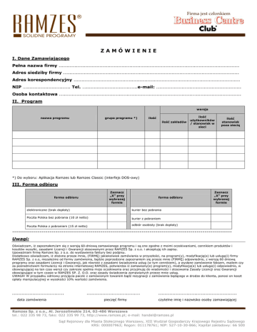 Firma jest członkiem ZAMÓWIENIE I. Dane Zamawiającego Pełna nazwa firmy ................................................................................................................... Adres siedziby firmy ................................................................................................................ Adres korespondencyjny .......................................................................................................... NIP …............................ Tel. ….................................e-mail: ….................................................... Osoba kontaktowa .................................................................................................................... II. Program wersja nazwa programu grupa programu *) ilość ilość zakładów ilość użytkowników / stanowisk w sieci ilość stanowisk poza siecią *) Do wyboru: Aplikacja Ramzes lub Ramzes Classic (interfejs DOS-owy) III. Forma odbioru Zaznacz „X” przy wybranej formie forma odbioru forma odbioru elektroniczne (brak dopłaty) kurier bez pobrania Poczta Polska bez pobrania (10 zł netto) kurier z pobraniem Poczta Polska z pobraniem (15 zł netto) odbiór osobisty (brak dopłaty) Zaznacz „X” przy wybranej formie ---------------------------------------------------------------------------------------------------------------Uwagi: Oświadczam, iż zapoznałem/am się z wersją 60-dniową zamawianego programu i są one zgodne z moimi oczekiwaniami, cennikiem produktów i kosztów wysyłki, zasadami Licencji i Gwarancji stosowanymi przez RAMZES Sp. z o.o. i akceptuję ich zapisy. Upoważniam firmę Ramzes Sp. z o.o. do wystawienia faktury bez podpisu. Dodatkowo oświadczam, iż złożone przeze mnie, (FIRMĘ) jakiekolwiek zamówienia w przyszłości, na program(y), modyfikację(e) lub usługę(i) firmy RAMZES Sp. z o.o, niezależnie od formy zamówienia, będzie poprzedzone zapoznaniem się przeze mnie (FIRMĘ) odpowiednio, z wersją 60 dniową programu oraz zasadami Licencji i Gwarancji, jak również z zasadami świadczenia usług (w tym cennikiem), a wysłane zamówienie faksem, mailem czy za pośrednictwem formularzy na stronie internetowej RAMZES, potwierdza iż zamawiany(e) program(y), modyfikacja(e) lub usługa(i) odpowiednio, w obowiązującej na ten czas wersji czy zakresie spełnia moje oczekiwania oraz przyjmuję do wiadomości i stosowania Zasady Licencji oraz Gwarancji obowiązujące w tym czasie w RAMZES SP. Z. O.O. oraz zasady świadczenia zamawianych przeze mnie usług. UWAGA! W przypadku odmowy przyjęcia paczki z zamówionym towarem bądź rezygnacji z zamówienia będącego w drodze do klienta, ponosi on koszt opłaty manipulacyjnej w wysokości 10% wartości zamówienia. ................................. data zamówienia .................................. pieczęć firmy .................................................. czytelne imię i nazwisko osoby zamawiającej Ramzes Sp. z o.o., Al. Jerozolimskie 214, 02-486 Warszawa tel.: 022 335 98 73, faks: 022 335 99 73, http://www.ramzes.pl; e-mail: [email protected] Sąd Rejonowy dla Miasta Stołecznego Warszawy, XIII Wydział Gospodarczy Krajowego Rejestru Sądowego KRS: 000007963; Regon: 011178761; NIP: 527-10-30-866; Kapitał zakładowy: 66 500