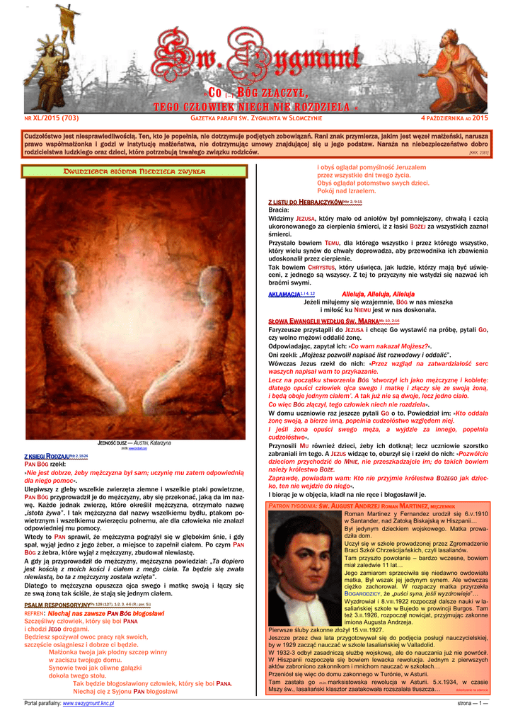 » CO […] BÓG ZŁĄCZYŁ, TEGO CZŁOWIEK NIECH NIE ROZDZIELA NR XL/2015 (703) … « GAZETKA PARAFII ŚW. ZYGMUNTA W SŁOMCZYNIE 4 PAŹDZIERNIKA AD 2015 Cudzołóstwo jest niesprawiedliwością. Ten, kto je popełnia, nie dotrzymuje podjętych zobowiązań. Rani znak przymierza, jakim jest węzeł małżeński, narusza prawo współmałżonka i godzi w instytucję małżeństwa, nie dotrzymując umowy znajdującej się u jego podstaw. Naraża na niebezpieczeństwo dobro rodzicielstwa ludzkiego oraz dzieci, które potrzebują trwałego związku rodziców. [KKK, 2381] i obyś oglądał pomyślność Jeruzalem przez wszystkie dni twego życia. Obyś oglądał potomstwo swych dzieci. Pokój nad Izraelem. DWUDZIESTA SIÓDMA NIEDZIELA ZWYKŁA Z LISTU DO HEBRAJCZYKÓWHbr 2, 9-11 Bracia: Widzimy JEZUSA, który mało od aniołów był pomniejszony, chwałą i czcią ukoronowanego za cierpienia śmierci, iż z łaski BOŻEJ za wszystkich zaznał śmierci. Przystało bowiem TEMU, dla którego wszystko i przez którego wszystko, który wielu synów do chwały doprowadza, aby przewodnika ich zbawienia udoskonalił przez cierpienie. Tak bowiem CHRYSTUS, który uświęca, jak ludzie, którzy mają być uświęceni, z jednego są wszyscy. Z tej to przyczyny nie wstydzi się nazwać ich braćmi swymi. Alleluja, Alleluja, Alleluja Jeżeli miłujemy się wzajemnie, BÓG w nas mieszka i miłość ku NIEMU jest w nas doskonała. AKLAMACJA1 J 4, 12 SŁOWA EWANGELII WEDŁUG ŚW. MARKAMk 10, 2-16 JEDNOŚĆ DUSZ — AUSTIN, Katarzyna źródło: www.lordsart.com Z KSIĘGI R ODZAJURdz 2, 18-24 PAN BÓG rzekł: »Nie jest dobrze, żeby mężczyzna był sam; uczynię mu zatem odpowiednią dla niego pomoc«. Ulepiwszy z gleby wszelkie zwierzęta ziemne i wszelkie ptaki powietrzne, PAN BÓG przyprowadził je do mężczyzny, aby się przekonać, jaką da im nazwę. Każde jednak zwierzę, które określił mężczyzna, otrzymało nazwę „istota żywa”. I tak mężczyzna dał nazwy wszelkiemu bydłu, ptakom powietrznym i wszelkiemu zwierzęciu polnemu, ale dla człowieka nie znalazł odpowiedniej mu pomocy. Wtedy to PAN sprawił, że mężczyzna pogrążył się w głębokim śnie, i gdy spał, wyjął jedno z jego żeber, a miejsce to zapełnił ciałem. Po czym PAN BÓG z żebra, które wyjął z mężczyzny, zbudował niewiastę. A gdy ją przyprowadził do mężczyzny, mężczyzna powiedział: „Ta dopiero jest kością z moich kości i ciałem z mego ciała. Ta będzie się zwała niewiastą, bo ta z mężczyzny została wzięta”. Dlatego to mężczyzna opuszcza ojca swego i matkę swoją i łączy się ze swą żoną tak ściśle, że stają się jednym ciałem. PSALM RESPONSORYJNYPs 128 (127), 1-2. 3. 4-6 (R.: por. 5)) REFREN: Niechaj nas zawsze PAN BÓG błogosławi Szczęśliwy człowiek, który się boi PANA i chodzi JEGO drogami. Będziesz spożywał owoc pracy rąk swoich, szczęście osiągniesz i dobrze ci będzie. Małżonka twoja jak płodny szczep winny w zaciszu twojego domu. Synowie twoi jak oliwne gałązki dokoła twego stołu. Tak będzie błogosławiony człowiek, który się boi PANA. Niechaj cię z Syjonu PAN błogosławi Portal parafialny: www.swzygmunt.knc.pl Faryzeusze przystąpili do JEZUSA i chcąc Go wystawić na próbę, pytali GO, czy wolno mężowi oddalić żonę. Odpowiadając, zapytał ich: »Co wam nakazał Mojżesz?«. Oni rzekli: „Mojżesz pozwolił napisać list rozwodowy i oddalić”. Wówczas Jezus rzekł do nich: »Przez wzgląd na zatwardziałość serc waszych napisał wam to przykazanie. Lecz na początku stworzenia BÓG ‘stworzył ich jako mężczyznę i kobietę: dlatego opuści człowiek ojca swego i matkę i złączy się ze swoją żoną, i będą oboje jednym ciałem’. A tak już nie są dwoje, lecz jedno ciało. Co więc BÓG złączył, tego człowiek niech nie rozdziela«. W domu uczniowie raz jeszcze pytali GO o to. Powiedział im: »Kto oddala żonę swoją, a bierze inną, popełnia cudzołóstwo względem niej. I jeśli żona opuści swego męża, a wyjdzie za innego, popełnia cudzołóstwo«. Przynosili MU również dzieci, żeby ich dotknął; lecz uczniowie szorstko zabraniali im tego. A JEZUS widząc to, oburzył się i rzekł do nich: »Pozwólcie dzieciom przychodzić do MNIE, nie przeszkadzajcie im; do takich bowiem należy królestwo BOŻE. Zaprawdę, powiadam wam: Kto nie przyjmie królestwa BOŻEGO jak dziecko, ten nie wejdzie do niego«. I biorąc je w objęcia, kładł na nie ręce i błogosławił je. PATRON TYGODNIA: ŚW. AUGUST ANDRZEJ ROMAN MARTINEZ, MĘCZENNIK Roman Martinez y Fernandez urodził się 6.V.1910 w Santander, nad Zatoką Biskajską w Hiszpanii… Był jedynym dzieckiem wojskowego. Matka prowadziła dom. Uczył się w szkole prowadzonej przez Zgromadzenie Braci Szkół Chrześcijańskich, czyli lasalianów. Tam przyszło powołanie – bardzo wczesne, bowiem miał zaledwie 11 lat… Jego zamiarom sprzeciwiła się niedawno owdowiała matka, Był wszak jej jedynym synem. Ale wówczas ciężko zachorował. W rozpaczy matka przyrzekła BOGARODZICY, że „puści syna, jeśli wyzdrowieje”… Wyzdrowiał i 8.VIII.1922 rozpoczął dalsze nauki w lasaliańskiej szkole w Bujedo w prowincji Burgos. Tam też 3.II.1926, rozpoczął nowicjat, przyjmując zakonne imiona Augusta Andrzeja. Pierwsze śluby zakonne złożył 15.VIII.1927. Jeszcze przez dwa lata przygotowywał się do podjęcia posługi nauczycielskiej, by w 1929 zacząć nauczać w szkole lasaliańskiej w Valladolid. W 1932-3 odbył zasadniczą służbę wojskową, ale do nauczania już nie powrócił. W Hiszpanii rozpoczęła się bowiem lewacka rewolucja. Jednym z pierwszych aktów zabroniono zakonnikom i mnichom nauczać w szkołach… Przeniósł się więc do domu zakonnego w Turónie, w Asturii. Tam zastała go m.in. marksistowska rewolucja w Asturii. 5.X.1934, w czasie Mszy św., lasaliański klasztor zaatakowała rozszalała tłuszcza… dokończenie na o
