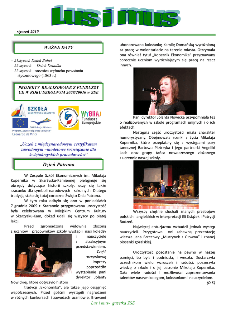 styczeń 2010 uhonorowano koleżankę Kamilę Domaoską wyróżnioną za pracę w wolontariacie na terenie miasta. Otrzymała ona również tytuł „Kopernik Ekonomika” przyznawany corocznie uczniom wyróżniającym się pracą na rzecz innych. WAŻNE DATY 21styczeń Dzień Babci 22 styczeń – Dzień Dziadka 22 styczeń– rocznica wybuchu powstania styczniowego (1863 r.) PROJEKTY REALIZOWANE Z FUNDUSZY UE W ROKU SZKOLNYM 2009/20010 w ZSE „Uczeń z międzynarodowym certyfikatem zawodowym –modelowe rozwiązanie dla świętokrzyskich pracodawców” Pani dyrektor Jolanta Nowicka przypomniała też o realizowanych w szkole programach unijnych i o ich efektach. Następna częśd uroczystości miała charakter humorystyczny. Obejmowała scenki z życia Mikołaja Kopernika, które przeplatały się z występami pary tanecznej Bartosza Pietrzyka i jego partnerki Angeliki Lach oraz grupy taoca nowoczesnego złożonego z uczennic naszej szkoły. Dzień Patrona W Zespole Szkół Ekonomicznych im. Mikołaja Kopernika w Skarżysku-Kamiennej pielęgnuje się obrzędy dotyczące historii szkoły, uczy się także szacunku dla symboli narodowych i szkolnych. Dlatego tradycją stało się tutaj coroczne Święto Dnia Patrona. W tym roku odbyło się ono w poniedziałek 7 grudnia 2009 r. Starannie przygotowana uroczystośd była celebrowana w Miejskim Centrum Kultury w Skarżysku-Kam, dokąd udali się wszyscy po piątej lekcji. Przed zgromadzoną widownią złożoną z uczniów i pracowników szkoły wystąpili nasi koledzy i nauczyciele z atrakcyjnym przedstawieniem. Częśd rozrywkową imprezy poprzedziło wystąpienie pani dyrektor Jolanty Nowickiej, które dotyczyło historii tradycji „Ekonomika”, ale także jego osiągnięd współczesnych. Przed gośdmi wystąpili nagrodzeni w różnych konkursach i zawodach uczniowie. Brawami Wszyscy chętnie słuchali znanych przebojów polskich i angielskich w interpretacji Eli Książek i Patrycji Rodzeo. Najwięcej entuzjazmu wzbudził jednak występ nauczycieli. Przygotowali oni zabawną prezentację wiersza Jana Brzechwy „Murzynek z Głowna” i znanej piosenki góralskiej. Uroczystośd pozostanie na pewno w naszej pamięci, bo była i podniosła, i wesoła. Dostarczyła uczestnikom wielu wzruszeo i radości, poszerzyła wiedzę o szkole i o jej patronie Mikołaju Koperniku. Dała wiele radości i możliwości zaprezentowania talentów naszym kolegom, koleżankom i nauczycielom. (D.K) Lus i mus- gazetka ZSE Potem rozpoczęła się wspaniała zabawa, która trwała aż Moje cudowne ferie Ferie to najwspanialszy czas w roku szkolnym. Czekałem na nie niecierpliwie. Marzyłem o śniegu, o sankach i nartach. Z niepokojem słuchałem prognoz pogody. I stało się. Najpierw mróz, potem opady białego puchu. Cóż za szaleostwo. Pomimo niskiej temperatury co dzieo rano szedłem na górkę, by z Sebą i Damianem pojeździd na sankach. Przy okazji poznaliśmy wiele wspaniałych dziewczyn i kilku sympatycznych kolegów. Mimo zimna spotykaliśmy się także po południu na spacerach czy w osiedlowej świetlicy lub pubie. Tak minął pierwszy tydzieo upragnionych ferii. Potem to już naprawdę „było z górki”. Nie wiem nawet, kiedy nadszedł termin wyjazdu na narty do Masłowa. Niestety, tylko na trzy dni. Szusowałem po stokach, ciesząc się cudownymi warunkami i jazdą, a wieczorem wraz z przyjaciółmi taoczyłem w dyskotece. A potem? Smutny powrót do rzeczywistości. Przyjazd do domu, nowy plan, szkoła, codzienne obowiązki. Mimo to – głowa do góry. Przecież już za kilka miesięcy wakacje! (G.M) Studniówka 2010 Jak ten czas szybko płynie .... Dopiero przygotowywaliśmy się do klasyfikacji, a tu już studniówka. W tym roku odbyła się ona 16 stycznia, tuż po wywiadówkach. Uczestniczyło w niej wielu uczniów aż z ośmiu klas maturalnych, którzy przybyli na bal ze swoimi partnerami, wcześniej starannie przygotowali dekoracje. do rana. Zespół muzyczny grał rytmicznie i wymagające niesamowitej kondycji „kawałki”, a młodzież bawiła się doskonale. Od czasu do czasu uczestnicy krzepili swe siły podawanymi przez rodziców smacznymi posiłkami. Impreza niewątpliwie należy do bardzo udanych. Pozostaną po niej miłe wspomnienia i scenki utrwalone na taśmach filmowych i zdjęciach. (M.K) Poznajmy swój region ! Oto propozycje ciekawych, wartych zwiedzenia miejsc. Bałtów Jak zwykle, najważniejszy okazał się polonez. Każda klasa taoczyła go indywidualnie po wstępnych przemówieniach i podziękowaniach od młodzieży dla wychowawców klas. Układy poloneza dwiczone od miesiąca podobały się i nauczycielom, i rodzicom. Bałtów znajduje się około 12 kilometrów na północny wschód od Ostrowca Świętokrzyskiego. Leży w dolinie rzeki Kamiennej, na Pogórzu Bałtowskim. O Bałtowie wspominał Jan Długosz w swoich kronikach. W 1828 roku Bałtów nabył książę Franciszek Ksawery DruckiLubecki. Wieś pozostawała własnością rodu Druckich-Lubeckich do kooca II wojny światowej. W Bałtowie znajduje się: pałac książąt Druckich-Lubeckich z kooca XIX w., Kościół pw. Matki Boskiej Bolesnej z 1697, Młyn wodny z XIX w. na rzece Kamiennej, do dzisiaj wykorzystywany do produkcji mąki. Drewniana kaplica Świętego Jana Nepomucena z XIX w. Obecnie największą atrakcją Bałtowa są odkryte przez polskiego paleontologa, dr. Gerarda Gierlioskiego Tropy dinozaurów pochodzące z okresu jury. Lus i mus- gazetka ZSE Jeden z nich – trop drapieżnego allozaura znajduje się na szczycie skały zwanej Czarcią Stopką Kolejne tropy dinozaurów, w tym między innymi roślinożernego stegozaura, można zobaczyd w lessowym wąwozie zwanym Żydowskim Jarem, położonym nieopodal bałtowskiego młyna wodnego Inne ciekawe miejsca w w następnym numerze gazetki . regionie przybliżymy „Śmiejmy się z siebie..." 1. Collegium Nobilium była to szkoła, Internet dla młodzieży szlacheckiej. 2. Jego religijnośd była na