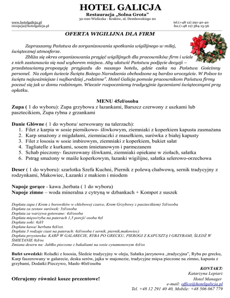 HOTEL GALICJA Restauracja „Solna Grota” www.hotelgalicja.pl [email protected] 32-020 Wieliczka - Kraków, ul. Dembowskiego 20 tel.(+48 12) 291-40-40 fax.(+48 12) 384-15-56 __________________________________________________________________________________________________________ OFERTA WIGILIJNA DLA FIRM Zapraszamy Państwa do zorganizowania spotkania wigilijnego w miłej, świątecznej atmosferze. Zbliża się okres organizowania przyjęć wigilijnych dla pracowników firm i wiele z nich zastanawia się nad wyborem miejsca. Aby ułatwić Państwu podjęcie decyzji – przedstawiamy propozycję przyjazdu do naszego hotelu, gdzie czeka na Państwa Gościnny personel. Na całym świecie Święta Bożego Narodzenia obchodzone są bardzo uroczyście. W Polsce to święta najważniejsze i najbardziej „rodzinne”. Hotel Galicja pomoże pracownikom Państwa firmy poczuć się jak w domu rodzinnym. Wieczór rozpoczniemy tradycyjnie życzeniami świątecznymi przy opłatku. MENU 45zł/osoba Zupa ( 1 do wyboru): Zupa grzybowa z łazankami, Barszcz czerwony z uszkami lub pasztecikiem, Zupa rybna z grzankami Danie Główne ( 1 do wyboru/ serwowany na talerzach): 1. Filet z karpia w sosie piernikowo- śliwkowym, ziemniaki z koperkiem kapusta zasmażana 2. Karp smażony z migdałami, ziemniaczki z masełkiem, surówka z białej kapusty 3. Filet z łososia w sosie imbirowym, ziemniaki z koperkiem, bukiet sałat 4. Tagliatelle z kurkami, sosem śmietanowym i parmezanem 5. Schab pieczony- faszerowany śliwkami, ziemniaki opiekane w ziołach, sałatka 6. Pstrąg smażony w maśle koperkowym, łazanki wigilijne, sałatka selerowo-orzechowa Deser ( 1 do wyboru): szarlotka Szefa Kuchni, Piernik z polewą chałwową, sernik tradycyjny z rodzynkami, Makowiec, Łazanki z makiem i miodem Napoje gorące - kawa ,herbata ( 1 do wyboru) Napoje zimne – woda mineralna z cytryną w dzbankach + Kompot z suszek Dopłata zupa ( Krem z borowików w chlebowej czarce, Krem Grzybowy z pasztecikiem) 5zł/osoba Dopłata za zestaw surówek: 5zł/osoba Dopłata za warzywa gotowane: 4zł/osoba Dopłata mięso/ryba na paterach 1,5 porcji/ osoba 6zł Dopłata soki: 6zł/l Dopłata kawa/ herbata 6zł/szt. Dopłata 3 rodzaje ciast na paterach: 6zł/osoba ( sernik, piernik,makowiec) Dopłata przystawka: KARP W GALARECIE, RYBA PO GRECKU, PIEROGI Z KAPUSZTĄ I GRZYBAMI, ŚLEDŹ W ŚMIETANIE 8zł/os Zmiana deseru na: Jabłko pieczone z bakaliami na sosie cynamonowym 4zł/os Bufet szwedzki: Roladki z łososia, Śledzie tradycyjny w oleju, Sałatka jarzynowa „tradycyjna”, Ryba po grecku, Karp faszerowany w galarecie, deska serów, jajka w majonezie, tradycyjne mięsa pieczone na zimno, kapusta z grzybami, Dodatki:Pieczywo, Masło 40zł/osoba KONTAKT: Katarzyna Lepiarz Oferujemy również kosze prezentowe! Hotel Manager e-mail: [email protected] Tel. +48 12 291 40 40, Mobile: +48 506 067 779
