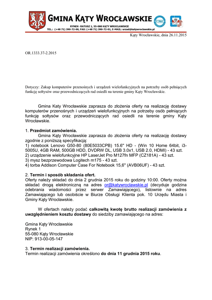 Kąty Wrocławskie, dnia 26.11.2015 OR.1333.37-2.2015 Dotyczy: Zakup komputerów przenośnych i urządzeń wielofunkcyjnych na potrzeby osób pełniących funkcję sołtysów oraz przewodniczących rad osiedli na terenie gminy Kąty Wrocławskie. Gmina Katy Wrocławskie zaprasza do złożenia oferty na realizację dostawy komputerów przenośnych i urządzeń wielofunkcyjnych na potrzeby osób pełniących funkcję sołtysów oraz przewodniczących rad osiedli na terenie gminy Kąty Wrocławskie. 1. Przedmiot zamówienia. Gmina Kąty Wrocławskie zaprasza do złożenia oferty na realizację dostawy zgodnie z poniższą specyfikacją: 1) notebook Lenovo G50-80 (80E5033CPB) 15.6'' HD - (Win 10 Home 64bit, i35005U, 4GB RAM, 500GB HDD, DVDRW DL, USB 3.0x1, USB 2.0, HDMI) - 43 szt. 2) urządzenie wielofunkcyjne HP LaserJet Pro M127fn MFP (CZ181A) - 43 szt. 3) mysz bezprzewodowa Logitech m175 - 43 szt. 4) torba Addison Computer Case For Notebook 15,6'' (AVB06UF) - 43 szt. 2. Termin i sposób składania ofert. Oferty należy składać do dnia 2 grudnia 2015 roku do godziny 10:00. Oferty można składać drogą elektroniczną na adres [email protected] (decyduje godzina odebrania wiadomości przez serwer Zamawiającego), listownie na adres Zamawiającego lub osobiście w Biurze Obsługi Klienta pok. 10 Urzędu Miasta i Gminy Kąty Wrocławskie. W ofertach należy podać całkowitą kwotę brutto realizacji zamówienia z uwzględnieniem kosztu dostawy do siedziby zamawiającego na adres: Gmina Kąty Wrocławskie Rynek 1 55-080 Kąty Wrocławskie NIP: 913-00-05-147 3. Termin realizacji zamówienia. Termin realizacji zamówienia określono do dnia 11 grudnia 2015 roku.