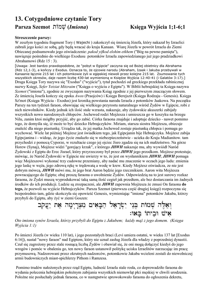 PYTANIA i ODPOWIEDZI do PARSZY SZEMOT 2 Mojż. 1;1-6;1: