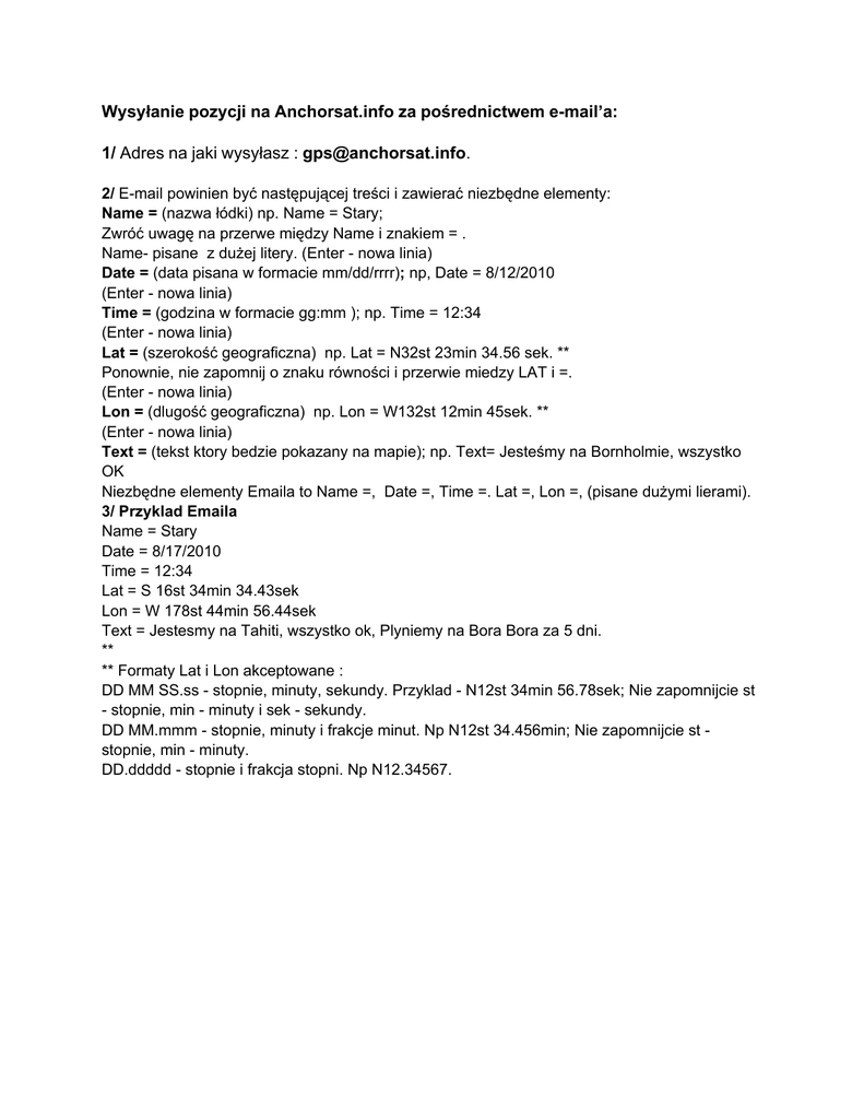 Wysyłanie pozycji na Anchorsat.info za pośrednictwem e-mail’a: 1/ Adres na jaki wysyłasz : [email protected]. 2/ E-mail powinien być następującej treści i zawierać niezbędne elementy: Name = (nazwa łódki) np. Name = Stary; Zwróć uwagę na przerwe między Name i znakiem = . Name- pisane z dużej litery. (Enter - nowa linia) Date = (data pisana w formacie mm/dd/rrrr); np, Date = 8/12/2010 (Enter - nowa linia) Time = (godzina w formacie gg:mm ); np. Time = 12:34 (Enter - nowa linia) Lat = (szerokość geograficzna) np. Lat = N32st 23min 34.56 sek. ** Ponownie, nie zapomnij o znaku równości i przerwie miedzy LAT i =. (Enter - nowa linia) Lon = (dlugość geograficzna) np. Lon = W132st 12min 45sek. ** (Enter - nowa linia) Text = (tekst ktory bedzie pokazany na mapie); np. Text= Jesteśmy na Bornholmie, wszystko OK Niezbędne elementy Emaila to Name =, Date =, Time =. Lat =, Lon =, (pisane dużymi lierami). 3/ Przyklad Emaila Name = Stary Date = 8/17/2010 Time = 12:34 Lat = S 16st 34min 34.43sek Lon = W 178st 44min 56.44sek Text = Jestesmy na Tahiti, wszystko ok, Plyniemy na Bora Bora za 5 dni. ** ** Formaty Lat i Lon akceptowane : DD MM SS.ss - stopnie, minuty, sekundy. Przyklad - N12st 34min 56.78sek; Nie zapomnijcie st - stopnie, min - minuty i sek - sekundy. DD MM.mmm - stopnie, minuty i frakcje minut. Np N12st 34.456min; Nie zapomnijcie st stopnie, min - minuty. DD.ddddd - stopnie i frakcja stopni. Np N12.34567.