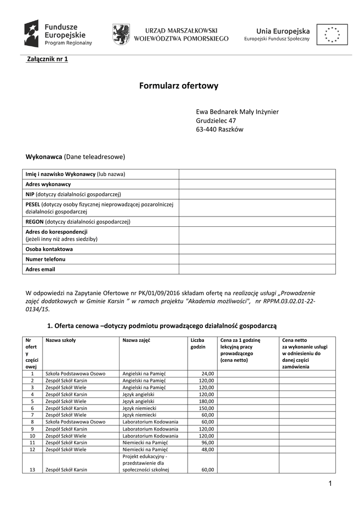Załącznik nr 1 Formularz ofertowy Ewa Bednarek Mały Inżynier Grudzielec 47 63-440 Raszków Wykonawca (Dane teleadresowe) Imię i nazwisko Wykonawcy (lub nazwa) Adres wykonawcy NIP (dotyczy działalności gospodarczej) PESEL (dotyczy osoby fizycznej nieprowadzącej pozarolniczej działalności gospodarczej REGON (dotyczy działalności gospodarczej) Adres do korespondencji (jeżeli inny niż adres siedziby) Osoba kontaktowa Numer telefonu Adres email W odpowiedzi na Zapytanie Ofertowe nr PK/01/09/2016 składam ofertę na realizację usługi „Prowadzenie zajęć dodatkowych w Gminie Karsin ” w ramach projektu "Akademia możliwości", nr RPPM.03.02.01-220134/15. 1. Oferta cenowa –dotyczy podmiotu prowadzącego działalność gospodarczą Nr ofert y części owej 1 2 3 4 5 6 7 8 9 10 11 12 13 Nazwa szkoły Nazwa zajęć Szkoła Podstawowa Osowo Zespół Szkół Karsin Zespół Szkół Wiele Zespół Szkół Karsin Zespół Szkół Wiele Zespół Szkół Karsin Zespół Szkół Wiele Szkoła Podstawowa Osowo Zespół Szkół Karsin Zespół Szkół Wiele Zespół Szkół Karsin Zespół Szkół Wiele Angielski na Pamięć Angielski na Pamięć Angielski na Pamięć Język angielski Język angielski Język niemiecki Język niemiecki Laboratorium Kodowania Laboratorium Kodowania Laboratorium Kodowania Niemiecki na Pamięć Niemiecki na Pamięć Projekt edukacyjny przedstawienie dla społeczności szkolnej Zespół Szkół Karsin Liczba godzin Cena za 1 godzinę lekcyjną pracy prowadzącego (cena netto) Cena netto za wykonanie usługi w odniesieniu do danej części zamówienia 24,00 120,00 120,00 120,00 180,00 150,00 60,00 60,00 120,00 120,00 96,00 48,00 60,00 1 14 Zespół Szkół Wiele 15 Szkoła Podstawowa Osowo 16 Zespół Szkół Karsin 17 18 19 20 Zespół Szkół Wiele Szkoła Podstawowa Osowo Zespół Szkół Karsin Zespół Szkół Wiele 21 Szkoła Podstawowa Osowo 22 Zespół Szkół Karsin 23 24 25 Zespół Szkół Wiele Zespół Szkół Karsin Zespół Szkół Wiele 26 Szkoła Podstawowa Osowo 27 Zespół Szkół Karsin 28 Zespół Szkół Wiele 29 Szkoła Podstawowa Osowo 30 Zespół Szkół Karsin 31 32 33 34 35 36 Zespół Szkół Wiele Zespół Szkół Karsin Zespół Szkół Wiele Szkoła Podstawowa Osowo Zespół Szkół Karsin Zespół Szkół Wiele Projekt edukacyjny przedstawienie dla społeczności szkolnej Projekt edukacyjny szkolna gazetka Przedsiębiorczość z wykorzystaniem gier planszowych Przedsiębiorczość z wykorzystaniem gier planszowych Przyrodnicze laboratorium Przyrodnicze laboratorium Przyrodnicze laboratorium Spotkanie z królową zajęcia z matematyki Spotkanie z królową zajęcia z matematyki Spotkanie z królową zajęcia z matematyki Zajęcia logopedyczne Zajęcia logopedyczne Zajęcia wyrównawczodydaktyczne Zajęcia wyrównawczodydaktyczne Zajęcia wyrównawczodydaktyczne Półkolonie Eksperymentalne Półkolonie Eksperymentalne Półkolonie Eksperymentalne Półkolonie Elektronika Półkolonie Elektronika Półkolonie ROBO-lab Półkolonie ROBO-lab Półkolonie ROBO-lab 60,00 60,00 60,00 180,00 120,00 300,00 360,00 60,00 300,00 120,00 180,00 60,00 60,00 180,00 120,00 90,00 450,00 450,00 90,00 90,00 90,00 540,00 540,00 Razem: Cena netto łącznie (PLN): Podatek VAT (PLN): Słownie cena netto (PLN): Jednocześnie oświadczam, że dysponuję osobami posiadającymi wykształcenie i doświadczenie zgodnie z opisem w pkt V. pkt 1 zapytania ofertowego, wykaz tych osób załączam w załączniku nr 2. Na wezwanie Zamawiającego zobowiązuję się dostarczyć w terminie przez niego wyznaczonym dokumenty potwierdzające powyższe. ______________________ Data _______________________________________ Podpis 2 2. Oferta cenowa – dotyczy osoby fizycznej nieprowadzącej pozarolniczej działalności gospodarczej Koszt całkowity (zawiera wynagrodzenie netto, podatek dochodowy, składki na ubezpieczenie społeczne i zdrowotne opłacane przez zleceniobiorcę i zleceniodawcę). Nr oferty części owej Nazwa szkoły Nazwa zajęć 1 2 3 4 5 6 7 8 9 10 11 12 Szkoła Podstawowa Osowo Zespół Szkół Karsin Zespół Szkół Wiele Zespół Szkół Karsin Zespół Szkół Wiele Zespół Szkół Karsin Zespół Szkół Wiele Szkoła Podstawowa Osowo Zespół Szkół Karsin Zespół Szkół Wiele Zespół Szkół Karsin Zespół Szkół Wiele 13 Zespół Szkół Karsin 14 Zespół Szkół Wiele 15 Szkoła Podstawowa Osowo 16 Zespół Szkół Karsin 17 18 19 20 Zespół Szkół Wiele Szkoła Podstawowa Osowo Zespół Szkół Karsin Zespół Szkół Wiele 21 Szkoła Podstawowa Osowo 22 Zespół Szkół Karsin 23 24 25 Zespół Szkół Wiele Zespół Szkół Karsin Zespół Szkół Wiele 26 Szkoła Podstawowa Osowo 27 Zespół Szkół Karsin 28 Zespół Szkół Wiele 29 Szkoła Podstawowa Osowo 30 Zespół Szkół Karsin 31 Zespół Szkół Wiele Angielski na Pamięć Angielski na Pamięć Angielski na Pamięć Język angielski Język angielski Język niemiecki Język niemiecki Laboratorium Kodowania Laboratorium Kodowania Laboratorium Kodowania Niemiecki na Pamięć Niemiecki na Pamięć Projekt edukacyjny przedstawienie dla społeczności szkolnej Projekt edukacyjny przedstawienie dla społeczności szkolnej Projekt edukacyjny szkolna gazetka Przedsiębiorczość z wykorzystaniem gier planszowych Przedsiębiorczość z wykorzystaniem gier planszowych Przyrodnicze laboratorium Przyrodnicze laboratorium Przyrodnicze laboratorium Spotkanie z królową zajęcia z matematyki Spotkanie z królową zajęcia z matematyki Spotkanie z królową zajęcia z matematyki Zajęcia logopedyczne Zajęcia logopedyczne Zajęcia wyrównawczodydaktyczne Zajęcia wyrównawczodydaktyczne Zajęcia wyrównawczodydaktyczne Półkolonie Eksperymentalne Półkolonie Eksperymentalne Półkolonie Eksperymentalne Liczba godzin Cena za 1 godzinę lekcyjną pracy prowadzącego (koszt całkowity) Cena za wykonanie usługi w odniesieniu do danej części zamówienia (koszt całkowity) 24,00 120,00 1