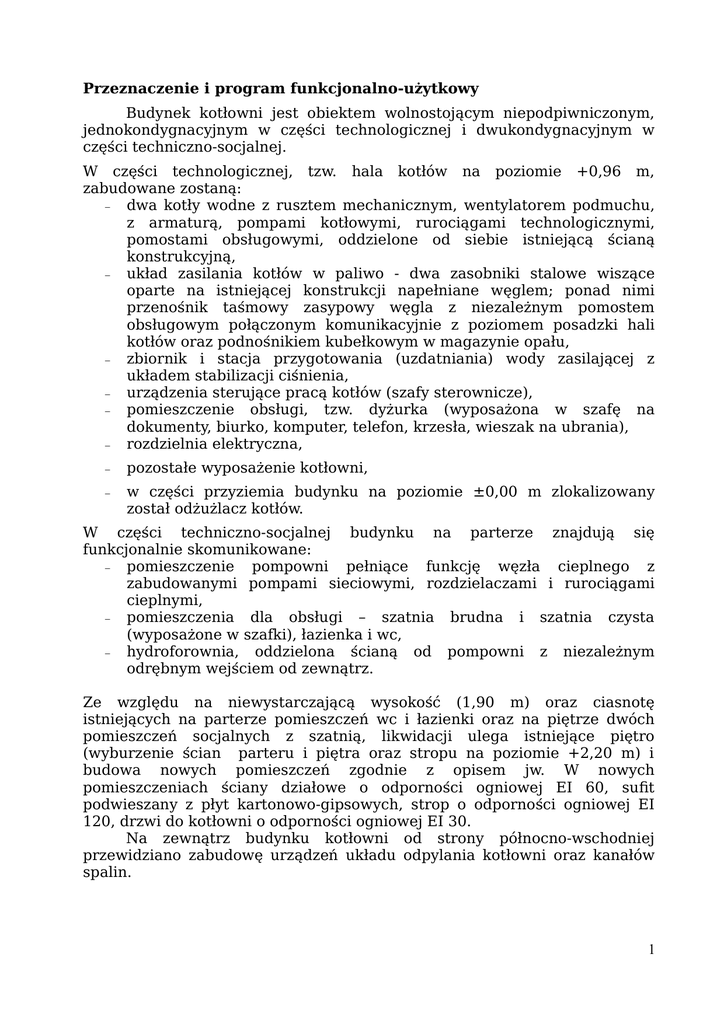 Przeznaczenie i program funkcjonalno-użytkowy Budynek kotłowni jest obiektem wolnostojącym niepodpiwniczonym, jednokondygnacyjnym w części technologicznej i dwukondygnacyjnym w części techniczno-socjalnej. W części technologicznej, tzw. hala kotłów na poziomie +0,96 m, zabudowane zostaną: − dwa kotły wodne z rusztem mechanicznym, wentylatorem podmuchu, z armaturą, pompami kotłowymi, rurociągami technologicznymi, pomostami obsługowymi, oddzielone od siebie istniejącą ścianą konstrukcyjną, − układ zasilania kotłów w paliwo - dwa zasobniki stalowe wiszące oparte na istniejącej konstrukcji napełniane węglem; ponad nimi przenośnik taśmowy zasypowy węgla z niezależnym pomostem obsługowym połączonym komunikacyjnie z poziomem posadzki hali kotłów oraz podnośnikiem kubełkowym w magazynie opału, − zbiornik i stacja przygotowania (uzdatniania) wody zasilającej z układem stabilizacji ciśnienia, − urządzenia sterujące pracą kotłów (szafy sterownicze), − pomieszczenie obsługi, tzw. dyżurka (wyposażona w szafę na dokumenty, biurko, komputer, telefon, krzesła, wieszak na ubrania), − rozdzielnia elektryczna, − pozostałe wyposażenie kotłowni, − w części przyziemia budynku na poziomie ±0,00 m zlokalizowany został odżużlacz kotłów. W części techniczno-socjalnej budynku na parterze znajdują się funkcjonalnie skomunikowane: − pomieszczenie pompowni pełniące funkcję węzła cieplnego z zabudowanymi pompami sieciowymi, rozdzielaczami i rurociągami cieplnymi, − pomieszczenia dla obsługi – szatnia brudna i szatnia czysta (wyposażone w szafki), łazienka i wc, − hydroforownia, oddzielona ścianą od pompowni z niezależnym odrębnym wejściem od zewnątrz. Ze względu na niewystarczającą wysokość (1,90 m) oraz ciasnotę istniejących na parterze pomieszczeń wc i łazienki oraz na piętrze dwóch pomieszczeń socjalnych z szatnią, likwidacji ulega istniejące piętro (wyburzenie ścian parteru i piętra oraz stropu na poziomie +2,20 m) i budowa nowych pomieszczeń zgodnie z opisem jw. W nowych pomieszczeniach ściany działowe o odporności ogniowej EI 60, suft podwieszany z płyt kartonowo-gipsowych, strop o odporności ogniowej EI 120, drzwi do kotłowni o odporności ogniowej EI 30. Na zewnątrz budynku kotłowni od strony północno-wschodniej przewidziano zabudowę urządzeń układu odpylania kotłowni oraz kanałów spalin. 1 W części południowo-wschodniej działki zlokalizowany zostanie magazyn opału składający się z właściwej części magazynowej oraz części do rozładunku samochodów dowożących węgiel. Szczegóły rozwiązań należy opracować w projektach branżowych będących przedmiotem odrębnych opracowań. Zestawienie powierzchni pomieszczeń Kotłownia a) parter: − 01 hala kotłów nr 1 − 02 hala kotłów nr 2 − 03 pompownia − 04 hydroforownia − 05 szatnia czysta − 06 szatnia brudna − 07 łazienka+wc − 08 dyżurka − 09–komunikacja − razem parter 67,57 m2 46,83 m2 24,16 m2 28,27 m2 4,00 m2 5,27 m2 9,54 m2 8,83m2 3,16 m2 197,63 m2 b) 10 poziom odżużlania (pow. wchodząca w pow. hali kotłów) c) 1.1 poziom nawęglania Pow. użytkowa 21,71 m2 38,13 m2 razem wszystkie pomieszczenia 235,76 m2 Pozostałe obiekty Według p.2.5. Projektu zagospodarowania działki Pozostałe dane Budynek kotłowni Powierzchnia zabudowy 221,20 m2 Wysokość (maksymalna) 8,40 m Długość maksymalna Szerokość maksymalna Kubatura 23,8 m 9,50 m 1426,40 m3 Magazyn opału Powierzchnia zabudowy 200,00 m2 Wysokość (maksymalna) ok. 5,40 m Długość maksymalna m 25,00 2 Szerokość maksymalna m 8,00 Pozostałe obiekty Według p.2.5. Projektu zagospodarowania działki Forma architektoniczna Budynek kotłowni o dość prostej bryle zewnętrznej nawiązujący formą architektoniczną do sąsiednich obiektów. Obłożony z zewnątrz okładziną klinkierową. Wewnątrz składający się z części technicznej i części socjalnej. Część tecniczna mieści w sobie pomieszczenie kotłów z pomostem technicznym. Część socjalna jednokondygnacyjna wydzielona pożarowo z całości obiektu. Dachy dwuspadowe o jednakowym nachyleniu, ok. 7°. W ścianach zewnętrznych obiektu, oprócz okien, drzwi i bram zaprojektowano otwory technologiczne umożliwiające zasyp opału taśmociągiem, odżużlanie, wyprowadzenie przewodów do wolnostojących w pobliżu urządzeń odpylających, pobieranie powietrza z zewnątrz (czerpnie). Dostępność dla osób niepełnosprawnych Ze względu na to, że projektowany obiekt jest obiektem przemysłowym, nie ogólnodostępnym i niebędącym zakładem pracy chronionej nie przewidziano wejść dostępnych dla osób niepełnosprawnych. Opis elementów konstrukcji i wykończenia budynku Budynek kotłowni murowany wykonany w technologii szkieletowej – słupy żelbetowe z wypełnieniem cegłami ceramicznymi grubości 25 mm na zaprawie cementowo-wapiennej. Ściany fundamentowe z cegły ceramicznej pełnej, na zaprawie cementowo – wapiennej, o gr. 25 cm. Izolacja przeciwwilgociowa ścian fundamentowych do poziomu ok. 0,5 m p.p.t. Przewiduje się szereg konstrukcji stalowych wsporczych pod różne urządzenia, np. pod podajnik taśmowy poziomy, pod pomosty techniczne oraz stalową konstrukcję komunikacji pionowej. Dokładne dane w części opisowej projektu konstrukcji. Ściany zewnętrzne tynkowane, od zewnątrz obłożone elewacją klinkierową z funkcją termoizolacji typu LAF SYSTEM 80 w kolorze zbliżonym do kolorystyki istniejącej zabudowy. LAF SYSTEM to gotowe elementy złożone z płytek klinkierowych gr. 16 mm fabrycznie zatopionych w sztywną płytę gr. 64 mm wykonaną z pianki poliuretanowej. Łączna grubość płyty wynosi 80 mm, współczynnik przenikania ciepła płyty wynosi U=0,368 W/m 2K przy wartości współczynnika λ=0,025W/mK. Współczynnik przenikania ciepła tak skonstruowanej ściany zewnętrznej wyniesie U=0,25 W/m 2K. Ściany wewnętrzne 