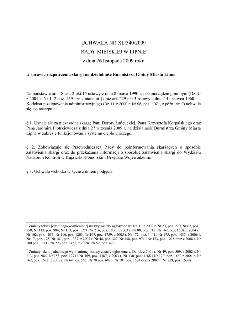 UCHWAŁA NR XL/340/2009 RADY MIEJSKIEJ W LIPNIE z dnia 26 listopada 2009 roku w sprawie rozpatrzenia skargi na działalność Burmistrza Gminy Miasta Lipna Na podstawie art. 18 ust. 2 pkt 15 ustawy z dnia 8 marca 1990 r. o samorządzie gminnym (Dz. U z 2001 r. Nr 142 poz. 1591 ze zmianami1) oraz art. 229 pkt 3 ustawy z dnia 14 czerwca 1960 r. Kodeksu postępowania administracyjnego (Dz. U. z 2000 r. Nr 98, poz. 1071, z późn. zm.2)) uchwala się, co następuje: § 1. Uznaje się za niezasadną skargę Pani Doroty Łańcuckiej, Pana Krzysztofa Korpalskiego oraz Pana Jaromira Piotrkiewicza z dnia 27 września 2009 r. na działalność Burmistrza Gminy Miasta Lipna w zakresie funkcjonowania systemu ciepłowniczego. § 2. Zobowiązuje się Przewodniczącą Rady do poinformowania skarŜących o sposobie załatwienia skargi oraz do przekazania informacji o sposobie załatwienia skargi do Wydziału Nadzoru i Kontroli w Kujawsko-Pomorskim Urzędzie Wojewódzkim. § 3. Uchwała wchodzi w Ŝycie z dniem podjęcia. ------------------------------------------------------------------------------------------------1) Zmiany tekstu jednolitego wymienionej ustawy zostały ogłoszone w: Dz. U. z 2002 r. Nr 23, poz. 220, Nr 62, poz. 558, Nr 113, poz. 984, Nr 153, poz. 1271, Nr 214, poz. 1806, z 2003 r. Nr 80, poz. 717, Nr 162, poz. 1568, z 2004 r. Nr 102, poz. 1055, Nr 116, poz. 1203, Nr 167, poz. 1759, z 2005 r. Nr 172, poz. 1441 i Nr 175, poz. 1457, z 2006 r. Nr 17, poz. 128, Nr 181, poz. 1337, z 2007 r. Nr 48, poz. 327, Nr 138, poz. 974 i Nr 173, poz. 1218 oraz z 2008 r. Nr 180 poz. 1111 i Nr 223 poz. 1458, z 2009r. Nr 52, poz. 420. 2) Zmiany tekstu jednolitego wymienionej ustawy zostały ogłoszone w Dz. U. z 2001 r. Nr 49, poz. 509, z 2002 r. Nr 113, poz. 984, Nr 153, poz. 1271 i Nr 169, poz. 1387, z 2003 r. Nr 130, poz. 1188 i Nr 170, poz. 1660 z 2004 r. Nr 162, poz. 1692, z 2005 r. Nr 64 poz. 565, Nr 78 poz. 682, i Nr 181 poz. 1524 oraz z 2008 r. Nr 229, poz. 1539) UZASADNIENIE do uchwały Nr XL/340/2009 Rady Miejskiej w Lipnie z dnia 26 listopada 2009 roku w sprawie rozpatrzenia skargi na działanie Burmistrza Miasta Lipna W dniu 26 października 2009 roku do Przewodniczącej Rady Miejskiej w Lipnie wpłynęło od Pana Rafała Bruskiego Wojewody Kujawsko-Pomorskiego pismo przekazujące zgodnie z właściwością skargę Pani Doroty Łańcuckiej, Pana Krzysztofa Korpalskiego oraz Pana Jaromira Piotrkiewicza z dnia 27 września 2009 r. na działalność Burmistrza Gminy Miasta Lipna w zakresie m.in. funkcjonowania systemu ciepłowniczego. SkarŜący w swoim piśmie wskazują m.in. na nieprawidłowy ich zdaniem sposób rozliczania opłat za ciepłą wodę mieszkańców na Osiedlu Reymonta, zbyt wysokie ceny podgrzania wody, nieuzasadnione róŜnice w kosztach podgrzania wody występujące na Osiedlu Reymonta w stosunku do Osiedla Korczaka, naliczenie bezpodstawnie dopłat za ogrzewanie mieszkańcom Osiedla Reymonta. Obszernie do przedstawionych zarzutów ustosunkowała się likwidator Zakładu Obsługi Komunalnej miasta Lipna w likwidacji pismem z dnia 5 listopada 2009 r. W szczególności wyjaśniono, iŜ Zakład Gospodarki Komunalnej Miasta Lipna w likwidacji zarządza 91 budynkami mieszkalnymi oraz jest producentem i dystrybutorem ciepła do budynków komunalnych, wspólnot mieszkaniowych, w tzw. zarządzie przymusowym oraz do budynków w zarządzie spółdzielni mieszkaniowych które jest dostarczane odbiorcom i sprzedawane za ceny ustalone zgodnie z zatwierdzonymi przez Urząd Regulacji Energetyki taryfami. Zgodnie z aktualnie obowiązującą taryfa zatwierdzoną decyzją z dnia 30.12.2008 r. Urzędu Regulacji Energetyki sygn. OPO-4210-81(10)/2008/603/VII/AgS ogłoszoną w Dzienniku Urzędowym Województwa Kujawsko-Pomorskiego z 31.12.2008r. Nr 175, poz. 3078 stosowane dla poszczególnych kotłowni ceny znacznie się róŜnią i wynoszą dla kotłowni „Konwektor” 70,98zł/1GJ, dla kotłowni Reymonta 103,66 zł/1GJ oraz dla kotłowni Komunalnej 90,60zł/1GJ niemniej ceny i stawki opłat takŜe zdaniem URE zostały skalkulowane na podstawie uzasadnionych kosztów prowadzenia działalności przez producenta ciepła. Zatwierdzone taryfy stały się podstawą stosowanych cen za dostarczenie ciepła i podgrzanie ciepłej wody. Wyjaśniono, Ŝe problem dopłat do zaliczek dotknął przede wszystkim mieszkańców budynków ogrzewanych z kotłowni opalanych olejem opałowym, w których cena 1GJ jest największa. Podniesiono, Ŝe odbiorcami ciepła są poszczególne wspólnoty bądź spółdzielnie, Ŝe to z nimi a nie z posiadaczami poszczególnych lokali mieszkalnych zawarte są umowy oraz Ŝe kaŜdy z odbiorców (wspólnota lub spółdzielnia) dokonuje rozliczenia na poszczególne lokale. Wskazano, Ŝe aby uniknąć dopłat zaliczki mieszkańców budynków ogrzewanych z kotłowni olejowych powinni wnieść zaliczki, średnio w wysokości 5,40 zł za m2 powierzchni a nie w wysokości ok. 3,86 zł za m2 powierzchni oraz Ŝe podany w załączniku do skargi przykład rozliczenia lokali jest zgodny z poniesionymi kosztami budynku i rodzi średnią dopłatę w wysokości 613 zł za 2008 r. (1,25 zł do 1 m2 powierzchni). Podkreślono, Ŝe obowiązujące regulacje prawne nie pozwalają na uśrednianie cen ciepła dla wszystkich mieszkań zasilanych z róŜnych źródeł ciepła. Wyjaśniono, Ŝe cena ciepła dostarczanego z tej samej kotłowni jest taka sama jednak w zaleŜności od ilości zuŜytego ciepła (na która ma wpływ m.in. stan instalacji wewnętrznej, ocieplenie budynku, temperatura wody) wartość sprzedanego ciepła będzie róŜna dla róŜnych budynków. W związku z tym będą róŜne obciąŜenia poszczególnych mieszkań za ciepło w róŜnych budynkach nawet, gdy mieszkania będą o tej samej powierzchni. Do twierdzeń zawartych w skardze ustosunkowała się równieŜ Rada nadzorcza Spółdzielni Mieszkaniowej Os. Gen. Wł. Sikorskiego w Lipnie pismem z dnia 29 października 2009 r. Ws