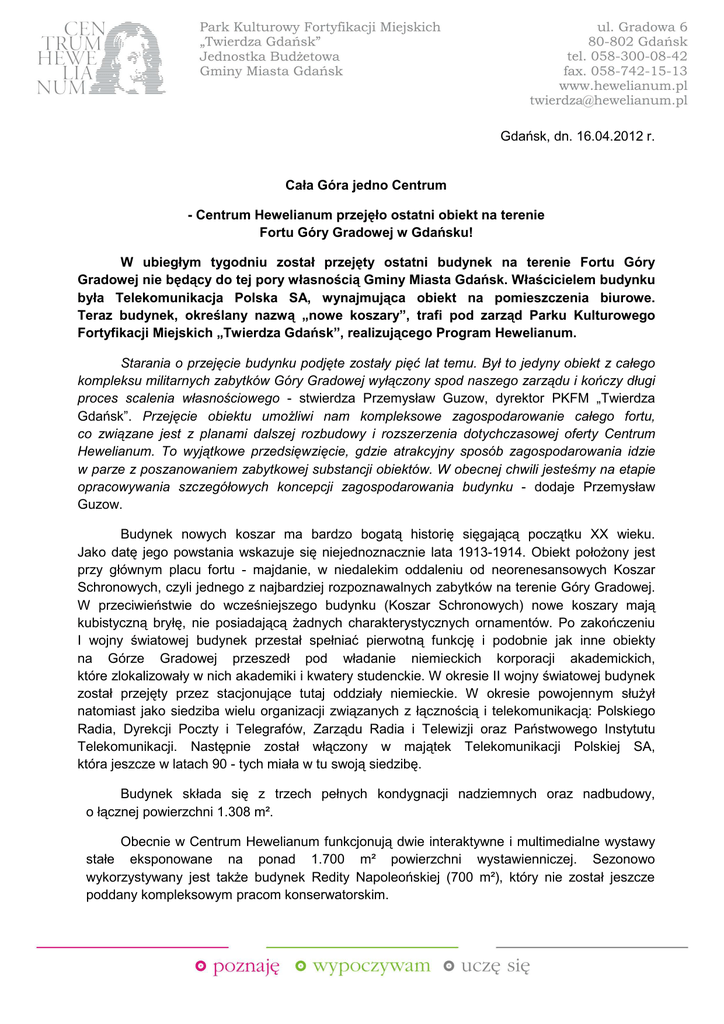 Gdańsk, dn. 16.04.2012 r. Cała Góra jedno Centrum - Centrum Hewelianum przejęło ostatni obiekt na terenie Fortu Góry Gradowej w Gdańsku! W ubiegłym tygodniu został przejęty ostatni budynek na terenie Fortu Góry Gradowej nie będący do tej pory własnością Gminy Miasta Gdańsk. Właścicielem budynku była Telekomunikacja Polska SA, wynajmująca obiekt na pomieszczenia biurowe. Teraz budynek, określany nazwą „nowe koszary”, trafi pod zarząd Parku Kulturowego Fortyfikacji Miejskich „Twierdza Gdańsk”, realizującego Program Hewelianum. Starania o przejęcie budynku podjęte zostały pięć lat temu. Był to jedyny obiekt z całego kompleksu militarnych zabytków Góry Gradowej wyłączony spod naszego zarządu i kończy długi proces scalenia własnościowego - stwierdza Przemysław Guzow, dyrektor PKFM „Twierdza Gdańsk”. Przejęcie obiektu umożliwi nam kompleksowe zagospodarowanie całego fortu, co związane jest z planami dalszej rozbudowy i rozszerzenia dotychczasowej oferty Centrum Hewelianum. To wyjątkowe przedsięwzięcie, gdzie atrakcyjny sposób zagospodarowania idzie w parze z poszanowaniem zabytkowej substancji obiektów. W obecnej chwili jesteśmy na etapie opracowywania szczegółowych koncepcji zagospodarowania budynku - dodaje Przemysław Guzow. Budynek nowych koszar ma bardzo bogatą historię sięgającą początku XX wieku. Jako datę jego powstania wskazuje się niejednoznacznie lata 1913-1914. Obiekt położony jest przy głównym placu fortu - majdanie, w niedalekim oddaleniu od neorenesansowych Koszar Schronowych, czyli jednego z najbardziej rozpoznawalnych zabytków na terenie Góry Gradowej. W przeciwieństwie do wcześniejszego budynku (Koszar Schronowych) nowe koszary mają kubistyczną bryłę, nie posiadającą żadnych charakterystycznych ornamentów. Po zakończeniu I wojny światowej budynek przestał spełniać pierwotną funkcję i podobnie jak inne obiekty na Górze Gradowej przeszedł pod władanie niemieckich korporacji akademickich, które zlokalizowały w nich akademiki i kwatery studenckie. W okresie II wojny światowej budynek został przejęty przez stacjonujące tutaj oddziały niemieckie. W okresie powojennym służył natomiast jako siedziba wielu organizacji związanych z łącznością i telekomunikacją: Polskiego Radia, Dyrekcji Poczty i Telegrafów, Zarządu Radia i Telewizji oraz Państwowego Instytutu Telekomunikacji. Następnie został włączony w majątek Telekomunikacji Polskiej SA, która jeszcze w latach 90 - tych miała w tu swoją siedzibę. Budynek składa się z trzech pełnych kondygnacji nadziemnych oraz nadbudowy, o łącznej powierzchni 1.308 m². Obecnie w Centrum Hewelianum funkcjonują dwie interaktywne i multimedialne wystawy stałe eksponowane na ponad 1.700 m² powierzchni wystawienniczej. Sezonowo wykorzystywany jest także budynek Redity Napoleońskiej (700 m²), który nie został jeszcze poddany kompleksowym pracom konserwatorskim. Na przełomie roku 2012/2013, dzięki pozyskaniu dotacji w wysokości ponad 10 mln zł, dla gości Centrum Hewelianum udostępnionych zostanie kolejnych 2.200 m² powierzchni. W odrestaurowanych obiektach znajdą się między innymi laboratorium Pana Kleksa, wystawa poświęcona Ziemi, interaktywna ekspozycja matematyczna, multimedialnie przedstawiona historia oraz ekspozycja „Hewelianum bez barier” - dedykowana osobom niepełnosprawnym. Dodatkowo w budynku Koszar Schronowych będą także pomieszczenia przeznaczone na ekspozycje czasowe oraz organizację wydarzeń i imprez specjalnych. Centrum Hewelianum to unikalny nie tylko w skali kraju, ale także Europy pomysł na zagospodarowanie zabytkowego obszaru militarnego fortu. Adaptacja historycznych, XIX-wiecznych budynków zamienia to miejsce w niepowtarzalne centrum nauki, gdzie samodzielnie możemy wykonywać doświadczenia, poznawać tajniki różnych dziedzin wiedzy oraz spędzić czas w ciekawym otoczeniu - wyjaśnia Przemysław Guzow. W Centrum Hewelianum doświadczamy także żywej przyrody, a na 25 ha pofortecznego parku możemy odnaleźć liczne gatunki roślin i zwierząt, w tym pomniki przyrody czy użytki ekologiczne z chronionymi tu nietoperzami - to wszystko odróżnia nas od innych centrów nauki. O potencjale Centrum Hewelianum świadczy także fakt, że docelowo dysponować będzie ponad 8.000 m² powierzchni użytkowej w budynkach, które są dyskretnie wplecione w zabytkowy obszar fortu dodaje Przemysław Guzow. Fort Góry Gradowej rewitalizowany jest etapami, podczas których kolejno przywracana jest świetność poszczególnych fragmentów całego założenia i konkretnych budynków. Pierwszy etap inwestycji rozpoczął się w 2007 roku, a jego efektem było 18 odrestaurowanych obiektów, 8 ha zrewitalizowanej przestrzeni oraz dwie wystawy stałe (interaktywna wystawa „Energia, Niebo i Słońce” oraz multimedialna wystawa „Wehikuł Czasu - Człowiek i Pocisk”). Całość kosztów zakończonej w 2008 roku inwestycji wyniosła prawie 22 mln zł. Z końcem 2009 roku rozpoczęła się realizacja kolejnych dwóch projektów pn. „Centrum Hewelianum. Budowa kompleksu edukacyjno-rekreacyjnego w Gdańsku. Etap I B” i „Adaptacja Centrum Hewelianum w Gdańsku na potrzeby naukowo-dydaktyczne pomorskich szkół wyższych”. Projekty są współfinansowane ze środków Europejskiego Funduszu Rozwoju Regionalnego w ramach Regionalnego Programu Operacyjnego dla Województwa Pomorskiego na lata 2007-2013. Łączny koszt realizacji wyniesie ponad 18 mln zł. Pierwsze wystawy, będące efektem trwających prac, otwarte zostaną jeszcze przed końcem bieżącego roku. Lucyna Rokitiańska, [email protected] tel. 662 068 173; (58) 300 08 42 wew.43