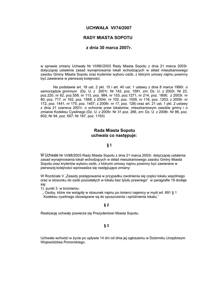 UCHWAŁA VI/74/2007 RADY MIASTA SOPOTU z dnia 30 marca