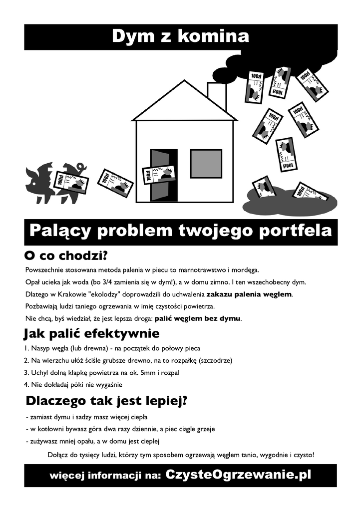 Dym z komina Palący problem twojego portfela O co chodzi? Powszechnie stosowana metoda palenia w piecu to marnotrawstwo i mordęga. Opał ucieka jak woda (bo 3/4 zamienia się w dym!), a w domu zimno. I ten wszechobecny dym. Dlatego w Krakowie "ekolodzy" doprowadzili do uchwalenia zakazu palenia węglem . Pozbawiają ludzi taniego ogrzewania w imię czystości powietrza. Nie chcą, byś wiedział, że jest lepsza droga: palić węglem bez dymu . Jak palić efektywnie 1 . Nasyp węgla (lub drewna) - na początek do połowy pieca 2. Na wierzchu ułóż ściśle grubsze drewno, na to rozpałkę (szczodrze) 3. Uchyl dolną klapkę powietrza na ok. 5mm i rozpal 4. Nie dokładaj póki nie wygaśnie Dlaczego tak jest lepiej? - zamiast dymu i sadzy masz więcej ciepła - w kotłowni bywasz góra dwa razy dziennie, a piec ciągle grzeje - zużywasz mniej opału, a w domu jest cieplej Dołącz do tysięcy ludzi, którzy tym sposobem ogrzewają węglem tanio, wygodnie i czysto! więcej informacji na: CzysteOgrzewanie.pl