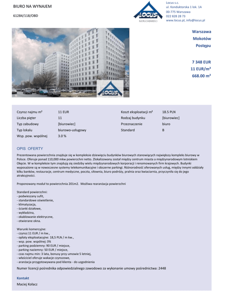 Warszawa Mokotów Postępu 7 348 EUR 11 EUR/m² 668.00 m²