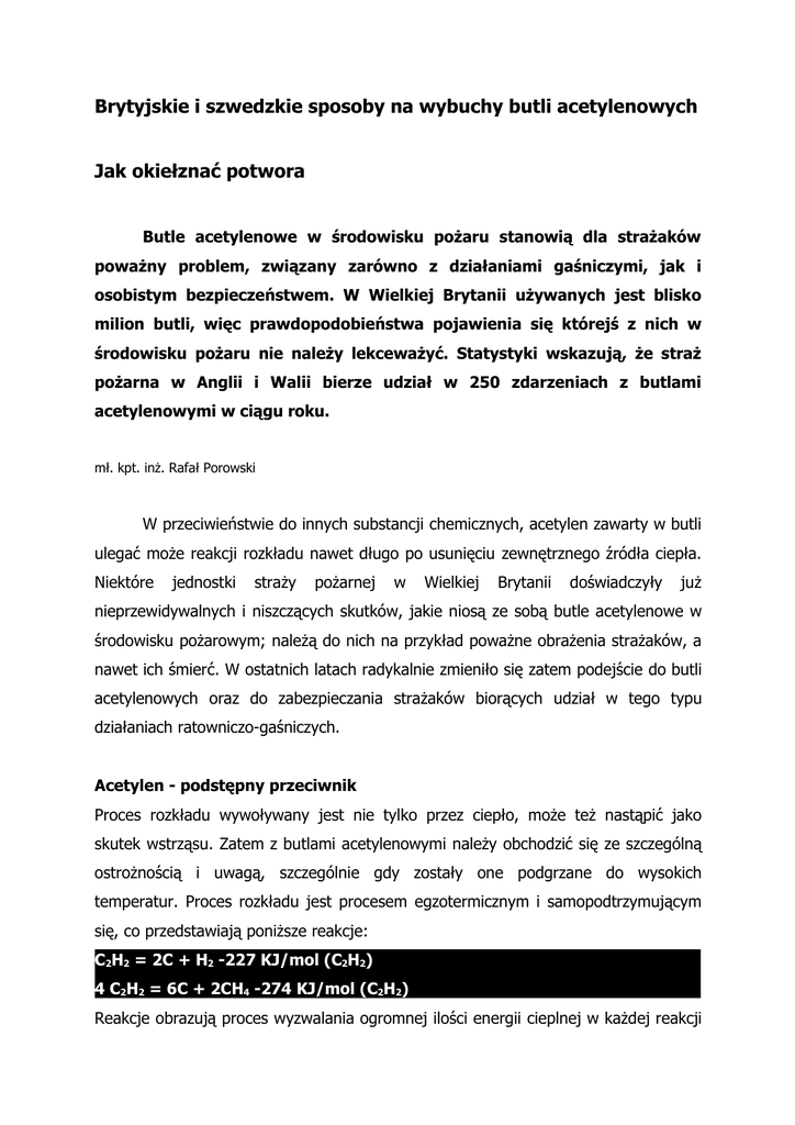 Brytyjskie i szwedzkie sposoby na wybuchy butli acetylenowych Jak okiełznać potwora Butle acetylenowe w środowisku pożaru stanowią dla strażaków poważny problem, związany zarówno z działaniami gaśniczymi, jak i osobistym bezpieczeństwem. W Wielkiej Brytanii używanych jest blisko milion butli, więc prawdopodobieństwa pojawienia się którejś z nich w środowisku pożaru nie należy lekceważyć. Statystyki wskazują, że straż pożarna w Anglii i Walii bierze udział w 250 zdarzeniach z butlami acetylenowymi w ciągu roku. mł. kpt. inż. Rafał Porowski W przeciwieństwie do innych substancji chemicznych, acetylen zawarty w butli ulegać może reakcji rozkładu nawet długo po usunięciu zewnętrznego źródła ciepła. Niektóre jednostki straży pożarnej w Wielkiej Brytanii doświadczyły już nieprzewidywalnych i niszczących skutków, jakie niosą ze sobą butle acetylenowe w środowisku pożarowym; należą do nich na przykład poważne obrażenia strażaków, a nawet ich śmierć. W ostatnich latach radykalnie zmieniło się zatem podejście do butli acetylenowych oraz do zabezpieczania strażaków biorących udział w tego typu działaniach ratowniczo-gaśniczych. Acetylen - podstępny przeciwnik Proces rozkładu wywoływany jest nie tylko przez ciepło, może też nastąpić jako skutek wstrząsu. Zatem z butlami acetylenowymi należy obchodzić się ze szczególną ostrożnością i uwagą, szczególnie gdy zostały one podgrzane do wysokich temperatur. Proces rozkładu jest procesem egzotermicznym i samopodtrzymującym się, co przedstawiają poniższe reakcje: C2H2 = 2C + H2 -227 KJ/mol (C2H2) 4 C2H2 = 6C + 2CH4 -274 KJ/mol (C2H2) Reakcje obrazują proces wyzwalania ogromnej ilości energii cieplnej w każdej reakcji chemicznej, w której zostaje rozbita cząsteczka acetylenu. Wzrost temperatury i ciśnienia odgrywa znaczącą rolę w podsycaniu rozkładu. Uzależnione jest to od wielu czynników i związane z rozszerzalnością objętościową cieczy, jak również produkcją prądów konwekcyjnych wewnątrz rozpuszczalnika. Proces rozkładu zależy głównie od bilansu cieplnego. Jeśli przyrost ciepła wewnątrz butli jest większy niż straty ciepła, wówczas zajdzie reakcja rozkładu. Rozpocznie się ona, gdy energia wewnątrz butli będzie wystarczająca, by spowodować jej gwałtowny wzrost. Energia ta nosi nazwę energii aktywacji, a czas prowadzący do zaistnienia reakcji rozkładu nazywa się okresem indukcji. Całe to zjawisko znane jest jako wybuch cieplny i występuje w każdym układzie, gdzie przyrost ciepła jest większy niż jego straty. Kiedy faza ta zostanie osiągnięta, przyrząd mierzący zmiany ciśnienia lub temperatury zamontowany do butli będzie wskazywał małe wartości, podczas gdy reakcja będzie przebiegała bardzo szybko. Eksplozja butli acetylenowej na skutek wybuchu cieplnego pociąga za sobą szereg innych niebezpieczeństw. Jednym z nich jest powstanie tzw. ognistej kuli, która wydziela energię w postaci promieniowania cieplnego, kolejnym - wytworzenie fali uderzeniowej podczas rozprężania gazów. Ustalono, że najpoważniejsze obrażenia odnoszone przez strażaków podczas tego typu wydarzeń to złamania kości, utrata kończyn, a nierzadko śmierć. Ministerstwo Spraw Wewnętrznych Wielkiej Brytanii zaleca... Na Wyspach zbiór zasad postępowania wprowadzony w 1992 r. po serii poważnych z butlami acetylenowymi został wypadków w latach 80. Przepis ten mówi, że jeżeli istnieje jakikolwiek powód, by sądzić, że proces rozkładu acetylenu został zapoczątkowany, butla koniecznie musi być pozostawiona na miejscu i intensywnie chłodzona prądem rozproszonym o dużej intensywności. Ustalenia, czy butla jest wystarczająco zimna, nie można rozpocząć wcześniej niż po upływie 1 godziny od momentu rozpoczęcia chłodzenia. Jeżeli nie zaobserwowano żadnych oznak parowania, butlę należy pozostawić na okres 30 minut. Po tym czasie należy sprawdzić obecność gorących miejsc na butli przez dotyk ręką. Gdy butla jest zimna, powinno się pozostawić ją na dalsze 30 minut. Jeśli po tym czasie butla jest nadal zimna, trzeba ją delikatnie i ostrożnie zanurzyć w zbiorniku z wodą na 12 godzin. Jeżeli po tym czasie butla wykazuje jakiekolwiek wzrosty temperatury, natychmiast należy podać prądy wody, a cały proces powtórzyć. Wspomniane okresy oczekiwania wyznaczane są według Ministerstwa Spraw Wewnętrznych Wielkiej Brytanii z uwagi na niskie przewodnictwo cieplne masy wypełniającej butlę. Jeżeli po chłodzeniu butli przez godzinę nadal istnieje możliwość wymiany ciepła, to jej szybkość będzie zależała od przewodnictwa cieplnego masy. Wymiana ciepła, ogólnie rzecz biorąc, jest procesem bardzo powolnym. Także czas potrzebny do schłodzenia ciepłych obszarów wewnątrz butli zależy od szybkości wymiany ciepła pomiędzy zimnymi ściankami butli a jej wewnętrzną masą. Istota tego przepisu opiera się na dwóch zasadach: na obserwacji i na dotyku. Pierwsza z nich prowadzi do określenia, czy powierzchnia butli jest wilgotna po przerwaniu procesu chłodzenia, np. czy butla nie paruje. Druga stosowana jest do określenia stabilności acetylenu, a także zewnętrznej temperatury poprzez dotyk ręką. do natomiast oszacowania Dokładność obydwu metod niestety pozostawia wiele do życzenia. Przepis ten neguje także termowizyjnych, zasada twierdząc, że urządzenia te nie oddają użycie kamer prawdziwej wartości temperatury, pokazując jedynie obecność ciepła w skorupie butli. Wydaje się. zatem, że jeśli nie można polegać na nowoczesnej technologii, to tym bardziej nieodpowiednie jest tu użycie ludzkiej dłoni. Minimalny czas od momentu rozpoczęcia procesu chłodzenia do włożenia butli do zbiornika z wodą wynosi 2 godziny. Z przytoczonej wyżej instrukcji wynika, że samo umieszczenie butli w zbiorniku z wodą na kolejne 12 godzin nie wystarcza, by stwierdzić,