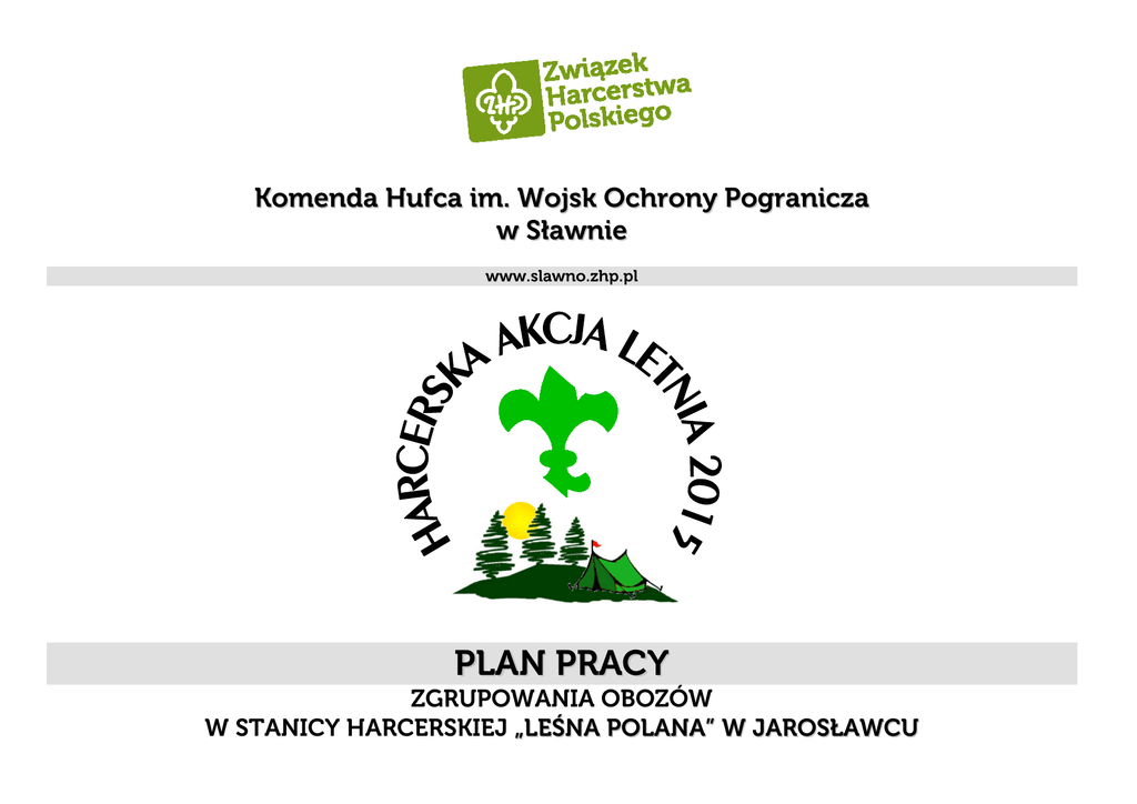 Komenda Hufca im. Wojsk Ochrony Pogranicza w Sławnie www.slawno.zhp.pl PLAN PRACY ZGRUPOWANIA OBOZÓW W STANICY HARCERSKIEJ „LEŚNA POLANA” W JAROSŁAWCU CZĘŚĆ INFORMACYJNA: # Uczestnicy: Uczestnikami zgrupowania będą zuchy, harcerze oraz młodzież niezorganizowana. Przyjazd uczestników we własnym zakresie. # Sposób prowadzenia żywienia: Żywienie zbiorowe na bazie kuchni i stołówki. # Sposób zakwaterowania: Zakwaterowanie w pawilonach, domkach, apartamentach i namiotach typu NS. Stanica Harcerska „Leśna Polana”, ul. Bałtycka 2, 76-107 Jarosławiec. # Terminy turnusów: Turnus I II III IV Termin - 2 8.0 6 13 .07 2 8.0 7 1 1.0 8 – – – – 1 1.0 7 26. 07 10 .0 8 2 4. 08 CZĘŚĆ PROGRAMOWA: # Cele placówki: 1. Rozwijanie zainteresowań turystycznych i krajoznawczych przez organizowanie wycieczek pieszych i autokarowych oraz zwiadów i rajdów. 2. Rozwijanie zainteresowań kulturalnych przez naukę piosenek oraz propagowanie gier, zabaw i pląsów. 3. Wyrabianie nawyków kulturalnego zachowania zgodnego z elementarnymi zasadami kultury osobistej i etyki moralnej. 4. Podnoszenie sprawności fizycznej przez organizowanie imprez o charakterze sportowym i sprawnościowym – „zdrowo na sportowo”. Wyrabianie nawyków w zakresie postawy higieny osobistej. 5. Pogłębianie wiedzy w zakresie historii i dziejów współczesnych Polski oraz tradycji i obyczajowości ZHP przez udział w uroczystościach państwowych. 6. Rozwijanie umiejętności współdziałania w grupie poprzez udział w zajęciach programowych i rywalizacji. Wyrabianie umiejętności zdrowego współzawodnictwa poprzez organizowanie plebiscytów i konkursów. 7. Zdobywanie stopni i sprawności (dotyczy zuchów i harcerzy) poprzez organizowanie zwiadów, biegów i gier terenowych. 8. Propagowanie walorów czynnego wypoczynku poprzez organizowanie zajęć sportowych i integracyjnych na świeżym powietrzu. Propagowanie wiedzy na temat bezpieczeństwa ze szczególnym uwzględnieniem obowiązujących regulaminów i przepisów. 9. Rozwijanie zdolności manualnych i estetycznych przez organizację zajęć plastycznych. 10. Rozwijanie zdolności i umiejętności muzycznych, tanecznych przez organizowanie zajęć oraz imprez muzycznych i festiwali. 11. Propagowanie stylu życia zgodnego z naturą poprzez organizowanie zwiadów ekologicznych. 12. Propagowanie wiedzy o organizacjach skautowych poprzez realizację zadań wynikających z propozycji programowych ZHP. # Propozycja programowa dla drużyn obozowych: Dzień 1 2 Zajęcia przedpołudniowe Przyjazd i zakwaterowanie: przydział miejsc, zapoznanie z terenem obozowania. Obozowa majsterka „Zdobnictwo obozowe”. Zwiad środowiskowy „Moje małe odkrycia” – zwiedzanie miejscowości. Konkurs plastyczny o tematyce morskiej. 3 4 Inauguracja Letnich Igrzysk Olimpijskich. Zajęcia popołudniowe Zapoznanie z regulaminami obowiązującymi na obozie: uczestnika, poruszania się po drogach, kąpieli, ochrony przeciwpożarowej, służby wartowniczej, zastępu służbowego oraz korzystania ze sprzętu sportowego. Przygotowanie programu ogniska. Nauka piosenek i pląsów. Gra terenowa. Przygotowanie do wystawy prac zdobnictwa obozowego. Zajęcia sportowe: mecz piłki nożnej, turniej badmintona, mecz tenisa stołowego. Turniej gier i zabaw skautowych. Nauka piosenek i pląsów. 6 Zajęcia na plaży. Konkurs budowli z piasku. Przygotowanie do Festiwalu piosenki wakacyjnej. 7 Konkurs plastyczny „ZHP w moich wyobrażeniach”. Zajęcia sportowe: turniej piłki ręcznej, biegi, turniej „Dwa ognie”. Poznajemy pasje i zawody ludzi: pokaz sprzętu pożarniczego. Zawody strażackie. Realizacja programu własnego drużyn obozowych. Poznajemy pasje i zawody ludzi: zwiedzanie latarni morskiej. Rejs statkiem. Realizacja programu własnego drużyn obozowych. Przygotowanie do Jarmarku Cudów. Jarmark Cudów. Przygotowanie do „Mini listy przebojów”. Realizacja programu własnego drużyn obozowych. Dzień rekordów. Ustanawiamy rekordy obozowe. 5 8 9 10 Zwiad ekologiczny. Wystawa prac wykonanych z materiałów ekologicznych. Zajęcia wieczorne Wybór nazw drużyn oraz funkcyjnych obozu. Wycieczka nad morze „Obserwujemy zachód słońca”. Ognisko pn. „Poznajemy się”. Najlepsza reklama drużyny obozowej. Obozowa majsterka „Zdobnictwo obozowe” – prezentacja prac. Rozstrzygnięcie konkursu plastycznego o tematyce morskiej. Gry i zabawy przy muzyce. Realizacja programu własnego drużyn obozowych. Zajęcia sportowe: mecz piłki siatkowej, gry i zabawy sportowe na wesoło. Festiwal piosenki wakacyjnej. Świeczkowisko tematyczne. Wystawa prac konkursowych „ZHP w moich wyobrażeniach”. Poznajemy pasje i zawody ludzi: spotkanie z funkcjonariuszami Straży Granicznej. Realizacja programu własnego drużyn obozowych. Kabareton – parodia osób i sytuacji. Zajęcia muzyczne – nauka piosenek. „Mini lista przebojów”. Uwagi Dzień 11 12 13 14 Zajęcia przedpołudniowe „Harcerz jest pożyteczny...” Dzień Niewidzialnej Ręki – wykonujemy pożyteczne prace na rzecz innych drużyn obozowych. Realizacja programu własnego drużyn obozowych. Przygotowanie do teatrzyku obozowego. Realizacja programu własnego drużyn obozowych. Konkurs na rzeźbę z piasku pn. „W krainie Posejdona”. Przygotowanie do biegu sprawnościowego. „Żegnaj nam dostojny, stary porcie”. Spacer po Jarosławcu. Zajęcia popołudniowe „Harcerz miłuje przyrodę...” Akcja porządkowania plaży. Realizacja programu własnego drużyn obozowych. Letnie Igrzyska Olimpijskie – mecze finałowe. Mecz piłki siatkowej „Uczestnicy kontra kadra”. Zakończenie Letnich Igrzysk Olimpijskich. Wręczenie medali i dyplomów. Bieg sprawnościowy. Porządkowanie miejsc zakwaterowania. Przygotowanie do wyjazdu. Zajęcia wieczorne Uwagi „Harcerz w każdym widzi bliźniego...” Kominki tematyczne w drużynach. Realizacja programu własnego drużyn obozowych. Teatrzyk obozowy – scen