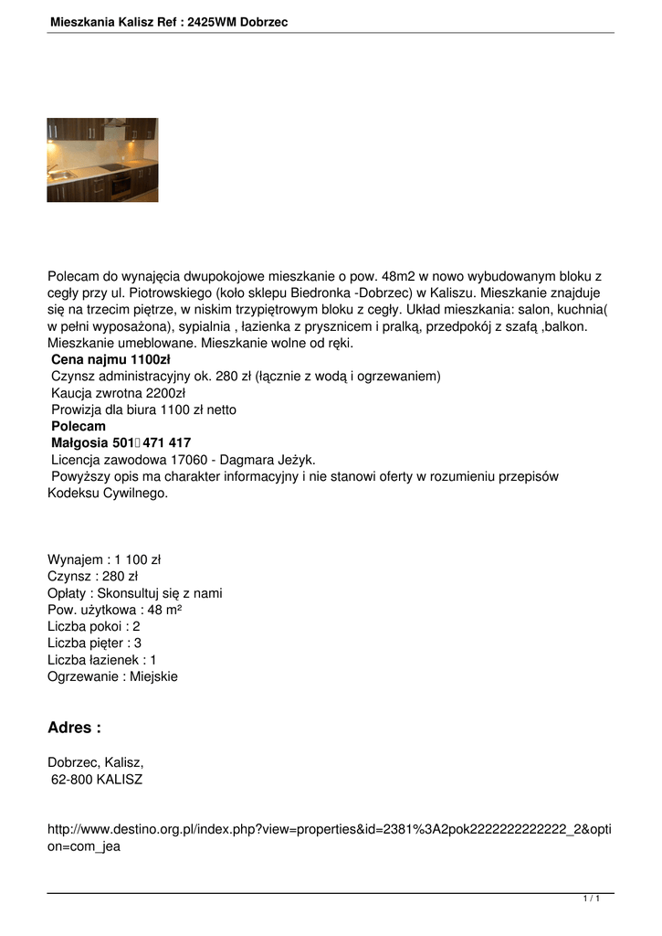 Mieszkania Kalisz Ref : 2425WM Dobrzec Polecam do wynajęcia dwupokojowe mieszkanie o pow. 48m2 w nowo wybudowanym bloku z cegły przy ul. Piotrowskiego (koło sklepu Biedronka -Dobrzec) w Kaliszu. Mieszkanie znajduje się na trzecim piętrze, w niskim trzypiętrowym bloku z cegły. Układ mieszkania: salon, kuchnia( w pełni wyposażona), sypialnia , łazienka z prysznicem i pralką, przedpokój z szafą ,balkon. Mieszkanie umeblowane. Mieszkanie wolne od ręki. Cena najmu 1100zł Czynsz administracyjny ok. 280 zł (łącznie z wodą i ogrzewaniem) Kaucja zwrotna 2200zł Prowizja dla biura 1100 zł netto Polecam Małgosia 501 471 417 Licencja zawodowa 17060 - Dagmara Jeżyk. Powyższy opis ma charakter informacyjny i nie stanowi oferty w rozumieniu przepisów Kodeksu Cywilnego. Wynajem : 1 100 zł Czynsz : 280 zł Opłaty : Skonsultuj się z nami Pow. użytkowa : 48 m² Liczba pokoi : 2 Liczba pięter : 3 Liczba łazienek : 1 Ogrzewanie : Miejskie Adres : Dobrzec, Kalisz, 62-800 KALISZ http://www.destino.org.pl/index.php?view=properties&id=2381%3A2pok2222222222222_2&opti on=com_jea 1/1