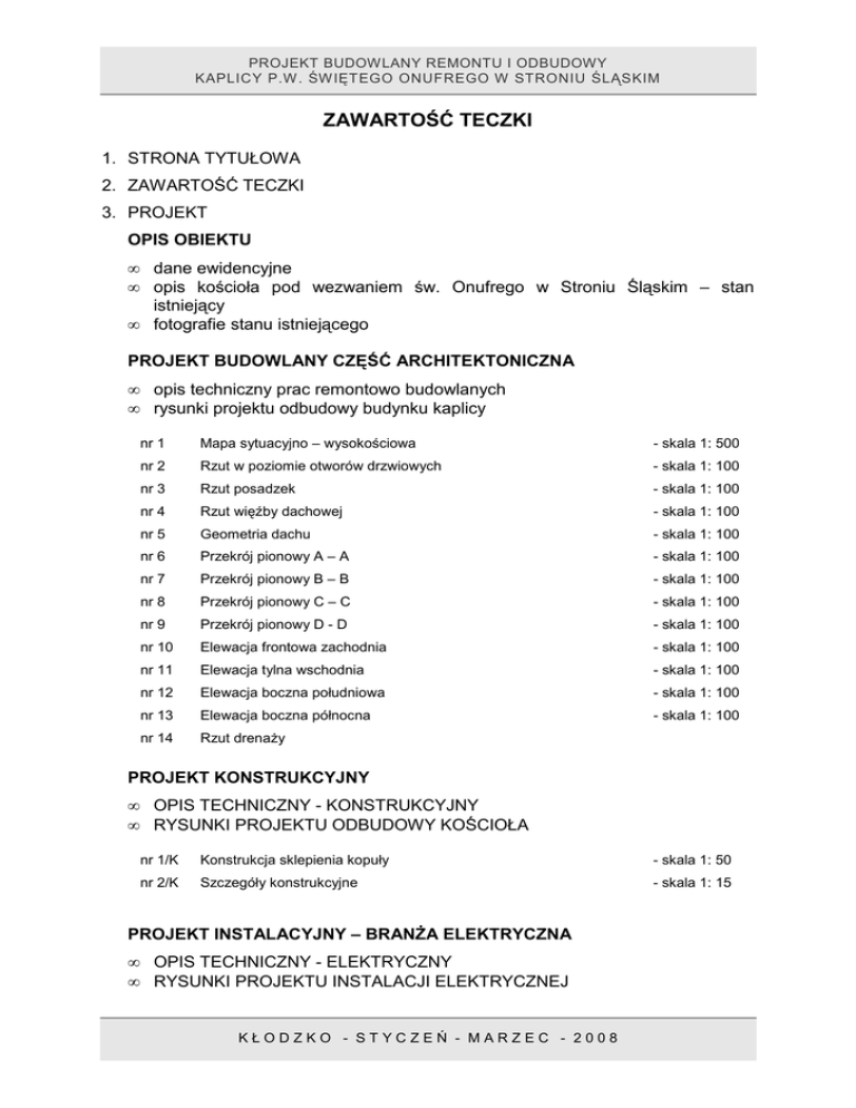 PROJEKT BUDOWLANY REMONTU I ODBUDOWY KAPLICY P.W . ŚW IĘTEGO ONUFREGO W STRONIU ŚLĄSKIM ZAWARTOŚĆ TECZKI 1. STRONA TYTUŁOWA 2. ZAWARTOŚĆ TECZKI 3. PROJEKT OPIS OBIEKTU • • • dane ewidencyjne opis kościoła pod wezwaniem św. Onufrego w Stroniu Śląskim – stan istniejący fotografie stanu istniejącego PROJEKT BUDOWLANY CZĘŚĆ ARCHITEKTONICZNA • • opis techniczny prac remontowo budowlanych rysunki projektu odbudowy budynku kaplicy nr 1 Mapa sytuacyjno – wysokościowa - skala 1: 500 nr 2 Rzut w poziomie otworów drzwiowych - skala 1: 100 nr 3 Rzut posadzek - skala 1: 100 nr 4 Rzut więźby dachowej - skala 1: 100 nr 5 Geometria dachu - skala 1: 100 nr 6 Przekrój pionowy A – A - skala 1: 100 nr 7 Przekrój pionowy B – B - skala 1: 100 nr 8 Przekrój pionowy C – C - skala 1: 100 nr 9 Przekrój pionowy D - D - skala 1: 100 nr 10 Elewacja frontowa zachodnia - skala 1: 100 nr 11 Elewacja tylna wschodnia - skala 1: 100 nr 12 Elewacja boczna południowa - skala 1: 100 nr 13 Elewacja boczna północna - skala 1: 100 nr 14 Rzut drenaŜy PROJEKT KONSTRUKCYJNY • • OPIS TECHNICZNY - KONSTRUKCYJNY RYSUNKI PROJEKTU ODBUDOWY KOŚCIOŁA nr 1/K Konstrukcja sklepienia kopuły - skala 1: 50 nr 2/K Szczegóły konstrukcyjne - skala 1: 15 PROJEKT INSTALACYJNY – BRANśA ELEKTRYCZNA • • OPIS TECHNICZNY - ELEKTRYCZNY RYSUNKI PROJEKTU INSTALACJI ELEKTRYCZNEJ KŁODZKO - STYCZEŃ - MARZEC - 2008 PROJEKT BUDOWLANY REMONTU I ODBUDOWY KAPLICY P.W . ŚW IĘTEGO ONUFREGO W STRONIU ŚLĄSKIM nr IE-01 Rzut przyziemia – instalacje elektryczne - skala 1: 500 nr IE-02 Rzut przyziemia – instalacje elektryczne - skala 1: 100 nr IE-02 Schemat rozdzielni RE KŁODZKO - STYCZEŃ - MARZEC - 2008 PROJEKT BUDOWLANY REMONTU I ODBUDOWY KAPLICY P.W . ŚW IĘTEGO ONUFREGO W STRONIU ŚLĄSKIM OPIS OBIEKTU 1. DANE EWIDENCYJNE 1.1 POŁOśENIE I USTALENIA MPZP Budynek kaplicy pod wezwaniem św. Onufrego, dla którego opracowano projekt odbudowy, kolorystykę elewacji oraz stolarkę znajduje się na działce nr 540, AM – 9, przy ul. Kościuszki nr 55 w Stroniu Śląskim i jest własnością Gminy Stronie Śląskie. Obiekt jest wpisany do rejestru zabytków decyzją nr 1980 z 22 grudnia 1971r.,. 1.2 FAZA: projekt budowlany odbudowy i kolorystyki elewacji 1.3 WIELKOŚCI: • • • powierzchnia zabudowy ( po istniejącym obrysie): 159,23 m2 powierzchnia uŜytkowa: 123,47 m2 kubatura: 1907,66 m3 KŁODZKO - STYCZEŃ - MARZEC - 2008 PROJEKT BUDOWLANY REMONTU I ODBUDOWY KAPLICY P.W . ŚW IĘTEGO ONUFREGO W STRONIU ŚLĄSKIM OPIS STANU TECHNICZNEGO OBIEKTU ZALECENIA PROJEKTOWE ŚCIANY Ściany zewnętrzne grubości 65 - 205 cm wykonane z kamienia i cegły pełnej na zaprawie wapiennej. Pod względem konstrukcyjnym ściany budynku, do wysokości gzymsu okapowego, są w dobrym stanie technicznym i mogą być wykorzystane do zamierzeń realizacyjnych objętych niniejszym opracowaniem. W wyŜszej partii budynku, powyŜej gzymsu okapowego, występują liczne ubytki materiału budulcowego z jakiego wykonano mury. Braki te powstały z powodu długotrwałego, intensywnego działania niszczących czynników atmosferycznych. Spowodowane to jest brakiem zadaszenia obiektu. Mury w tej części obiektu ze względu na stan techniczny nie nadają się dalszego ich wykorzystania – i groŜą katastrofą budowlaną. ZALECENIA PROJEKTOWE Istniejące uszkodzenia fragmentów murów w okolicach gzymsu okapowego stwarzają zagroŜenie dla zdrowia i Ŝycia osób przebywających w obrębie i naleŜy je jak najszybciej rozebrać, a obiekt odpowiednio zabezpieczyć: ogrodzić i oznakować. W takcie odbudowy budynku kaplicy mury naleŜy odbudować przywracając im pierwotny kształt oraz detale wystroju architektonicznego obiektu. INNE ELEMENTY MUROWE Budynek składający się z dwóch części: nawa główna i prezbiterium. Nawa Główna przykryta jest sklepieniem przykryte kopułą pełną wykonaną z cegły na zaprawie wapiennej. Sklepienie to pod wpływem zawalenia się drewnianej konstrukcji dachu przykrytej naturalnym łupkiem uległo niemal całkowitemu zniszczeniu. Pozostałe fragmentu kopuły dodatkowo zostały poddane niszczącemu działaniu czynników atmosferycznych. Pomieszczenie prezbiterium pierwotnie przedzielono sklepieniem ceglanym na Ŝaglach. Podobnie jak w nawie głównej sklepienie to zostało całkowicie zniszczone w uderzenia spadający drewnianych elementów konstrukcji dachu oraz działania zewnętrznych czynników atmosferycznych. ZALECENIA PROJEKTOWE Pozostałe elementy ceramiczne kopuły pełnej i stropu Ŝaglowego ze względu na obecny ich stan techniczny nie nadają się do dalszego wykorzystania. W trakcie odbudowy budynku kaplicy naleŜy pozostałości tych elementów całkowicie rozebrać i odtworzyć je od nowa z zachowaniem ich pierwotnego kształtu. Kopułę w nawie górnej naleŜy wykonać w oparciu o opracowaną w tym celu dokumentację projektową – część konstrukcyjna rys. 1/K oraz rys. 2/K. KŁODZKO - STYCZEŃ - MARZEC - 2008 PROJEKT BUDOWLANY REMONTU I ODBUDOWY KAPLICY P.W . ŚW IĘTEGO ONUFREGO W STRONIU ŚLĄSKIM TYNKI Na elewacjach kaplicy zachowały się znaczne fragmenty tynku. W trakcie opracowania Dokumentacji Projektowej przeprowadzono badania stanu technicznego tynku. W tym celu tynk do wysokości 400 cm na wszystkich elewacjach obstukiwano metalowym młotkiem. Podczas tego badania pojawiały się głuche odgłosy uderzeń świadczące o słabym powiązaniu muru z tynkiem. Obecny stan tynku pozwala jednoznacznie określić jego wystrój architektoniczny umoŜliwiając tym samym dokładnie odtworzenie pierwotnego wystroju elewacji. Tynk w okolicach gzymsu okapowego jest niemal całkowicie wypłukany przez wody opadowe, które oprócz tego przyczyniły się z zawilgocenia muru na którym pojawiły się takŜe zagrzybienie i pleść. Wewnątrz budynku kaplicy podobnie jak na elewacji pozostały liczne fragmenty wykończenia ścian, łącznie z detalami architektonicznymi wy