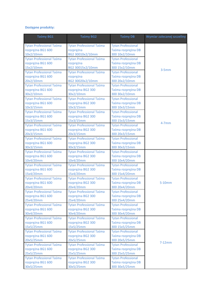 Dostępne produkty: Taśmy BG1 Tytan Professional Taśma rozprężna BG1 600 10x2/10mm Tytan Professional Taśma rozprężna BG1 600 15x2/10mm Tytan Professional Taśma rozprężna BG1 600 20x2/10mm Tytan Professional Taśma rozprężna BG1 600 30x2/10mm Tytan Professional Taśma rozprężna BG1 600 10x3/15mm Tytan Professional Taśma rozprężna BG1 600 15x3/15mm Tytan Professional Taśma rozprężna BG1 600 20x3/15mm Tytan Professional Taśma rozprężna BG1 600 30x3/15mm Tytan Professional Taśma rozprężna BG1 600 10x4/20mm Tytan Professional Taśma rozprężna BG1 600 15x4/20mm Tytan Professional Taśma rozprężna BG1 600 20x4/20mm Tytan Professional Taśma rozprężna BG1 600 25x4/20mm Tytan Professional Taśma rozprężna BG1 600 30x4/20mm Tytan Professional Taśma rozprężna BG1 600 15x5/25mm Tytan Professional Taśma rozprężna BG1 600 20x5/25mm Tytan Professional Taśma rozprężna BG1 600 25x5/25mm Tytan Professional Taśma rozprężna BG1 600 30x5/25mm Taśmy BG2 Tytan Professional Taśma rozprężna BG2 30010x2/10mm Tytan Professional Taśma rozprężna BG2 30015x2/10mm Tytan Professional Taśma rozprężna BG2 30020x2/10mm Tytan Professional Taśma rozprężna BG2 300 30x2/10mm Tytan Professional Taśma rozprężna BG2 300 10x3/15mm Tytan Professional Taśma rozprężna BG2 300 15x3/15mm Tytan Professional Taśma rozprężna BG2 300 20x3/15mm Tytan Professional Taśma rozprężna BG2 300 30x3/15mm Tytan Professional Taśma rozprężna BG2 300 10x4/20mm Tytan Professional Taśma rozprężna BG2 300 15x4/20mm Tytan Professional Taśma rozprężna BG2 300 20x4/20mm Tytan Professional Taśma rozprężna BG2 300 25x4/20mm Tytan Professional Taśma rozprężna BG2 300 30x4/20mm Tytan Professional Taśma rozprężna BG2 300 15x5/25mm Tytan Professional Taśma rozprężna BG2 300 20x5/25mm Tytan Professional Taśma rozprężna BG2 300 25x5/25mm Tytan Professional Taśma rozprężna BG2 300 30x5/25mm Taśmy DB Tytan Professional Taśma rozprężna DB 300 10x2/10mm Tytan Professional Taśma rozprężna DB 300 15x2/10mm Tytan Professional Taśma rozprężna DB 300 20x2/10mm Tytan Professional Taśma rozprężna DB 300 30x2/10mm Tytan Professional Taśma rozprężna DB 300 10x3/15mm Tytan Professional Taśma rozprężna DB 300 15x3/15mm Tytan Professional Taśma rozprężna DB 300 20x3/15mm Tytan Professional Taśma rozprężna DB 300 30x3/15mm Tytan Professional Taśma rozprężna DB 300 10x4/20mm Tytan Professional Taśma rozprężna DB 300 15x4/20mm Tytan Professional Taśma rozprężna DB 300 20x4/20mm Tytan Professional Taśma rozprężna DB 300 25x4/20mm Tytan Professional Taśma rozprężna DB 300 30x4/20mm Tytan Professional Taśma rozprężna DB 300 15x5/25mm Tytan Professional Taśma rozprężna DB 300 20x5/25mm Tytan Professional Taśma rozprężna DB 300 25x5/25mm Tytan Professional Taśma rozprężna DB 300 30x5/25mm Wymiar zalecanej szczeliny 3-5mm 4-7mm 5-10mm 7-12mm Tytan Professional Taśma rozprężna BG1 600 15x6/30mm Tytan Professional Taśma rozprężna BG1 600 20x6/30mm Tytan Professional Taśma rozprężna BG1 600 25x6/30mm Tytan Professional Taśma rozprężna BG1 600 30x6/30mm Tytan Professional Taśma rozprężna BG1 600 15x8/40mm Tytan Professional Taśma rozprężna BG1 600 20x8/40mm Tytan Professional Taśma rozprężna BG1 600 25x8/40mm Tytan Professional Taśma rozprężna BG1 600 30x8/40mm Tytan Professional Taśma rozprężna BG1 600 20x10/50mm Tytan Professional Taśma rozprężna BG1 600 25x10/50mm Tytan Professional Taśma rozprężna BG1 600 30x10/50mm Tytan Professional Taśma rozprężna BG1 600 20x12/60mm Tytan Professional Taśma rozprężna BG1 600 25x12/60mm Tytan Professional Taśma rozprężna BG1 600 30x12/60mm Tytan Professional Taśma rozprężna BG2 300 15x6/30mm Tytan Professional Taśma rozprężna BG2 300 20x6/30mm Tytan Professional Taśma rozprężna BG2 300 25x6/30mm Tytan Professional Taśma rozprężna BG2 300 30x6/30mm Tytan Professional Taśma rozprężna BG2 300 15x8/40mm Tytan Professional Taśma rozprężna BG2 300 20x8/40mm Tytan Professional Taśma rozprężna BG2 300 25x8/40mm Tytan Professional Taśma rozprężna BG2 300 30x8/40mm Tytan Professional Taśma rozprężna BG2 300 20x10/50mm Tytan Professional Taśma rozprężna BG2 300 25x10/50mm Tytan Professional Taśma rozprężna BG2 300 30x10/50mm Tytan Professional Taśma rozprężna BG2 300 20x12/60mm Tytan Professional Taśma rozprężna BG2 300 25x12/60mm Tytan Professional Taśma rozprężna BG2 300 30x12/60mm Tytan Professional Taśma rozprężna DB 300 15x6/30mm Tytan Professional Taśma rozprężna DB 300 20x6/30mm Tytan Professional Taśma rozprężna DB 300 25x6/30mm Tytan Professional Taśma rozprężna DB 300 30x6/30mm Tytan Professional Taśma rozprężna DB 300 15x8/40mm Tytan Professional Taśma rozprężna DB 300 20x8/40mm Tytan Professional Taśma rozprężna DB 300 25x8/40mm Tytan Professional Taśma rozprężna DB 300 30x8/40mm Tytan Professional Taśma rozprężna DB 300 20x10/50mm Tytan Professional Taśma rozprężna DB 300 25x10/50mm Tytan Professional Taśma rozprężna DB 300 30x10/50mm Tytan Professional Taśma rozprężna DB 300 20x12/60mm Tytan Professional Taśma rozprężna DB 300 25x12/60mm Tytan Professional Taśma rozprężna DB 300 30x12/60mm 8-15mm 10-20mm 12-25mm 15-30mm