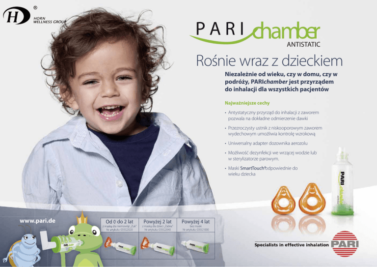 PARI chamber ANTISTATIC Rośnie wraz z dzieckiem Niezależnie od wieku, czy w domu, czy w podróży, PARIchamber jest przyrządem do inhalacji dla wszystkich pacjentów Najważniejsze cechy • Antystatyczny prz yrząd do inhalacji z zaworem pozwala na dokładne odmierzenie dawki • Przezrocz ysty ustnik z niskooporow ym zaworem wydechowym umożliwia kontrolę wzrokową • Uniwersalny adapter dozownika aerozolu • Możliwość dez ynfekcji we wrzącej wodzie lub w sterylizatorze parowym. • Maski SmartTouch®odpowiednie do wieku dziecka www.pari.de Od 0 do 2 lat z maską dla niemowląt „Żuk” Nr artykułu: 035G2020 Powyżej 2 lat z maską dla dzieci „Żabka” Nr artykułu: 035G2040 Powyżej 4 lat bez maski Nr artykułu: 035G1000 Jak używać komory inhalacyjnej P A R I Żabka Feliks pokaże to i objaśni żuczkowi Marysi. ANTISTATIC 1 2 Najpierw zdejmij zatyczkę z dozownika aerozolu. Następnie włóż dozownik do zielonego pierścienia łączącego komorę inhalacyjną PARIchamber. Marysiu, nie zapomnij wstrząsnąć dozownikiem przed użyciem. 3b chamber ? 3a Jeżeli używasz maski, przymocuj ją do ustnika. Umieść maskę na swojej twarzy i upewnij się, że zakrywa ona nos i usta. 4 5 Teraz Marysiu, możesz nacisnąć palcem dozownik jeden raz. Pamiętaj, aby wdychać powoli i głęboko. Jeżeli lekarz przepisał dwa lub więcej rozpyleń, musisz powtórzyć czynności opisane w punktach 3 i 4. Dezynfekcja: Suszenie: 3 5 Pamiętaj! Kiedy podrośniesz Marysiu, nie będziesz musiała używać maski — wystarczy sam ustnik. Wówczas ustnik komory inhalacyjnej PARIchambernależy włożyć między zęby i otoczyć go ustami. Po zakończeniu inhalacji należy pamiętać o wyczyszczeniu komory inhalacyjnej PARIchamber: 1 Zdjąć pierścień łączący oraz maskę, jeżeli była przymocowana. Komorę inhalacyjną PARIchamber wraz z maską można dezynfekować w sterylizatorze parowym. Czyszczenie: 2 Wyczyścić wszystkie części delikatnie, ale dokładnie w ciepłej wodzie z kranu z niewielką ilością płynu do mycia naczyń. Wypłukać wszystkie części dokładnie świeżą, czystą wodą. 4 Można również włożyć wszystkie części do wrzącej wody na co najmniej 5 min. Wszystkie części komory inhalacyjnej PARIchambermuszą być całkowicie zanurzone. 6 Dzieci do 18 miesiąca życia powinny wykonać podczas inhalacji od 4 do 6 cykli wdechów i wydechów, a dzieci starsze – od 2 do 4 cykli. Pozostawić komorę inhalacyjną PARIchamberdo wyschnięcia w temperaturze pokojowej lub osuszyć ją czystą ściereczką kuchenną. Komorę inhalacyjną PARIchambernależy przechowywać w bezpiecznym, suchym i wolnym od kurzu miejscu.