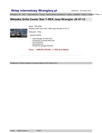 Sklep internetowy Wranglery.pl Utworzono : 08 marzec 2017 Wranglery JK - 2007 > Doposażenie i Tuning > doposażenie zewnętrzne > osłony i nakładki > osłony i nakładki T-Rex > W Wkładka Grilla Center Star T-REX Jeep Wrangler JK 07-13 Model : TRX-66481 Wkładka Grilla Center Star T-REX Jeep Wrangler JK 07-13 Producent : T-Rex �atrapa przednia, � Jeep Wrangler JK 2007-2013 � montowana na atrapę fabryczną � stal nierdzewna � jednoczęściowa � montaż nie wymaga wiercenia Cena : 1.999,00 zł Brutto ( 1.625,20 zł Netto) Dostępność: Produkt dostępny w naszym sklepie od 05 marzec 2013 kontakt : - [email protected] Strona 1