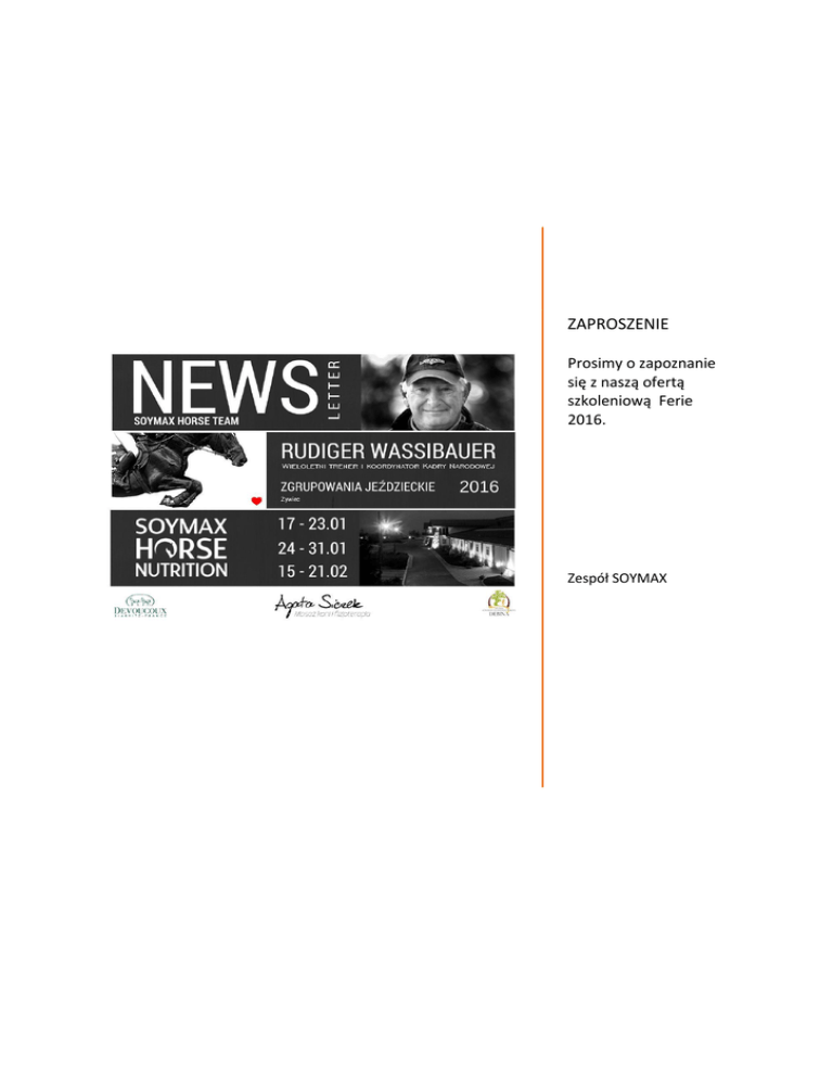 ZAPROSZENIE Prosimy o zapoznanie się z naszą ofertą szkoleniową Ferie 2016. Zespół SOYMAX Lublin 25Listopad2015 Szanowni Państwo Mam przyjemność przedstawić i zaprosić Państwa do udziału w szkoleniach z Panem Rudigerem Wassibaurem. Będąc pod ogromnym wrażeniem dotychczasowych dokonań Pana Wassibauera uznaliśmy, że wspólnie opracowany program szkoleniowy będzie najlepszą formą wsparcia w Państwa codziennej pracy z końmi. Naszym celem jest stworzenie jak najlepszych warunków służących doskonaleniu a także podniesieniu umiejętności i kwalifikacji jeździeckich. Firma Soymax Zajmuje się wytwarzaniem i dystrybucją pasz dla koni. Receptury preparatów naszej marki powstają przy współpracy z najlepszymi doradcami żywieniowymi oraz lekarzami weterynarii. Ogromne znaczenie przy ich opracowywaniu ma dla nas także opinia samych właścicieli koni i hodowców. SOYMAX® tworzy zespół doskonale wykwalifikowanych i profesjonalnych doradców żywieniowych, których zaangażowanie przekłada się na wyniki. Licząc na Państwa zainteresowanie produktem zapraszam do współpracy z naszą firmą. Z jeździeckimi pozdrowieniami Artur Olesiejuk Prezes SOYMAX NUTRITION Informacje dla uczestnika I. Ogólne • • • • • • zakwaterowanie i wyżywienie w Hotel Dębina*** - pokoje dwu i jednoosobowe, bezpłatne WiFi, spa 1,5 godziny wliczone w cenę pobytu, sześć noclegów. zajęcia jeździeckie i zakwaterowanie koni Stajnia Romico, do dyspozycji hala 30 x 60 z podłożem z piasku kwarcowego, siodlarnia, karuzela. codzienny trening w maksymalnie trzyosobowych zespołach videorejestracja i analiza treningów, sala multimedialna Hotel Dębina możliwość skorzystania z pobliskich wyciągów (opcja dodatkowo płatna) wieczór integracyjny przy ognisku II. Konsultacje • • • optymalne żywienie konia w różnych fazach treningu – wykład diagnostyka aparatu ruchu każdego konia przez doświadczoną fizjoterapeutkę oraz prelekcja na temat prawidłowego rozwoju mięśni u koni dopasowanie siodła - wpływ na narząd ruchu – pokaz i prelekcja III. Organizacyjne • • • • • • • koszt pobytu wraz z koniem wynosi 2500 zł istnieje możliwość wzięcia udziału w zgrupowaniu bez noclegów i wyżywienia w cenie 1950 zł wpłat należy dokonywać zgodnie z wypełnioną deklaracją uczestnicy są ubezpieczeni od następstw nieszczęśliwych wypadków organizator nie ponosi odpowiedzialności za zdarzenia losowe organizator zastrzega sobie prawo do odwołania turnusu w razie małej ilości uczestników pobyt rozpoczyna się obiadem w niedziele i kończy śniadaniem w sobotę Dane uczestnika: Imię:………………………………………………………… Nazwisko:…………………………………………………... Pesel:………………………………………………………... Dowód osobisty:……………………………………………. wydany przez:………………………………………………. Adres zameldowania:……………………………………….. Deklaruję moje uczestnictwo w Zgrupowaniu Jeździeckim Żywiec 2016 w terminie 17-23.01.2016 i zobowiązuję się do wpłaty zaliczki w wysokości 1200zł w terminie do 1.01.2016 pozostałą część tj. 1300 zł w terminie do 11.01.2016. Płatność zostanie dokonana na nr konta Soymax Sp. z o.o. 85 2490 0005 0000 4530 2463 2866 z dopiskiem zgrupowanie żywiec. Wyrażam zgodę na przetwarzanie moich danych osobowych zawartych w przedstawionych przeze mnie dokumentach dla potrzeb niezbędnych do realizacji zgrupowania – zgodnie z Ustawą z dnia 29 sierpnia 1997 r. o ochronie danych osobowych (Dz. U. z 2002 r. Nr 101, poz. 926 z późn. zm.) ……………………………………………. Data i Podpis