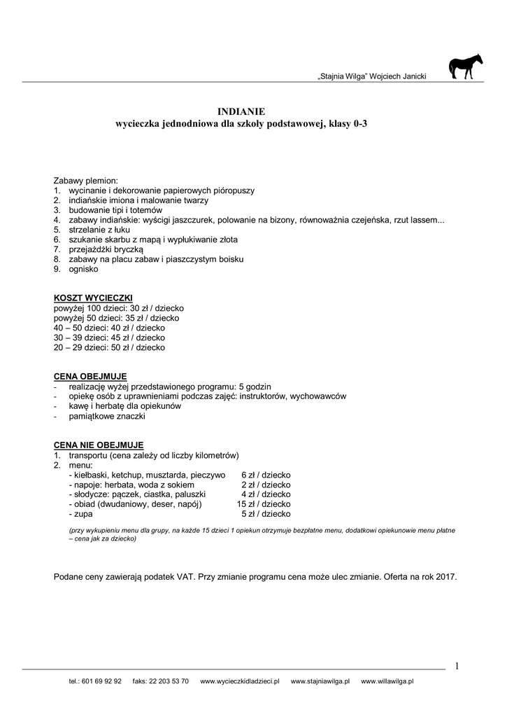 „Stajnia Wilga” Wojciech Janicki INDIANIE wycieczka jednodniowa dla szkoły podstawowej, klasy 0-3 Zabawy plemion: 1. wycinanie i dekorowanie papierowych pióropuszy 2. indiańskie imiona i malowanie twarzy 3. budowanie tipi i totemów 4. zabawy indiańskie: wyścigi jaszczurek, polowanie na bizony, równoważnia czejeńska, rzut lassem... 5. strzelanie z łuku 6. szukanie skarbu z mapą i wypłukiwanie złota 7. przejażdżki bryczką 8. zabawy na placu zabaw i piaszczystym boisku 9. ognisko KOSZT WYCIECZKI powyżej 100 dzieci: 30 zł / dziecko powyżej 50 dzieci: 35 zł / dziecko 40 – 50 dzieci: 40 zł / dziecko 30 – 39 dzieci: 45 zł / dziecko 20 – 29 dzieci: 50 zł / dziecko CENA OBEJMUJE - realizację wyżej przedstawionego programu: 5 godzin - opiekę osób z uprawnieniami podczas zajęć: instruktorów, wychowawców - kawę i herbatę dla opiekunów - pamiątkowe znaczki CENA NIE OBEJMUJE 1. transportu (cena zależy od liczby kilometrów) 2. menu: - kiełbaski, ketchup, musztarda, pieczywo 6 zł / dziecko - napoje: herbata, woda z sokiem 2 zł / dziecko - słodycze: pączek, ciastka, paluszki 4 zł / dziecko - obiad (dwudaniowy, deser, napój) 15 zł / dziecko - zupa 5 zł / dziecko (przy wykupieniu menu dla grupy, na każde 15 dzieci 1 opiekun otrzymuje bezpłatne menu, dodatkowi opiekunowie menu płatne – cena jak za dziecko) Podane ceny zawierają podatek VAT. Przy zmianie programu cena może ulec zmianie. Oferta na rok 2017. 1 tel.: 601 69 92 92 faks: 22 203 53 70 www.wycieczkidladzieci.pl www.stajniawilga.pl www.willawilga.pl