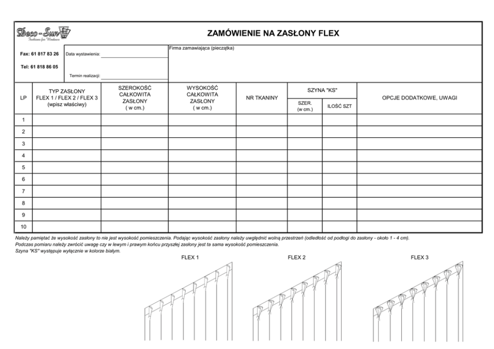 ZAMÓWIENIE NA ZASŁONY FLEX Firma zamawiająca (pieczątka) Fax: 61 817 83 26 Data wystawienia: Tel: 61 818 86 05 Termin realizacji: LP TYP ZASŁONY FLEX 1 / FLEX 2 / FLEX 3 (wpisz właściwy) SZEROKOŚĆ CAŁKOWITA ZASŁONY ( w cm.) WYSOKOŚĆ CAŁKOWITA ZASŁONY ( w cm.) SZYNA "KS" NR TKANINY OPCJE DODATKOWE, UWAGI SZER. (w cm.) ILOŚĆ SZT 1 2 3 4 5 6 7 8 9 10 Należy pamiętać że wysokość zasłony to nie jest wysokość pomieszczenia. Podając wysokość zasłony należy uwględnić wolną przestrzeń (odledłość od podłogi do zasłony - około 1 - 4 cm). Podczas pomiaru należy zwrócić uwagę czy w lewym i prawym końcu przyszłej zasłony jest ta sama wysokość pomieszczenia. Szyna "KS" występuje wyłącznie w kolorze białym. FLEX 1 FLEX 2 FLEX 3