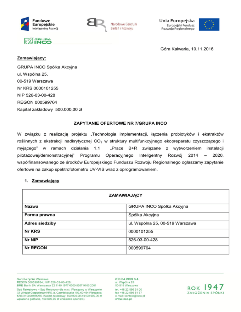 Góra Kalwaria, 10.11.2016 Zamawiający: GRUPA INCO Spółka Akcyjna ul. Wspólna 25, 00-519 Warszawa Nr KRS 0000101255 NIP 526-03-00-428 REGON 000599764 Kapitał zakładowy 500.000,00 zł ZAPYTANIE OFERTOWE NR 7/GRUPA INCO W związku z realizacją projektu „Technologia implementacji, łączenia probiotyków i ekstraktów roślinnych z ekstrakcji nadkrytycznej CO2 w struktury multifunkcyjnego ekopreparatu czyszczącego i myjącego” w ramach działania pilotażowej/demonstracyjnej” 1.1 Programu „Prace B+R Operacyjnego związane Inteligentny z wytworzeniem Rozwój 2014 instalacji – 2020, współfinansowanego ze środków Europejskiego Funduszu Rozwoju Regionalnego ogłaszamy zapytanie ofertowe na zakup spektrofotometru UV-VIS wraz z oprogramowaniem. 1. Zamawiający ZAMAWIAJĄCY Nazwa GRUPA INCO Spółka Akcyjna Forma prawna Spółka Akcyjna Adres siedziby ul. Wspólna 25, 00-519 Warszawa Nr KRS 0000101255 Nr NIP 526-03-00-428 Nr REGON 000599764 DANE TELEADRESOWE Zakład Produkcyjny w Górze Kalwarii Adres do korespondencji ul. Towarowa 8 05-530 Góra Kalwaria E-mail [email protected] FAX +48 22 711 59 00 Telefon +48 22 711 59 60 2. Zapytanie ofertowe Zapytanie ofertowe dostępne jest na stronie Publikacja zamówienia internetowej http://www.inco.pl/grupainco/inwestycje-w-ramach-ue oraz w siedzibie zamawiającego. Postępowanie zapytania realizowane Charakter prawny zapytania prowadzone ofertowego. jest konkurencyjności ustawy z dnia będzie Zapytanie zgodnie z 29 w trybie ofertowe z zasadami wyłączeniem przepisów stycznia 2004r. Prawo zamówień publicznych (Dz. U. nr 19, poz. 177 ze zm.) zgodnie z art. 3 powołanej ustawy. 3. Opis przedmiotu zamówienia 3.1. Przedmiot zamówienia – informacje podstawowe „Technologia implementacji, łączenia probiotyków i ekstraktów roślinnych z ekstrakcji nadkrytycznej CO2 w struktury multifunkcyjnego ekopreparatu Opis projektu czyszczącego i dofinansowanie Zamawiający ramach działania 1.1 myjącego”, o którego ubiega się w „Prace B+R związane z wytworzeniem instalacji pilotażowej/demonstracyjnej” Programu Operacyjnego Inteligentny Rozwój 2014 – 2020, współfinansowanego ze środków Europejskiego Funduszu Rozwoju Regionalnego. Zwięzłe określenie przedmiotu zamówienia Przedmiotem zamówienia spektrofotometru UV-VIS jest wraz zakup z oprogramowaniem. Wspólny słownik zamówień (Kod CPV Przedmiotu zamówienia) 38433000-9 3.2. Szczegółowy opis przedmiotu zamówienia Przedmiot Specyfikacja Spektrofotometru UV-VIS wraz z oprogramowaniem Przedmiotem zapytania ofertowego jest Spektrofotometr o parametrach: zakres spektralny 190 - 1100 nm, szerokość spektralna szczeliny nie gorsza niż 1,8 nm, rozdzielczość cyfrowa - co najmniej następujące ustawienia: 0.1 ; 0.2 ; 0.5 ; 1.0 ; 2.0 ; .3.0 ; 5.0 nm, układ optyczny jednowiązkowy z wiązką dwudzielną, układ optyczny pokryty kwarcem w celu zabezpieczenia przed korozją, źródło światła - lampa ksenonowa, dokładność długości fali nie gorsza niż ± 1,0 nm, powtarzalność długości fali nie gorsza niż ± 0,5 nm, dokładność absorbancji nie gorsza niż ± 0,005 Abs prz 1 A, zakres fotometryczny co najmniej od - 0,5 do 5,0 Abs, zdejmowanie widm z szybkością co najmniej w zakresie 10 - 4200 nm / min, przestrajanie długości fali z szybkością co najmniej 11000 nm / min, szum fotometryczny : < 0,00025 A przy 0A, RMS, 260 nm, < 0,0005 A przy 1 A, RMS, 260 nm, < 0,0008 A przy 2A, RMS, 260 nm, światło rozproszone: < 0,08%T przy 220 nm i 340 nm (NaI, NaNO2), < 1 % T przy 198 nm (KCl), autoryzowany serwis oraz dostęp do części zamiennych oraz przegladów technicznych na terenie polski, w trakcie gwarancji co najmniej 1 krotny przegląd techniczny urządzenia np. raz w roku, w cenie zakupu urządzenia, dokumentacja techniczno - ruchowa wraz z instrukcją obsługi w języku polskim, wraz z listą ewentualnych części zamiennych, w przypadku dwukrotnej awarii urządzenia, nie z winy użytkownika (ukryte wady techniczne urządzenia), w okresie gwarancji, wymiana urządzenia na nowe, gwarancja na urządzenie 12 miesiące, gwarancja na lampę ksenonową 36 miesięcy, świadectwo wewnętrznego sprawdzenia spektrofotometru wydane przez producenta urządzenia szkolenie personelu laboratorium w zakresie budowy i obsługi urządzenia, teoria i praktyka, dostawa urządzenia do siedziby zamawiającego możliwość tworzenia własnych metod i pracy na własnych odczynnikach, możliwość pracy na gotowych testach różnych producentów (Merck, Hach - Lange, Macherey - Nagel (Nanocolor), Orion AQUAfast), dostarczony z bazą ponad 250 gotowych testów różnych producentów, wyposażenie w trzy porty USB, umożliwiające podłączenie urządzenia do komputera zewnętrznego, drukarki zewnętrznej oraz zapisu danych na przenośnej pamięci zewnętrznej (pendrive), możliwość przeglądania wyników, widm i krzywych kalibracji bezpośrednio na ekranie urządzenia, możliwość wykonania testów sprawdzających zgodnie z wymaganiami GLP i GMP, wyposażenie w 1- pozycyjny (kuweta 10 mm), 3 - pozycyjny (kuweta 10 mm, 20 - 50 mm i fiolki o średnicy 13 - 24 mm ) i 6 pozycyjny (kuwety 10 mm) automatyczny zmieniacz próbek, możliwość zastosowania dodatkowych akcesoriów takich jak: system pompy perystaltycznej wraz z kuwetą przepływową, wyposażenie w ciekłokrystaliczny ekran pozwalający na wyświetlanie widm, krzywych kalibracji, wyników i metod o wymiarach około: 10 x 8 cm, wyposażenie w szczelną klawiaturę membranową odporną na zalanie, możliwość pracy w trybie absorbancji, transmitancji, intensywności, możliwość pomiaru widma, analizy ilościowej z krzywymi kalibracyjnymi, kinetyki oraz pomiarów w czasie, możliwość zastosowania oprogramowania komputerowego pracującego w środowisku Microsoft Windows umożliwiającego pomiar przy stałej długości fali w trybie Abs, %T, C, zdejmowania krzywych kalibracji , analizy stopnia dopasowania, wyznacz