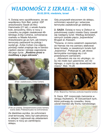 WIADOMOŚCI Z IZRAELA - NR 96 28.02.2016, niedziela, Izrael 1. Dzisiaj rano opublikowano, że we współpracy Szin Bet, policji i IDF aresztowano Saadi ali Abu Hammada (21 lat), z wioski Azaria koło Jerozolimy, który w nocy z czwartku na piątek zaatakował 48letniego Zvikę Cohena, ochraniarza marketu w Maale Adumim. Aresztowano go po tym, jak krewny terrorysty zadzwonił na policję i wydał go. Zvika Cohen (na zdjęciu poniżej) nadal znajduje się w bardzo ciężkim stanie i istnieje zagrożenie dla jego życia. „Rodzina prosi o modlitwę o jego zdrowie”. Gdy przyszedł wieczorem do sklepu, ochroniarz wpuścił go i wówczas terrorysta zaatakował go siekierą. 2. GAZA. Dzisiaj w nocy w Zeitoun w południowej części miasta Gazy zawalił się następny tunel. Według doniesień, rannych zostało pięciu „bojowników” Brygad al.-Kassam. *Dziwne, iż mimo ostatnich zapewnień, że Hamas nie ma zamiaru atakować teraz Izraela, w zawalonym tunelu byli „bojownicy”. Pokazuje to, jak słowa terrorystów rozmijają się z ich prawdziwymi zamiarami. „…Albowiem nie ma nic ukrytego, co by nie miało być ujawnione, ani nic tajnego, o czym by się dowiedzieć nie miano”. Mat. 10,26 (Foto: zaatakowany Zvika Cohen) (Foto: Bojownicy Hamasu podczas kopania tunelu) 3. Gaza. IDF rozpoczęły ćwiczenia w okręgu Aszkelonu. W ćwiczeniach tych, które potrwają do czwartku, biorą udział również siły frontu narodowego. (Foto po prawej: Zarejestrowana przez kamery scena ataku Palestyńczyka na ochroniarza) Ze śledztwa wynika, że ochroniarz znał terrorystę, który był zatrudniony w sklepie i zajmował się układaniem towaru w nocy po zamknięciu sklepu. 4. Po raz pierwszy od początku tej intifady od tygodnia nie zanotowano żadnych prób zamachów na szosie 443, która łączy Jerozolimę z Tel Awiwem. *Jaka wspaniała odpowiedź na modlitwy! (Foto: Generał Joaw (bibl. Joab) Mordechaj) (Foto: Na zdjęciu zaznaczyłem drogę 443, o której mowa („droga północna”). Jest ona równoległa do drogi nr 1 z Tel Awiwu do Jerozolimy, która wiedzie obok palestyńskich wiosek i miasteczek. Jednakże główną drogą komunikacyjną z Tel Awiwu do Jerozolimy jest droga nr 1, która jest wolna od wszelkich ataków, jak i większość kraju. Ataki są skupione dosłownie w kilku strategicznych miejscach, gdzie wojsko i służby bezpieczeństwa starają się kontrolować sytuację. 5. W ostatnich dniach słychać w „regionie” dużo szumu medialnego związanego z informacjami ze strony Hamasu, że są prowadzone ustalenia dotyczące budowy niezależnego, morskiego portu w Gazie. W związku z tym generał Joaw Mordechaj, koordynator działań rządowych w Judei i Samarii, wydał oświadczenie, że nie ma żadnych rozmów z Turcją (jako pośrednikiem) na temat budowy portu morskiego w Gazie i jeśli kiedykolwiek takie będą, to będą się odbywać tylko i wyłącznie z Autonomią Palestyńską. Oświadczenie to zostało wydane na prośbę Egiptu, który stanowczo sprzeciwia się powstaniu takiego portu dopóki Hamas rządzi w Gazie. Egipt jest w kontakcie z Autonomią Palestyńską, która również sprzeciwia się temu portowi, jak i każdej innej alternatywie w tej sprawie. *Jako ciekawostkę podam, że Egipt jest od zawsze mocno zaangażowany w sprawy Strefy Gazy ze względu m.in. na pochodzenie mieszkańców Strefy, którzy w większości są egipskimi Arabami i nie mają nic wspólnego ze starożytnymi Filistynami. 6. 20-tu członków Knesetu z partii Likud, Ha-Bajit Ha-Jehudi, „Izrael nasz dom”, Jahadut Ha-Tora i Kulan wystosowało list protestacyjny przeciwko nielegalnej budowie prowadzonej przez Unię Europejską na terenach Judei i Samarii, które znajdują się pod pełną kontrolą Izraela. W liście tym napisali: „Żaden rząd na świecie nie ma prawa budować nielegalnie na terenie innego suwerennego państwa. Jeżeli UE chce być uczciwym pośrednikiem w konflikcie w naszym regionie, nie może brać udziału w jednostronnych próbach określenia granic bez negocjacji”. *Ma to związek z wieloma przypadkami stawiania przez UE bez zezwolenia budynków dla Palestyńczyków na terenie Izraela. Polska – Izrael, Spotkania – Konferencje – Służby Pascha w Krakowie, 19 marca 2016, godz. 19.30 Unikalna okazja poznania znaczenia „święta Pana” – Paschy Z udziałem rabina Joshui Brumbacha Organizatorem jest zaprzyjaźniona Fundacja „Polania” z Krakowa. Polecamy i zapraszamy! Wiadomości oraz zdjęcia zebrał Jarosław Papiór Korekta oraz opracowanie graficzne Stowarzyszenie Służba Szalom w Oświęcimiu