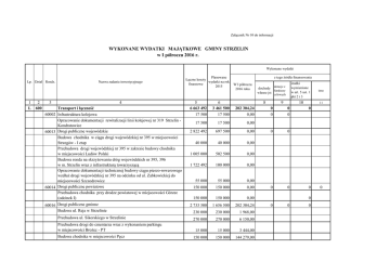 Załącznik Nr 10 do informacji WYKONANE WYDATKI MAJĄTKOWE GMINY STRZELIN w I półroczu 2016 r. Wykonane wydatki Lp. Dział Rozdz. 1 I. 2 600 Nazwa zadania inwestycyjnego 3 Planowane Łączne koszty wydatki na rok finansowe 2015 z tego źródła finansowania W I półroczu 2016 roku 4 Transport i łączność 60002 Infrastruktura kolejowa Opracowanie dokumentacji rewitalizacji linii kolejowej nr 319 Strzelin Kondratowice 60013 Drogi publiczne wojewódzkie Budowa chodnika w ciągu drogi wojewódzkiej nr 395 w miejscowości Strzegów - I etap Przebudowa drogi wojewódzkiej nr 395 w zakresie budowy chodnika w miejscowości Ludów Polski Budowa ronda na skrzyżowaniu dróg wojewódzkich nr 395, 396 w m. Strzelin wraz z infrastrukturą towarzyszącą Opracowanie dokumentacji technicznej budowy ciągu pieszo-rowerowego wzdłuż drogi wojewódzkiej nr 395 na odcinku od ul. Zabkowickiej do miejscowości Szczodrowice 60014 Drogi publiczne powiatowe Przebudowa chodnika przy drodze powiatowej w miejscowości Górzec (odcinek I) 5 6 663 492 17 500 6 3 461 500 17 500 202 304,24 0,00 17 500 17 500 0,00 2 822 492 697 500 0,00 40 000 40 000 0,00 1 005 000 502 500 0,00 1 722 492 100 000 0,00 55 000 55 000 0,00 150 000 150 000 0,00 150 000 150 000 0,00 60016 Drogi publiczne gminne Budowa ul. Reja w Strzelinie 2 733 500 1 656 500 202 304,24 230 000 230 000 1 968,00 270 000 270 000 6 150,00 15 000 15 000 3 444,00 150 000 150 000 144 279,00 Przebudowa ul. Sikorskiego w Strzelinie Przebudowa drogi do cmentarza wraz z wykonaniem parkingu w miejscowości Brożec - PT Budowa chodnika w miejscowości Pęcz środki wymienione w art. 5 ust. 1 pkt 2 i 3 u.f.p. 10 dotacje z dochody funduszy własne jst celowych 8 9 0 0 0 0 0 0 0 0 0 11 0 0 0 0 inne 0 0 Uzbrojenie terenu przy" WSSE Invest Park podstrefa Strzelin" wraz z przebudową ciagów komunikacyjnych - etap I Budowa chodnika ul. Słowackiego i ul. Ogrodowej w Strzelinie ( do ul. Sienkiewicza) 200 000 200 000 4 305,00 240 000 240 000 6 765,00 100 000 100 000 0,00 Przebudowa ul. Gen.Grota-Roweckiego w Strzelinie I etap 1 100 000 100 000 0,00 Odbudowa chodnika przy ul. Brzegowej w Strzelinie etap I 70 000 70 000 0,00 Budowa drogi gminnej - ul. Turkusowej w Szczawinie - PT (f.s.) 36 000 36 000 0,00 Utwardzenie drogi gminnej w miejscowości Gościęcice (f.s.) 11 000 11 000 0,00 5 000 5 000 0,00 30 000 30 000 0,00 3 500 3 500 0,00 11 000 11 000 0,00 100 000 100 000 35 393,24 Remonty dróg śródpolnych 50 000 50 000 0,00 Wykonanie i montaż nowych wiat przystankowych 15 000 15 000 0,00 Budowa ul. Broniewskiego i ul. Berlinga w Strzelinie - PT 37 000 10 000 0,00 60 000 940 000 10 000 940 000 0,00 0,00 Górzec - droga dojazdowa do gruntów rolnych 140 000 140 000 0,00 Kuropatnik - droga dojazdowa do gruntów rolnych 800 000 800 000 0,00 50 000 50 000 50 000 Remont ul. Wichrowej w Strzelinie Utwardzenie drogi śródpolnej w Karszowie (f.s.) Utwardzenie ul. Wiosennej w Gęsińcu Odwodnienie parkingu przy bloku mieszkalnym nr 42 w Mikoszowie Ułożenie krawężników wzdłuż drogi gminnej w miejscowości Muchowiec - etap I (f.s.) Budowa, przebudowa i modernizacja dróg gminnych Przebudowa ul. Zamkowej w Strzelinuie - PT 60017 Drogi wewnętrzne II. 630 Turystyka 63095 Pozostała działalność Budowa krytej pływalni w Strzelinie III. 700 Gospodarka mieszkaniowa 70005 Gospodarka gruntami i nieruchomościami Rozbudowa istniejących systemów sieci wod-kan. na terenie miasta i gminy Strzelin Wykup nieruchomości na powiększenie mienia gminy Wykupy działek pod drogi, zgodnie z mpzp 0 0 50 000,00 0 0 0 50 000 50 000,00 0 0 0 50 000 413 000 413 000 50 000 338 000 338 000 50 000,00 144 790,90 144 790,90 0 0 0 0 50 000 50 000 125 000 125 000 0,00 23 800 23 800 15 422,90 126 200 126 200 126 170,00 50 000 UMiG Rozbudowa targowiska miejskiego w Strzelinie - PT Adaptacja budynku przy ul. Pocztowej 3 na cele mieszkaniowe - PT" Działalność usługowa IV. 710 71004 Plany zagospodarowania przestrzennego V. 750 VI. 754 50 000 88 000 50 000 13 000 3 198,00 0,00 110 000 110 000 110 000 110 000 24 940,68 24 940,68 Sporządzanie miejscowych planów zagospodarowania przestrzennego 110 000 110 000 24 940,68 Administracja publiczna 75023 Urzędy gmin Remont pomieszczeń piwnicznych budynku UMIG w Strzelinie wraz z wykonaniem odwodnienia budynku - etap I 70 000 70 000 70 000 70 000 18 523,78 18 523,78 30 000 30 000 0,00 Zakupy inwestycyjne (licencje do programów, sprzęt ) Bezpieczeństwo publiczne i ochrona przeciwpożarowa 40 000 40 000 18 523,78 236 800 236 800 118 789,50 75404 Komendy wojewódzkie policji Dofinansowanie zakupu radiowozu dla Komendy Powiatowej Policji w Strzelinie 23 200 23 200 22 500,00 23 200 23 200 22 500,00 75411 Komendy powiatowe Państwowej Straży Pożarnej 86 800 86 800 79 500,00 Zakup samochodu operacyjnego dla PSP w Strzelinie 0 0 0 0 UMiG 0 0 0 0 0 0 UMiG 0 0 0 UMiG 0 0 0 0 0 0 86 800 86 800 79 500,00 75412 Ochotnicze Straże Pożarne Zagospodarowanie terenu wokół remizy OSP w Kuropatniku (f.s.) 10 000 10 000 0,00 10 000 10 000 0,00 75414 Obrona cywilna Zakup i montaż syreny elektrycznej tubowej w systemie ostrzegania i alarmowania ludności 16 800 16 800 16 789,50 16 800 16 800 16 789,50 100 000 100 000 0,00 Modernizacja istniejącego systemu monitoringu 100 000 100 000 0,00 Oświata i wychowanie 203 500 203 500 38 076,00 0 0 0 127 500 127 500 4 551,00 0 0 0 55 000 55 000 2 091,00 12 500 12 500 2 460,00 40 000 40 000 0,00 75495 Pozostała działalność VII. 801 0 0 80101 Szkoły Podstawowe Wykonanie dokumentacji technicznej zabezpieczeń pęknięć oraz rozbudowy Szkoły Podstawowej Nr 4 w Strzelinie Wymiana pokrycia dachowego daszku nad łącznikiem szkoły z salą gimnastyczną oraz przebudowa kanalizacji sanitarnej w Szkole Podstawowej Nr 4 w Strzelinie Wykonanie wejścia do Szkoły Podstawowej nr 5 w Strzelinie (łącznik sala sportowa-kompleks boisk) oraz wymiana stolarki zewnętrznej drzwiowej - 6 szt. UMiG Budowa boiska sportowego oraz placu zabaw