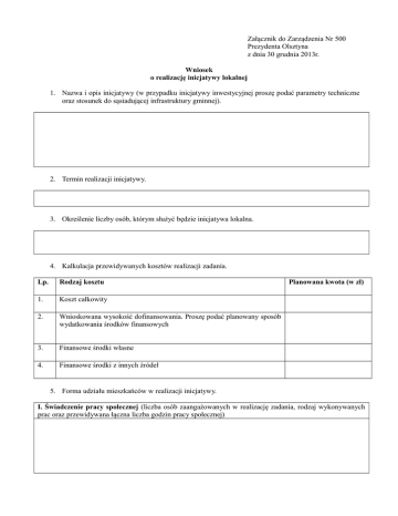Załącznik do Zarządzenia Nr 500 Prezydenta Olsztyna z dnia 30 grudnia 2013r. Wniosek o realizację inicjatywy lokalnej 1. Nazwa i opis inicjatywy (w przypadku inicjatywy inwestycyjnej proszę podać parametry techniczne oraz stosunek do sąsiadującej infrastruktury gminnej). 2. Termin realizacji inicjatywy. 3. Określenie liczby osób, którym służyć będzie inicjatywa lokalna. 4. Kalkulacja przewidywanych kosztów realizacji zadania. Lp. Rodzaj kosztu 1. Koszt całkowity 2. Wnioskowana wysokość dofinansowania. Proszę podać planowany sposób wydatkowania środków finansowych 3. Finansowe środki własne 4. Finansowe środki z innych źródeł Planowana kwota (w zł) 5. Forma udziału mieszkańców w realizacji inicjatywy. I. Świadczenie pracy społecznej (liczba osób zaangażowanych w realizację zadania, rodzaj wykonywanych prac oraz przewidywana łączna liczba godzin pracy społecznej) II. Świadczenie rzeczowe (w tym koncepcja określająca szczegółowy zakres rzeczowy i szacunkowy koszt zadania lub dokumentacja projektowa z kosztorysem inwestorskim oraz przygotowanym wnioskiem o pozwolenie na budowę lub zgłoszeniem zamiaru budowy) III. Świadczenie pieniężne (wysokość zgromadzonych środków finansowych) 6. Osoby uprawnione do reprezentowania grupy inicjatywnej. Lp. Imię i nazwisko Adres i telefon kontaktowy Podpis 7. Informacja o grupie inicjatywnej (lista osób popierających wniosek). Lp. Imię i nazwisko (w przypadku organizacji pozarządowej nazwa organizacji) PESEL (w przypadku organizacji nr KRS lub inny nr rejestru) Adres Podpis (w przypadku organizacji podpis osoby upoważnionej do reprezentacji)