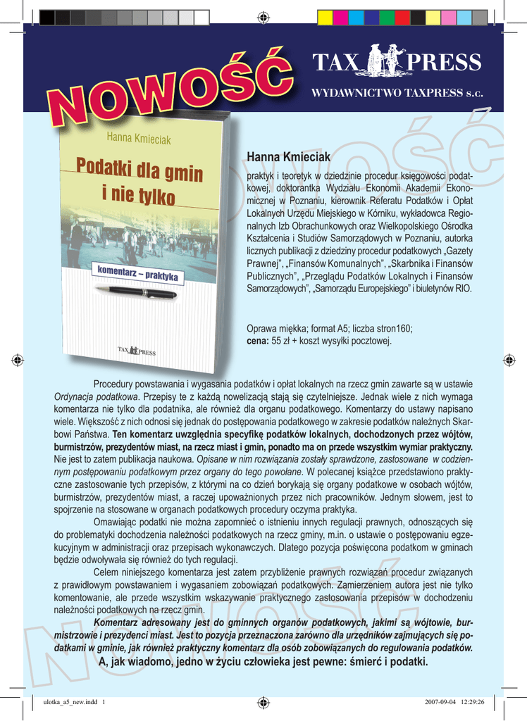 Hanna Kmieciak praktyk i teoretyk w dziedzinie procedur księgowości podatkowej, doktorantka Wydziału Ekonomii Akademii Ekonomicznej w Poznaniu, kierownik Referatu Podatków i Opłat Lokalnych Urzędu Miejskiego w Kórniku, wykładowca Regionalnych Izb Obrachunkowych oraz Wielkopolskiego Ośrodka Kształcenia i Studiów Samorządowych w Poznaniu, autorka licznych publikacji z dziedziny procedur podatkowych „Gazety Prawnej”, „Finansów Komunalnych”, „Skarbnika i Finansów Publicznych”, „Przeglądu Podatków Lokalnych i Finansów Samorządowych”, „Samorządu Europejskiego” i biuletynów RIO. Oprawa miękka; format A5; liczba stron160; cena: 55 zł + koszt wysyłki pocztowej. Procedury powstawania i wygasania podatków i opłat lokalnych na rzecz gmin zawarte są w ustawie Ordynacja podatkowa. Przepisy te z każdą nowelizacją stają się czytelniejsze. Jednak wiele z nich wymaga komentarza nie tylko dla podatnika, ale również dla organu podatkowego. Komentarzy do ustawy napisano wiele. Większość z nich odnosi się jednak do postępowania podatkowego w zakresie podatków należnych Skarbowi Państwa. Ten komentarz uwzględnia specyfikę podatków lokalnych, dochodzonych przez wójtów, burmistrzów, prezydentów miast, na rzecz miast i gmin, ponadto ma on przede wszystkim wymiar praktyczny. Nie jest to zatem publikacja naukowa. Opisane w nim rozwiązania zostały sprawdzone, zastosowane w codziennym postępowaniu podatkowym przez organy do tego powołane. W polecanej książce przedstawiono praktyczne zastosowanie tych przepisów, z którymi na co dzień borykają się organy podatkowe w osobach wójtów, burmistrzów, prezydentów miast, a raczej upoważnionych przez nich pracowników. Jednym słowem, jest to spojrzenie na stosowane w organach podatkowych procedury oczyma praktyka. Omawiając podatki nie można zapomnieć o istnieniu innych regulacji prawnych, odnoszących się do problematyki dochodzenia należności podatkowych na rzecz gminy, m.in. o ustawie o postępowaniu egzekucyjnym w administracji oraz przepisach wykonawczych. Dlatego pozycja poświęcona podatkom w gminach będzie odwoływała się również do tych regulacji. Celem niniejszego komentarza jest zatem przybliżenie prawnych rozwiązań procedur związanych z prawidłowym powstawaniem i wygasaniem zobowiązań podatkowych. Zamierzeniem autora jest nie tylko komentowanie, ale przede wszystkim wskazywanie praktycznego zastosowania przepisów w dochodzeniu należności podatkowych na rzecz gmin. Komentarz adresowany jest do gminnych organów podatkowych, jakimi są wójtowie, burmistrzowie i prezydenci miast. Jest to pozycja przeznaczona zarówno dla urzędników zajmujących się podatkami w gminie, jak również praktyczny komentarz dla osób zobowiązanych do regulowania podatków. A, jak wiadomo, jedno w życiu człowieka jest pewne: śmierć i podatki. ulotka_a5_new.indd 1 2007-09-04 12:29:26 „Podatki dla gmin i nie tylko - komentarz - praktyka” 55 zł * * dla prenumeratorów „Przeglądu Podatków Lokalnych i Finansów Samorządowych” 10% rabatu. ulotka_a5_new.indd 2 2007-09-04 12:29:27