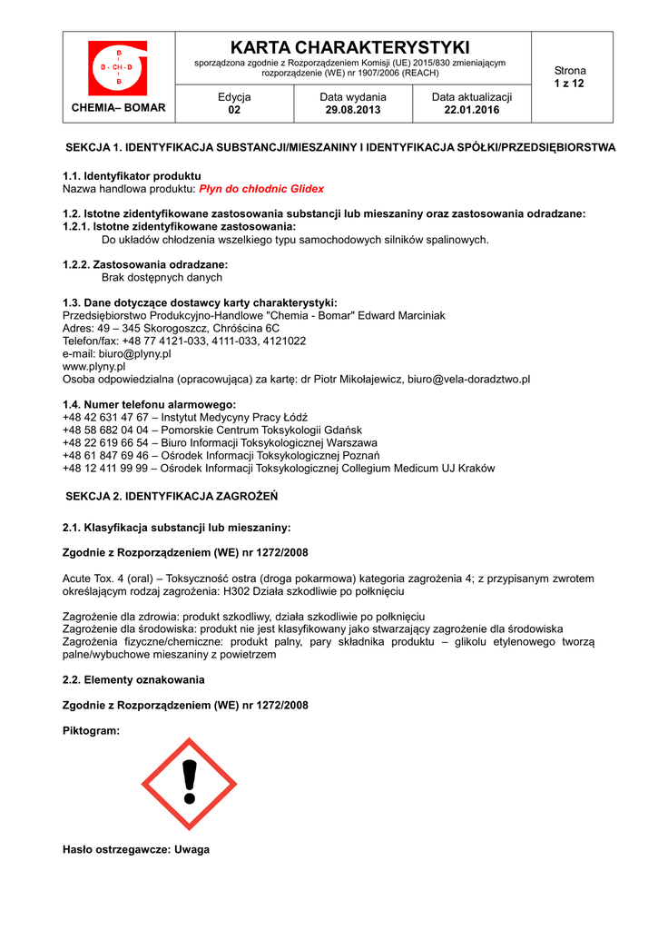 KARTA CHARAKTERYSTYKI sporządzona zgodnie z Rozporządzeniem Komisji (Uź) 2015/830 zmieniającym rozporządzenie (Wź) nr 1907/2006 (REACH) CHEMIA– BOMAR Edycja 02 Data wydania 29.08.2013 Strona 1 z 12 Data aktualizacji 22.01.2016 SźKCJA ń. IDźNTYŻIKACJA SUBSTANCJI/MIźSZANINY I IDźNTYŻIKACJA SPÓŁKI/PRZźDSI BIORSTWA 1.1. Identyfikator produktu Nazwa handlowa produktu: Płyn do chłodnic Glidex 1.2. Istotne zidentyfikowane zastosowania substancji lub mieszaniny oraz zastosowania odradzane: 1.2.1. Istotne zidentyfikowane zastosowania: Do układów chłodzenia wszelkiego typu samochodowych silników spalinowych. 1.2.2. Zastosowania odradzane: Brak dost pnych danych ń.3. Dane dotycz ce dostawcy karty charakterystykiŚ Przedsi biorstwo Produkcyjno-Handlowe "Chemia - Bomar" Edward Marciniak Adres: 49 – 345 Skorogoszcz, Chró cina 6C Telefon/fax: +48 77 4121-033, 4111-033, 4121022 e-mail: [email protected] www.plyny.pl Osoba odpowiedzialna (opracowująca) za kart Ś dr Piotr Mikołajewicz, [email protected] 1.4. Numer telefonu alarmowego: +48 42 631 47 67 – Instytut Medycyny Pracy Łód +48 58 682 04 04 – Pomorskie Centrum Toksykologii Gdańsk +48 22 619 66 54 – Biuro Informacji Toksykologicznej Warszawa +48 61 847 69 46 – O rodek Informacji Toksykologicznej Poznań +48 12 411 99 99 – O rodek Informacji Toksykologicznej Collegium Medicum UJ Kraków SźKCJA 2. IDźNTYŻIKACJA ZAżRO ź 2.1. Klasyfikacja substancji lub mieszaniny: Zgodnie z Rozporz dzeniem (Wź) nr ń272/2ŃŃ8 Acute Tox. 4 (oral) – Toksyczno ć ostra (droga pokarmowa) kategoria zagrożenia 4ś z przypisanym zwrotem okre lającym rodzaj zagrożeniaŚ H302 Działa szkodliwie po połkni ciu Zagrożenie dla zdrowiaŚ produkt szkodliwy, działa szkodliwie po połkni ciu Zagrożenie dla rodowiskaŚ produkt nie jest klasyfikowany jako stwarzający zagrożenie dla rodowiska Zagrożenia fizyczne/chemiczneŚ produkt palny, pary składnika produktu – glikolu etylenowego tworzą palne/wybuchowe mieszaniny z powietrzem 2.2. Elementy oznakowania Zgodnie z Rozporz dzeniem (Wź) nr ń272/2ŃŃ8 Piktogram: Hasło ostrzegawczeŚ Uwaga KARTA CHARAKTERYSTYKI sporządzona zgodnie z Rozporządzeniem Komisji (Uź) 2015/830 zmieniającym rozporządzenie (Wź) nr 1907/2006 (REACH) CHEMIA– BOMAR Edycja 02 Data wydania 29.08.2013 Strona 2 z 12 Data aktualizacji 22.01.2016 Zwroty okre laj ce rodzaj zagro enia H302 Działa szkodliwie po połkni ciu Zwroty okre laj ce rodki ostro no ci Ogólne: P101 W razie konieczno ci zasi gni cia porady lekarza, należy pokazać pojemnik lub etykiet P102 Chronić przed dziećmi Zapobieganie: P264 Dokładnie umyć r ce i twarz po użyciu P270 Nie je ć, nie pić i nie palić podczas używania produktu Reagowanie: P301 + P312 W PRZYPADKU POŁKNI CIAŚ w przypadku złego samopoczucia skontaktować si z O RODKIEM ZATRUĆ/lekarzem P330 Wypłukać usta Usuwanie: P501 Zawarto ć/pojemnik usuwać do firm posiadających odpowiednie uprawnienia, zgodnie krajowymi/mi dzynarodowymi przepisami z Składniki stwarzaj ce zagro enie: glikol etylenowy 2.3. Inne zagro eniaŚ Produkt nie spełnia kryteriów PBT lub vPvB zgodnie z załącznikiem XIII rozporządzenia RźACH. SźKCJA 3. SKŁAD/INŻORMACJA O SKŁADNIKACH 3.1. Substancje Nie dotyczy 3.2. Mieszaniny Produkt jest mieszaniną. SkładŚ woda, glikol etylenowy, sól sodowa kwasu dwuetyloheksanowego, składniki nie stwarzające zagrożenia, bąd o zawarto ci poniżej progu klasyfikacyjnego (barwnik, substancje pomocnicze) Klasyfikacj substancji stwarzających zagrożenie zawartych w produkcie podano zgodnie z tabelą 3.1 załącznika VI do Rozporządzenia Parlamentu źuropejskiego i Rady (Wź) nr 1272/2008 z uwzgl dnieniem jego aktualizacji, danymi REACH, na podstawie danych dostarczonych przez producenta oraz danych literaturowych. Nr CAS Nr WE Nr indeksowy REACH numer rejestracyjny Nazwa chemiczna 107-21-1 203-473-3 603-027-00-1 01-211945681628-xxxx glikol etylenowy* 40 – 60 % wag. Acute Tox. 4 (oral) H302 19766-89-3 243-283-8 nie nadany 01-211997908331-xxxx sodium 2ethylhexanoate 1–<3% wag. Repr. 2 H361 Zawarto ć Kategorie zagrożenia Zwroty H * - substancja, dla której okre lono wspólnotowe najwyższe dopuszczalne st żenia w rodowisku pracy Znaczenie kategorii zagrożenia oraz zwrotów H patrz sekcja 16. KARTA CHARAKTERYSTYKI sporządzona zgodnie z Rozporządzeniem Komisji (Uź) 2015/830 zmieniającym rozporządzenie (Wź) nr 1907/2006 (REACH) CHEMIA– BOMAR Edycja 02 Data wydania 29.08.2013 Strona 3 z 12 Data aktualizacji 22.01.2016 SźKCJA 4. RODKI PIźRWSZźJ POMOCY 4.ń. Opis rodków pierwszej pomocy Zalecenia ogólne: W przypadku kontaktu z produktem wywołującym niedyspozycj natychmiast wezwać zawodową służb zdrowia. Pokazać lekarzowi oznakowanie z karty charakterystyki produktu. Poinformować lekarza o udzielonej pierwszej pomocy poszkodowanemu. Nie podawać niczego doustnie osobie nieprzytomnej. Ochrona osób udzielaj cych pierwszej pomocyŚ Nie należy podejmować żadnych działań, które stwarzałyby ryzyko dla ratownika chyba, że jest si odpowiednio przeszkolonym. Zalecane jest stosowanie rodków ochrony osobistej (patrz sekcja 8). Ska enie skóryŚ Zdjąć zanieczyszczoną odzież. Skażoną skór umyć dokładnie wodą. W przypadku wystąpienia utrzymujących si podrażnień, innych niepokojących objawów skonsultować si z lekarzem Ska enie oczu: Przemywać odpowiednim płynem do przemywania oczu lub czystą wodą, utrzymując powieki otwarte, przez co najmniej 15 minut. Usunąć soczewki kontaktowe, jeżeli poszkodowany je nosi. Jeżeli wystąpią objawy podrażnienia skontaktować si z okulistą. Nara enie inhalacyjne: Usunąć poszkodowanego z miejsca narażenia na wieże powietrze, co w wi kszo ci przypadków powinno być wystarczające. Zapewnić ciepło i spokój. Przytomnego ułożyć w pozycji półsiedzącej, zapewnić spokój i ciepłoś nieprzytomnego ułożyć w pozycji bocznej ustalonej, kontrolować i ut