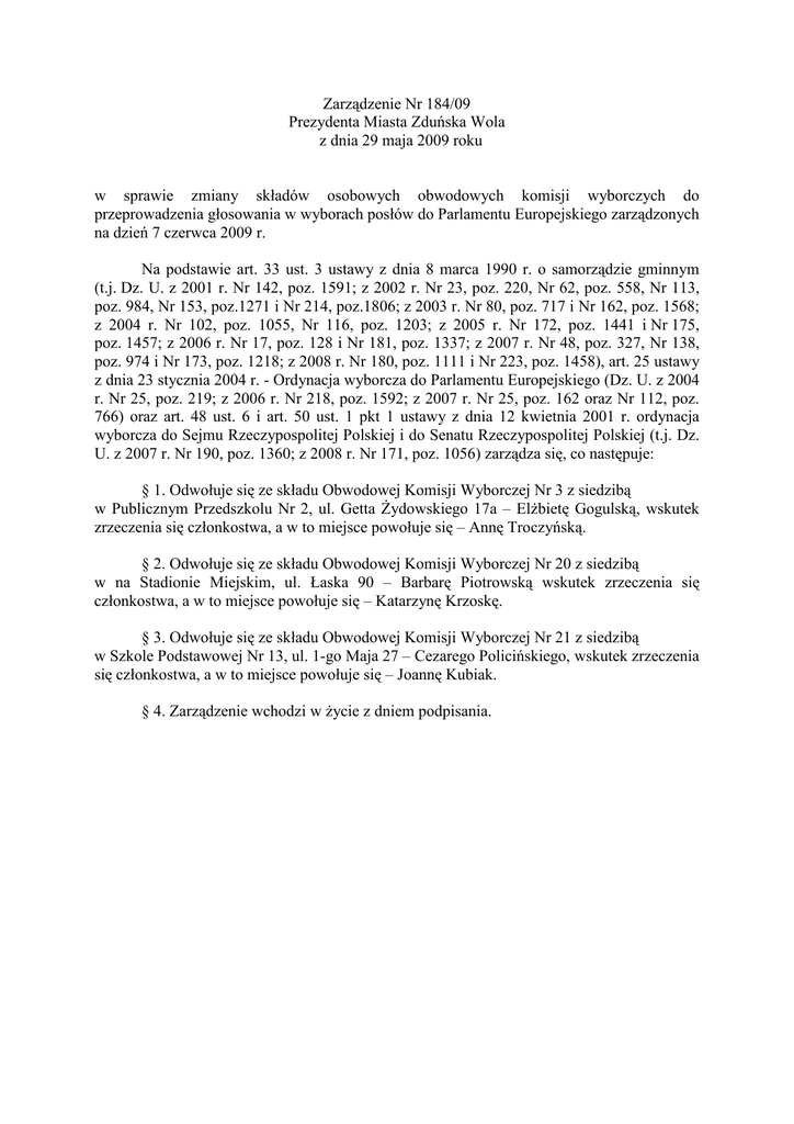 Zarządzenie Nr 184/09 Prezydenta Miasta Zduńska Wola z dnia 29 maja 2009 roku w sprawie zmiany składów osobowych obwodowych komisji wyborczych do przeprowadzenia głosowania w wyborach posłów do Parlamentu Europejskiego zarządzonych na dzień 7 czerwca 2009 r. Na podstawie art. 33 ust. 3 ustawy z dnia 8 marca 1990 r. o samorządzie gminnym (t.j. Dz. U. z 2001 r. Nr 142, poz. 1591; z 2002 r. Nr 23, poz. 220, Nr 62, poz. 558, Nr 113, poz. 984, Nr 153, poz.1271 i Nr 214, poz.1806; z 2003 r. Nr 80, poz. 717 i Nr 162, poz. 1568; z 2004 r. Nr 102, poz. 1055, Nr 116, poz. 1203; z 2005 r. Nr 172, poz. 1441 i Nr 175, poz. 1457; z 2006 r. Nr 17, poz. 128 i Nr 181, poz. 1337; z 2007 r. Nr 48, poz. 327, Nr 138, poz. 974 i Nr 173, poz. 1218; z 2008 r. Nr 180, poz. 1111 i Nr 223, poz. 1458), art. 25 ustawy z dnia 23 stycznia 2004 r. - Ordynacja wyborcza do Parlamentu Europejskiego (Dz. U. z 2004 r. Nr 25, poz. 219; z 2006 r. Nr 218, poz. 1592; z 2007 r. Nr 25, poz. 162 oraz Nr 112, poz. 766) oraz art. 48 ust. 6 i art. 50 ust. 1 pkt 1 ustawy z dnia 12 kwietnia 2001 r. ordynacja wyborcza do Sejmu Rzeczypospolitej Polskiej i do Senatu Rzeczypospolitej Polskiej (t.j. Dz. U. z 2007 r. Nr 190, poz. 1360; z 2008 r. Nr 171, poz. 1056) zarządza się, co następuje: § 1. Odwołuje się ze składu Obwodowej Komisji Wyborczej Nr 3 z siedzibą w Publicznym Przedszkolu Nr 2, ul. Getta śydowskiego 17a – ElŜbietę Gogulską, wskutek zrzeczenia się członkostwa, a w to miejsce powołuje się – Annę Troczyńską. § 2. Odwołuje się ze składu Obwodowej Komisji Wyborczej Nr 20 z siedzibą w na Stadionie Miejskim, ul. Łaska 90 – Barbarę Piotrowską wskutek zrzeczenia się członkostwa, a w to miejsce powołuje się – Katarzynę Krzoskę. § 3. Odwołuje się ze składu Obwodowej Komisji Wyborczej Nr 21 z siedzibą w Szkole Podstawowej Nr 13, ul. 1-go Maja 27 – Cezarego Policińskiego, wskutek zrzeczenia się członkostwa, a w to miejsce powołuje się – Joannę Kubiak. § 4. Zarządzenie wchodzi w Ŝycie z dniem podpisania.