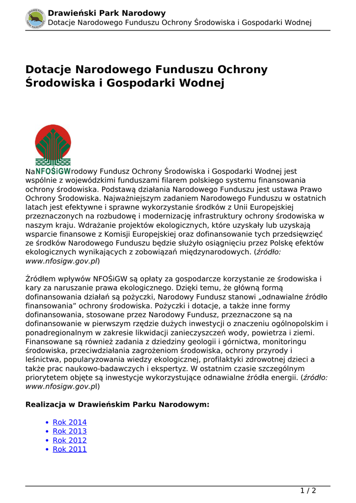 Drawieński Park Narodowy Dotacje Narodowego Funduszu Ochrony Środowiska i Gospodarki Wodnej Dotacje Narodowego Funduszu Ochrony Środowiska i Gospodarki Wodnej rodowy Fundusz Ochrony Środowiska i Gospodarki Wodnej jest Na wspólnie z wojewódzkimi funduszami filarem polskiego systemu finansowania ochrony środowiska. Podstawą działania Narodowego Funduszu jest ustawa Prawo Ochrony Środowiska. Najważniejszym zadaniem Narodowego Funduszu w ostatnich latach jest efektywne i sprawne wykorzystanie środków z Unii Europejskiej przeznaczonych na rozbudowę i modernizację infrastruktury ochrony środowiska w naszym kraju. Wdrażanie projektów ekologicznych, które uzyskały lub uzyskają wsparcie finansowe z Komisji Europejskiej oraz dofinansowanie tych przedsięwzięć ze środków Narodowego Funduszu będzie służyło osiągnięciu przez Polskę efektów ekologicznych wynikających z zobowiązań międzynarodowych. (źródło: www.nfosigw.gov.pl) Źródłem wpływów NFOŚiGW są opłaty za gospodarcze korzystanie ze środowiska i kary za naruszanie prawa ekologicznego. Dzięki temu, że główną formą dofinansowania działań są pożyczki, Narodowy Fundusz stanowi „odnawialne źródło finansowania” ochrony środowiska. Pożyczki i dotacje, a także inne formy dofinansowania, stosowane przez Narodowy Fundusz, przeznaczone są na dofinansowanie w pierwszym rzędzie dużych inwestycji o znaczeniu ogólnopolskim i ponadregionalnym w zakresie likwidacji zanieczyszczeń wody, powietrza i ziemi. Finansowane są również zadania z dziedziny geologii i górnictwa, monitoringu środowiska, przeciwdziałania zagrożeniom środowiska, ochrony przyrody i leśnictwa, popularyzowania wiedzy ekologicznej, profilaktyki zdrowotnej dzieci a także prac naukowo-badawczych i ekspertyz. W ostatnim czasie szczególnym priorytetem objęte są inwestycje wykorzystujące odnawialne źródła energii. (źródło: www.nfosigw.gov.pl) Realizacja w Drawieńskim Parku Narodowym: Rok Rok Rok Rok 2014 2013 2012 2011 1/2 Drawieński Park Narodowy Dotacje Narodowego Funduszu Ochrony Środowiska i Gospodarki Wodnej Rok 2010 Rok 2009 Data wydruku: 08.03.2017 17:09:17 Adres URL: http://dpn.pl/nfosigw 2/2 Powered by TCPDF (www.tcpdf.org)