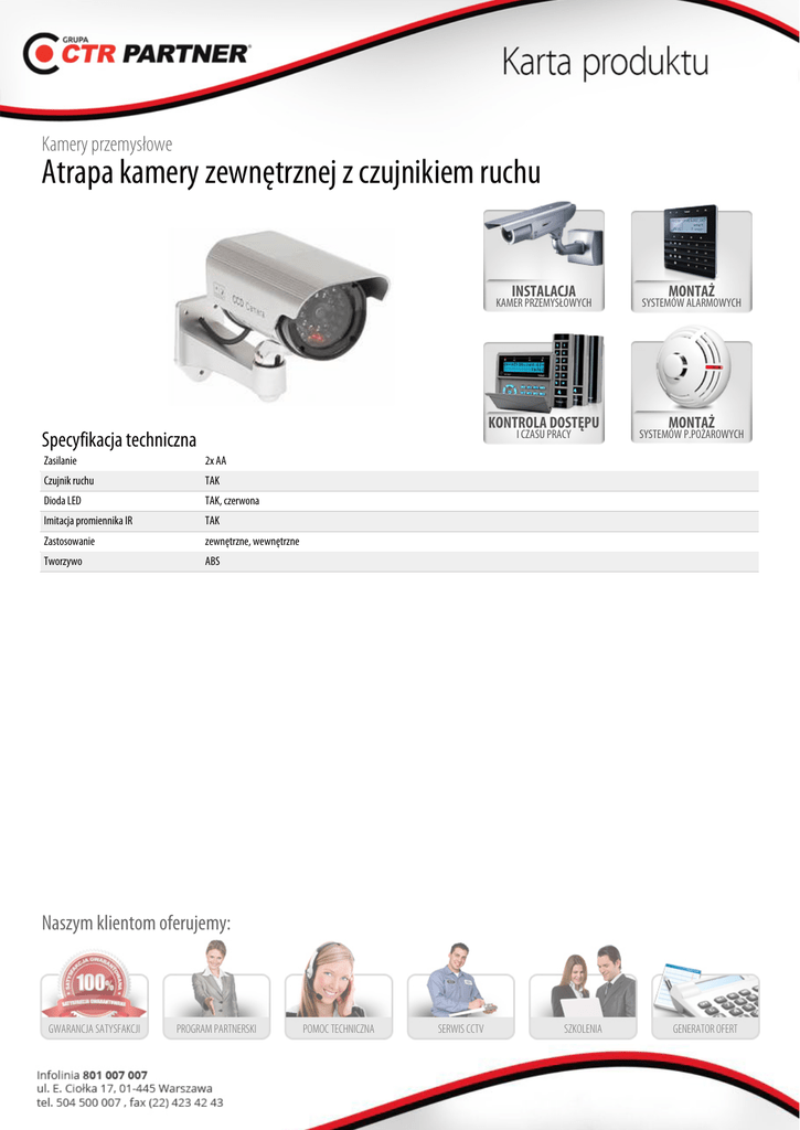 Kamery przemysłowe Atrapa kamery zewnętrznej z czujnikiem ruchu INSTALACJA KAMER PRZEMYSŁOWYCH KONTROLA DOSTĘPU I CZASU PRACY Specyfikacja techniczna Zasilanie 2x AA Czujnik ruchu TAK Dioda LED TAK, czerwona Imitacja promiennika IR TAK Zastosowanie zewnętrzne, wewnętrzne Tworzywo ABS MONTAŻ SYSTEMÓW ALARMOWYCH MONTAŻ SYSTEMÓW P.POŻAROWYCH Naszym klientom oferujemy: GWARANCJA SATYSFAKCJI PROGRAM PARTNERSKI POMOC TECHNICZNA SERWIS CCTV SZKOLENIA GENERATOR OFERT