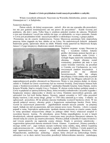 Zamek w Liwie przykładem troski naszych przodków o zabytki. Witam wszystkich zebranych. Nazywam się Weronika Zdzieborska. jestem uczennicą Gimnazjum nr 1 w Sulejówku. Szanowni słuchacze! Patron szkoły, do której uczęszczam , mówił: „Kto nie ma szacunku dla przeszłości, ten nie jest godzien teraźniejszości ani ma prawo do przyszłości”. Każde wczoraj jest podstawą dla dziś i jutra. Tylko bieg w sztafecie pokoleń wiedzie do sukcesu. Wiedzieli o tym nasi dziadowie i uczyli nas miłości do tego, co odchodziło, co wręcz umierało. Zamek w Liwie jest przykładem troski naszych przodków o odchodzące wczoraj, o ginące piękno. Przenieśmy się do czasów średniowiecza. Tereny Mazowsza porośnięte były nieprzebytą puszczą, która ciągnęła się hen, daleko aż na Litwę. Na malowniczych leśnych polanach budowano grody, uprawiano zboże na chleb. Właśnie wtedy panował na Mazowszu Książę Janusz I. Z jego inicjatywy zbudowano zamek obronny w Liwie. Najpierw usypano wyspę. Otoczono ją fosą i wysokimi wałami. Jedynie grobla i drewniany pomost łączyły go z lądem. Od wschodu rzeka Liwiec i rozległe bagna stanowiły naturalną linię obronną. Zamek obronny został wzniesiony, podobnie jak inne w tym czasie twierdze warowne, na przykład w Czersku czy Ciechanowie, na wzór ówczesnych zamków krzyżackich. I ponieważ nie ma zdarzeń bezużytecznych, fakt ten odegra decydującą o losie zamku rolę za ponad pięćset lat. Jan Długosz zaliczał Liw do najprzedniejszych grodów obronnych na Mazowszu. Warto w tym miejscu dodać, że słynny zamek w Trokach na Litwie wzorowany był na warowni liwskiej. Żoną księcia Janusza była znana z Sienkiewiczowskich „Krzyżaków” opiekunka Danuśki księżna Anna Danuta, siostra Księcia Witolda. Stąd te związki Liwa z Trokami. W złotym wieku kultury polskiej zamek w Liwie wypiękniał za sprawą królowej Bony, która twierdzę rozbudowała i uczyniła wygodne i bezpieczne miejsce odpoczynku w drodze na Litwę. Ostatnim niezwykłym gościem, jaki odwiedził Liw był król Stefan Batory. Niestety, najazd szwedzki w 1657 roku przyniósł klęskę warowni, a tak zwany drugi „potop” w 1703 roku zamienił ją w ruinę. I właśnie na zgliszczach przeszłości, 80 lat później starosta Grabianka wystawił barokowy dwór. W ten sposób połączył surowy, obronny gotyk z bogactwem sarmackiego baroku. Dwór, który wyrósł na szacownych piastowsko – jagiellońskich murach niczym jemioła na potężnej topoli. Jednak nie stał się pasożytem, dał tym ruinom nowe życie. Niestety, i dwór z czasem popadł w ruinę. Największe upokorzenie spotkało dumną warownię za czasów caratu, kiedy to ruinę sprzedano miejscowemu chłopu za jednego rubla! Nowy właściciel urządził w rycerskiej baszcie kuźnię. Po odzyskaniu przez Polskę niepodległości, to jest w latach dwudziestych, zabytek upaństwowiono i zniszczone mury przykryto blaszanym całunem, by chronił ruinę do czasów jej zmartwychwstania. Wkrótce jednak wybuchła II wojna światowa i nad Liwem pojawiły się naprawdę czarne chmury. Rządy w powiecie sokołowsko – węgrowskim sprawował starosta niemiecki Ernest Gramss. A ponieważ „Niemcy potrafią z niczego zrobić coś”, jego rozkazu zaczęto rozbierać ruiny zamku, starą, dobrze wypaloną cegłę przeznaczono do …rozbudowy obozy zagłady Żydów w Treblince. I wtedy pojawił się mąż opatrznościowy tego miejsca – młody mieszkaniec pobliskiego Brzozowa, Otto Warpechowski, zamiłowany archeolog – amator, który chwycił się niebywałego fortelu: odważnie i co tu dużo mówić bezczelnie przedłożył hitlerowskiemu staroście zaskakującą ofertę… odbudowy zamku. Przekonał starostę, że bryła zamku jest nawiązaniem do architektury krzyżackiej, a zatem Liw był siedzibą Zakonu, więc świadczy to o panowaniu na tym terenie odwiecznej kultury germańskiej. Zamek należy więc odbudować jako pomnik chwały narodu niemieckiego. Ernest Grass dał się przekonać i pomysłodawcy powierzył nadzór nad odbudową. Cegłę i dachówkę Niemcy przywieźli z rozebranej bożnicy, a resztę materiałów kupowano za obowiązkowy kontyngent dostarczany z zakładów w Sokołowie Podlaskim , to jest alkohol i cukier. Kiedy prace nabrały rumieńców, Gramss postanowił pochwalić się swoją inicjatywą na rzecz ochrony kultury germańskiej i zawiadomił o tym Berlin. Pewnie liczył na awans. Jednak historycy niemieccy szybko zweryfikowali paranaukowe argumenty Otto Warpechowskiego i… wtedy weszła już do Polski Armia Czerwona. Warpechowski wstąpił do I Armii Wojska Polskiego i zginął na froncie 5 lutego 1945 roku. Jego dzieło nie poszło na marne, dalszymi losami zamku i dworu zajęli się kolejni miłośnicy zabytków z Węgrowa: Jan Klemm, Eugeniusz Leszczyński i Marian Jakubik. W latach 1955 – 1957 przeprowadzono prace wykopaliskowe i badawcze, a następnie odbudowę obiektu. W barokowym dworze starosty Grabianki urządzono muzeum – zbrojownię , nawiązując do obronnego charakteru budowli. Zbiory broni białej są największe w Polsce. Do niewątpliwie cennych osiągnięć muzeum należy odkrycie XVIII wiecznej galerii pałacowej portretów sarmackich dwóch rodów: Ossolińskich i Załuskich. Pracownicy muzeum znaleźli je na strychu zdewastowanego dworu w Sterdyni. Jak widać, pomysł starosty Grabianki sprzed dwustu lat okazał się trafny i mimo przewalających się nad krajem burz dziejowych zaowocował piękną inicjatywą miłośników pamiątek historii. Dwór barokowy, który wyrósł na murach gotyckiej warowni stał się strażnicą narodowych pamiątek. Literatura podmiotu: Zenon Żyburtowicz, Krystyna Siemiatycka „Szlacheckie gniazda”, Wyd. ALFA, Warszawa 1996 Opieka merytoryczna nad uczennicą: Krystyna Pachnik, Zespół Szkół nr 1 w Sulejówku