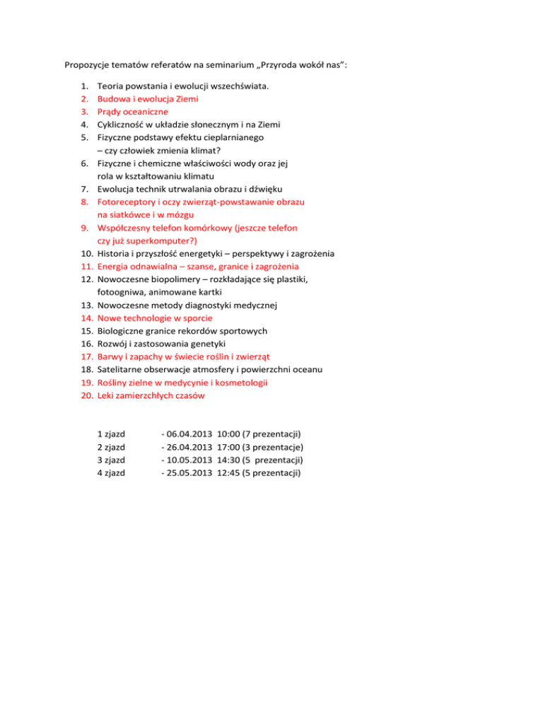 Propozycje tematów referatów na seminarium „Przyroda wokół nas